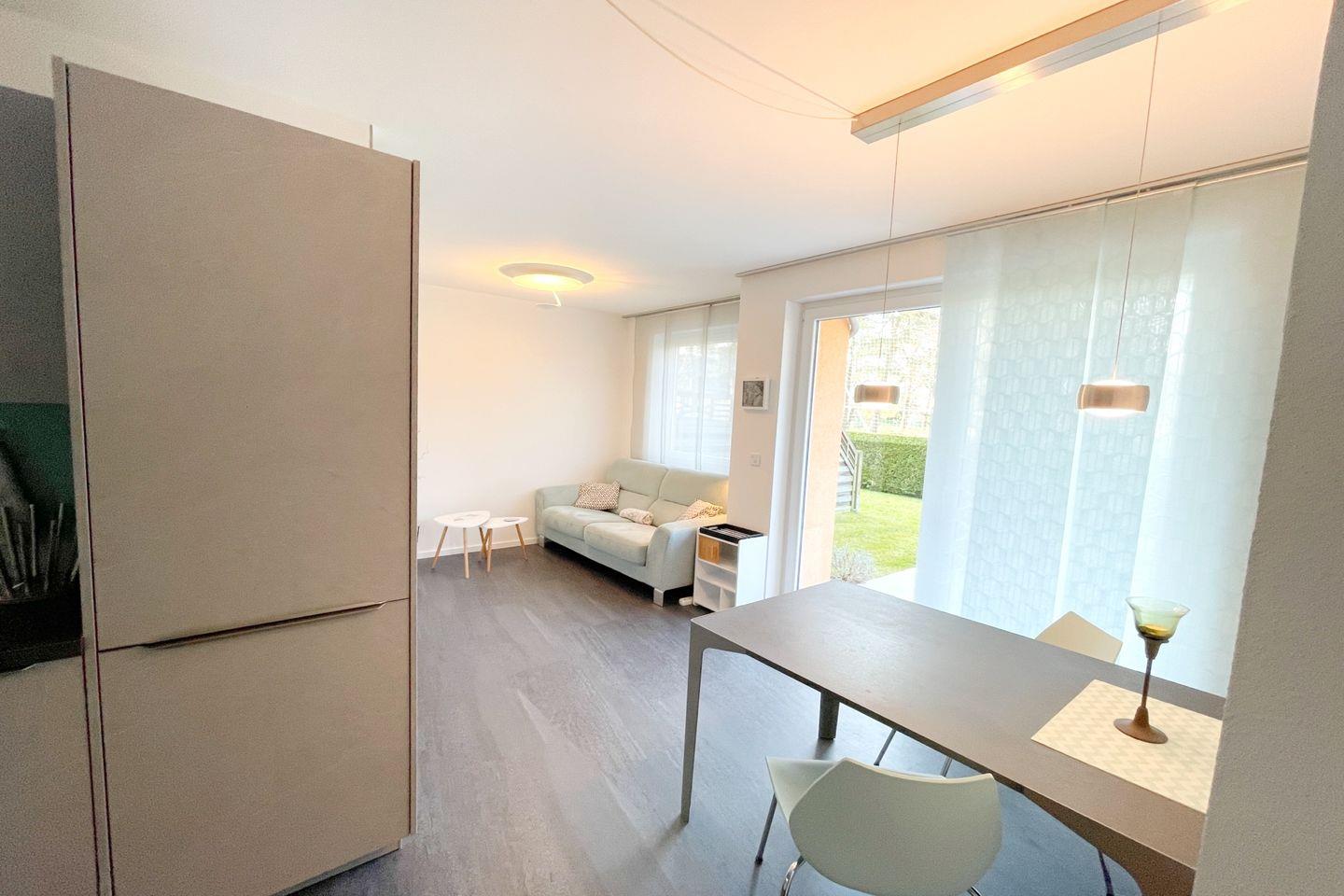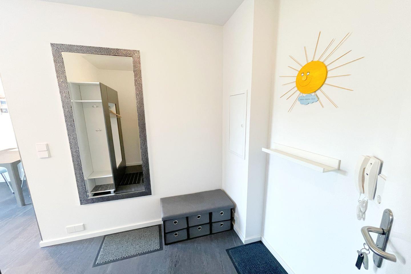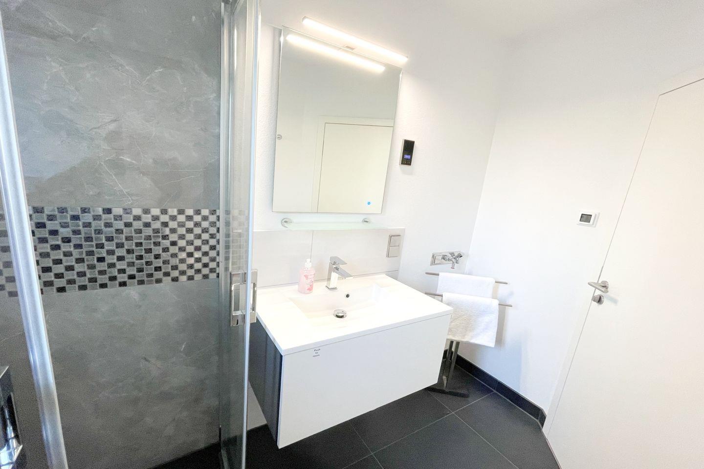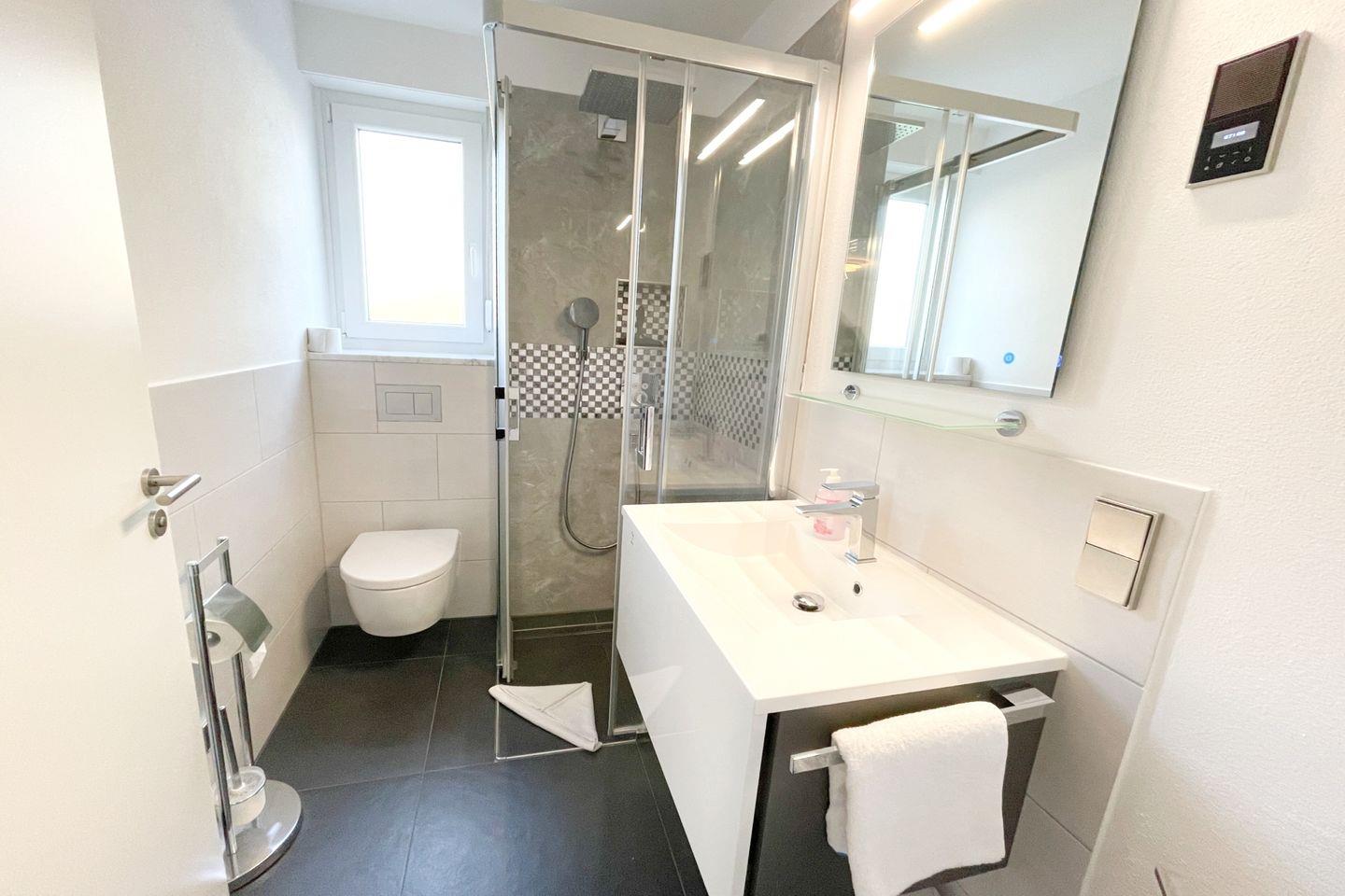 Das gut ausgestattete Badezimmer verfügt über eine bodengleiche Dusche, ein Waschbecken und ein WC. Die große Fensterfront im offenen Wohnbereich sorgt für ausreichend Tageslicht und eine angenehme Belüftung. Für Ihre Sicherheit sind Rauch- und Feuermelder installiert. Zudem ist die gesamte Wohnung eine Nichtraucherunterkunft, was eine frische und gesunde Umgebung gewährleistet.