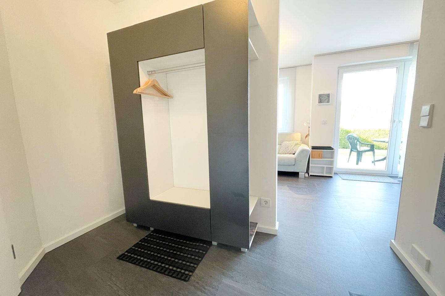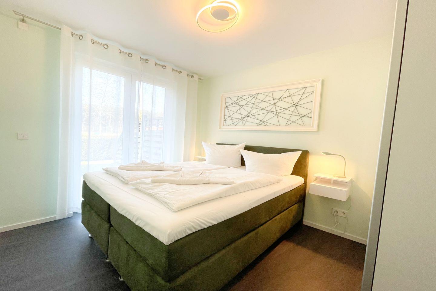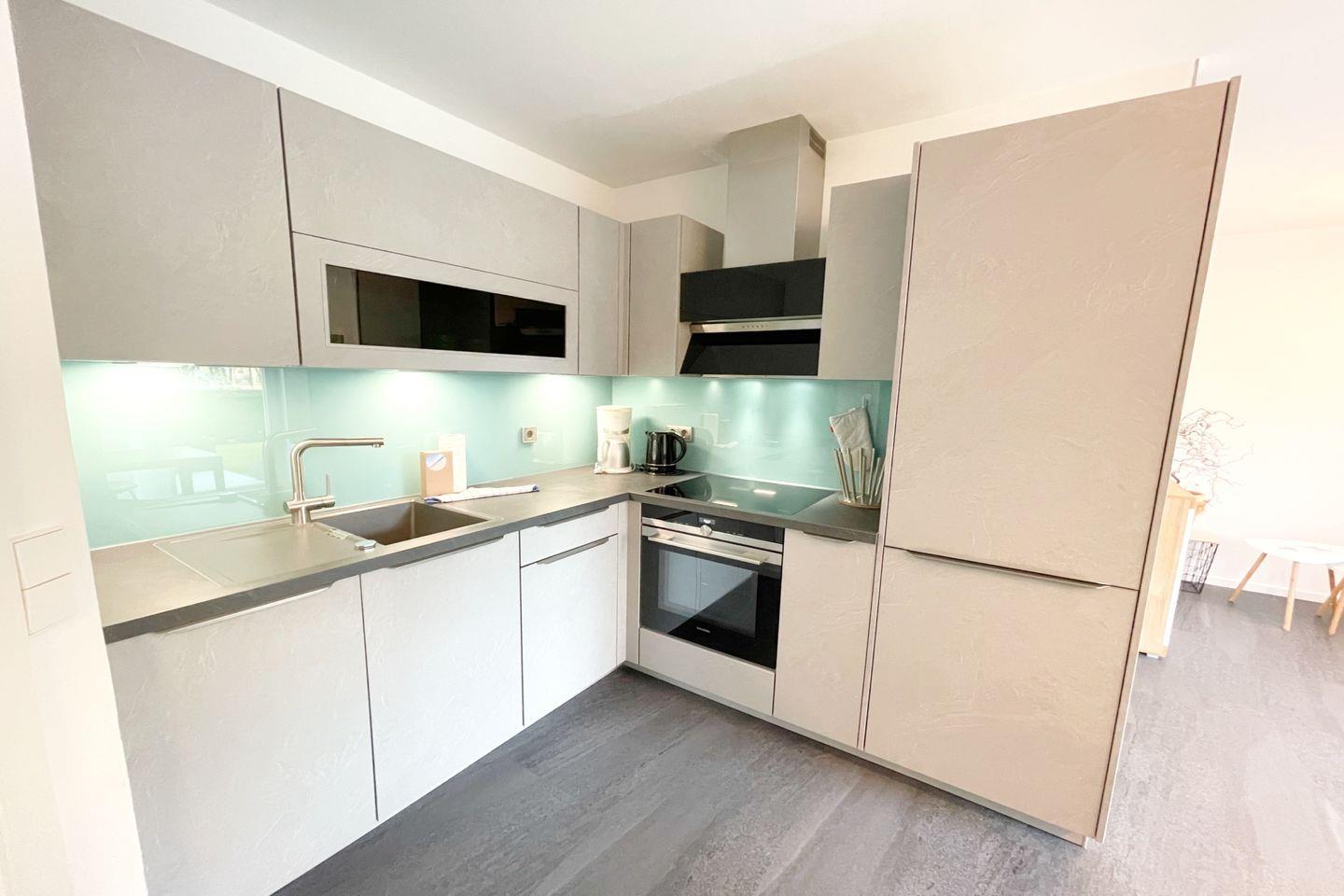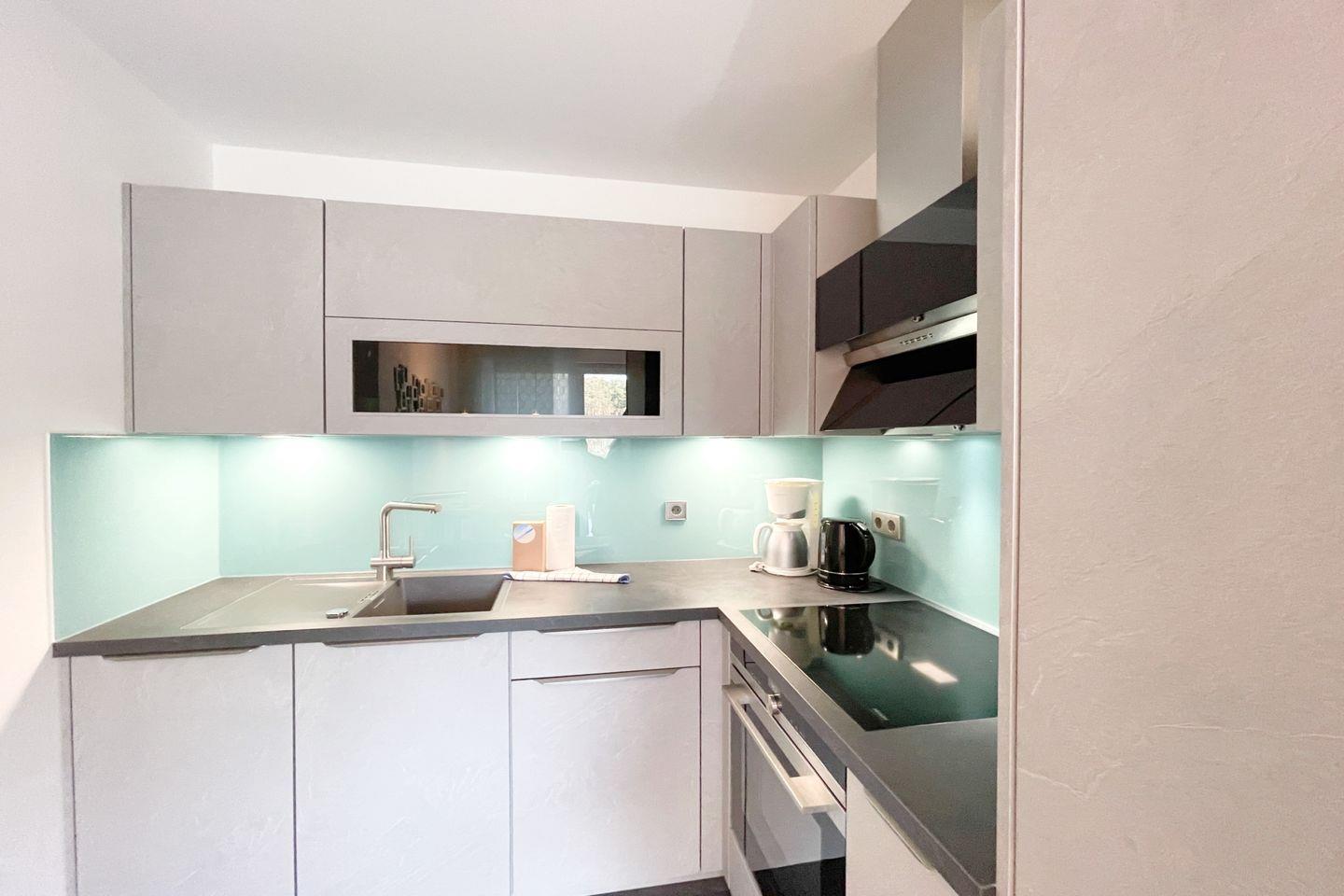 Das gut ausgestattete Badezimmer verfügt über eine bodengleiche Dusche, ein Waschbecken und ein WC. Die große Fensterfront im offenen Wohnbereich sorgt für ausreichend Tageslicht und eine angenehme Belüftung. Für Ihre Sicherheit sind Rauch- und Feuermelder installiert. Zudem ist die gesamte Wohnung eine Nichtraucherunterkunft, was eine frische und gesunde Umgebung gewährleistet.