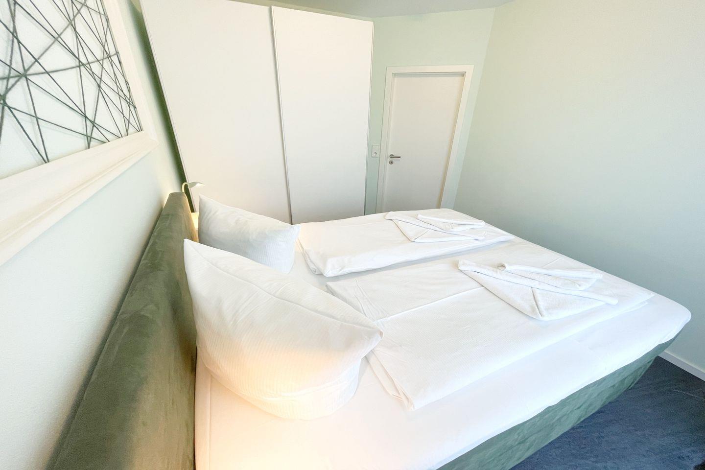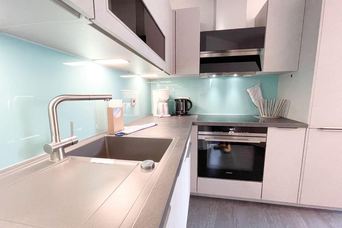 Die Wohnung verfügt über ein gemütliches Schlafzimmer mit einem komfortablen Doppelbett. Das helle und offene Wohnkonzept schafft eine freundliche Atmosphäre. Genießen Sie die Zeit mit Ihren Liebsten in der Sofaecke oder am Esstisch, wo Sie gemeinsame Mahlzeiten zubereiten können. Die hochwertige Küche ist mit allen notwendigen Annehmlichkeiten ausgestattet, einschließlich eines Cerankochfelds, Backofens, Kühlschrank mit Gefrierfach, Geschirrspüler und einer Kaffeemaschine. Dies macht das Kochen für sich selbst zu einem wahren Vergnügen.