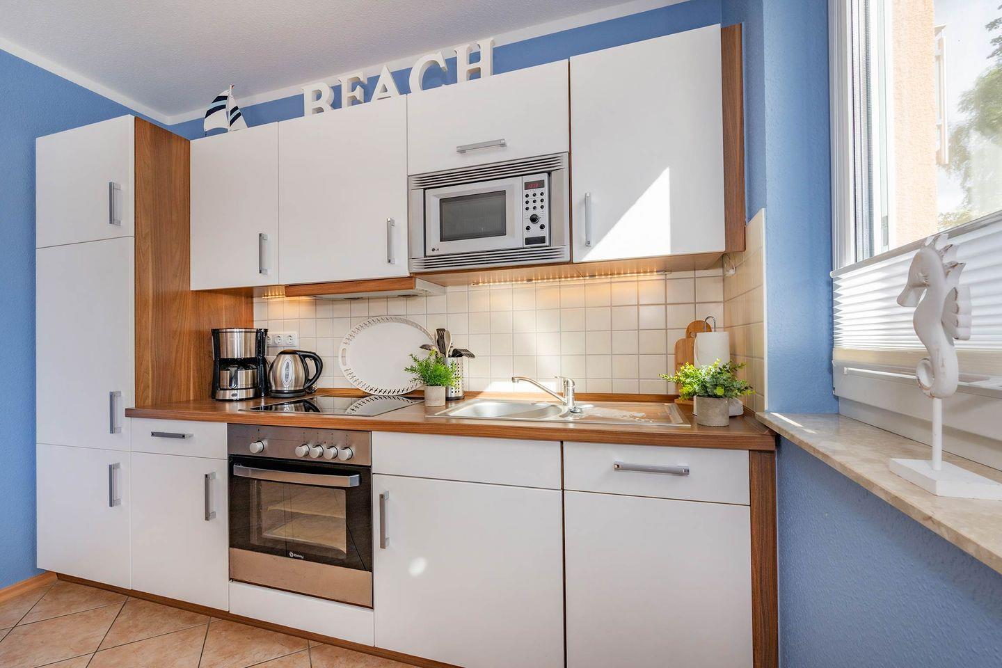 Der Wohn- und Essbereich ist offen gestaltet und wird durch eine moderne Küche ergänzt, die mit Ceranfeld, Backofen, Geschirrspüler, Mikrowelle und allen wichtigen Utensilien ausgestattet ist. Hier lassen sich vom schnellen Frühstück bis zum aufwendigen Abendessen alle Mahlzeiten bequem zubereiten. Ein Esstisch bietet Platz für gemeinsame Runden, während die gemütliche Sitzecke mit Flat-TV zum Entspannen einlädt. Dank Fußbodenheizung, geschmackvoller Dekoration und hochwertigen Möbeln entsteht ein warmes Wohngefühl, das auch in der kühleren Jahreszeit für Wohlbehagen sorgt.