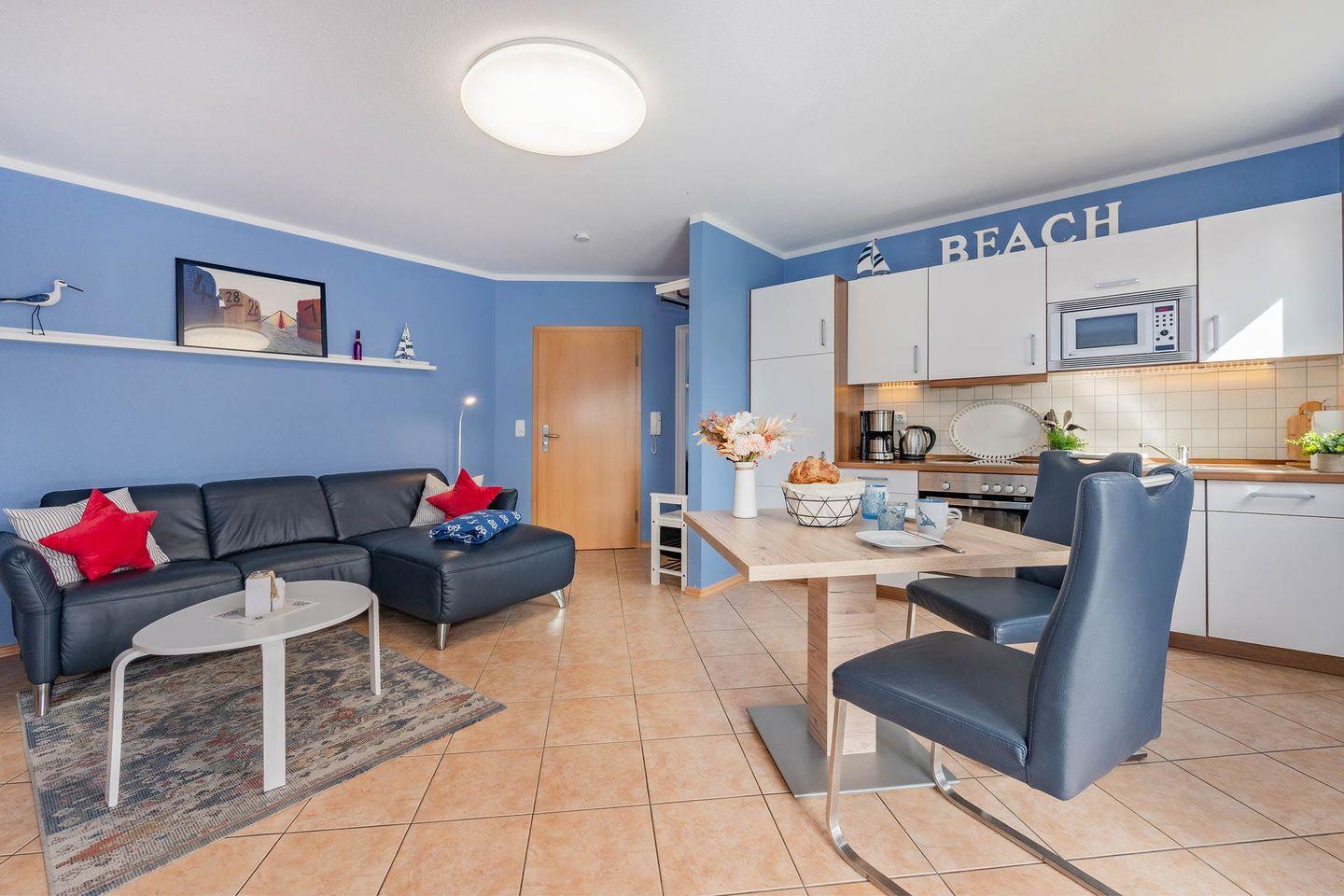 Von der Wohnung aus gelangen Gäste direkt auf die sonnige Südwest-Terrasse, die mit komfortabler Bestuhlung und einem Strandkorb ausgestattet ist. Hier lässt sich die frische Ostseeluft in vollen Zügen genießen – sei es bei einer Tasse Kaffee am Morgen oder einem Glas Wein am Abend, wenn die Sonne langsam untergeht.
