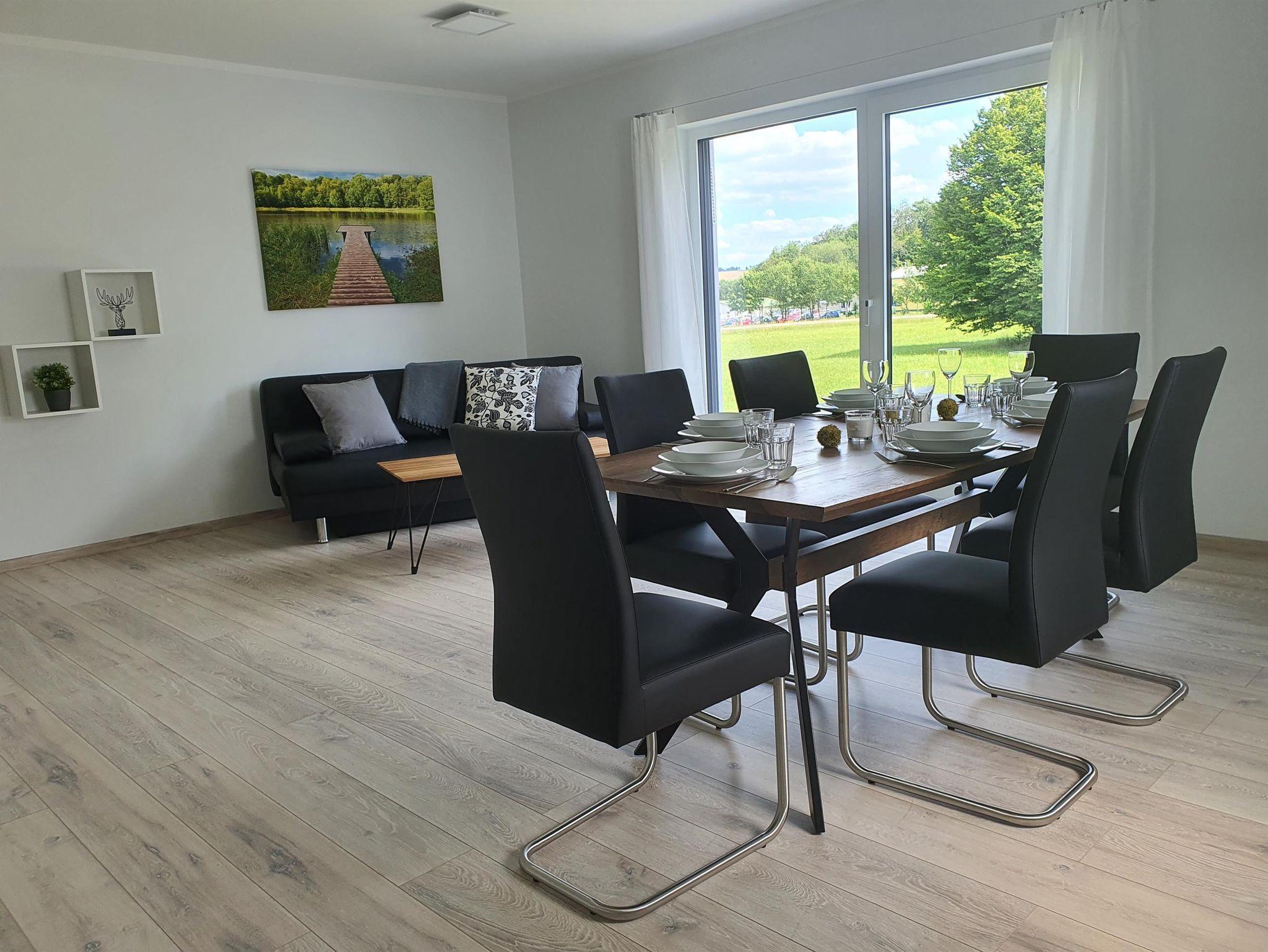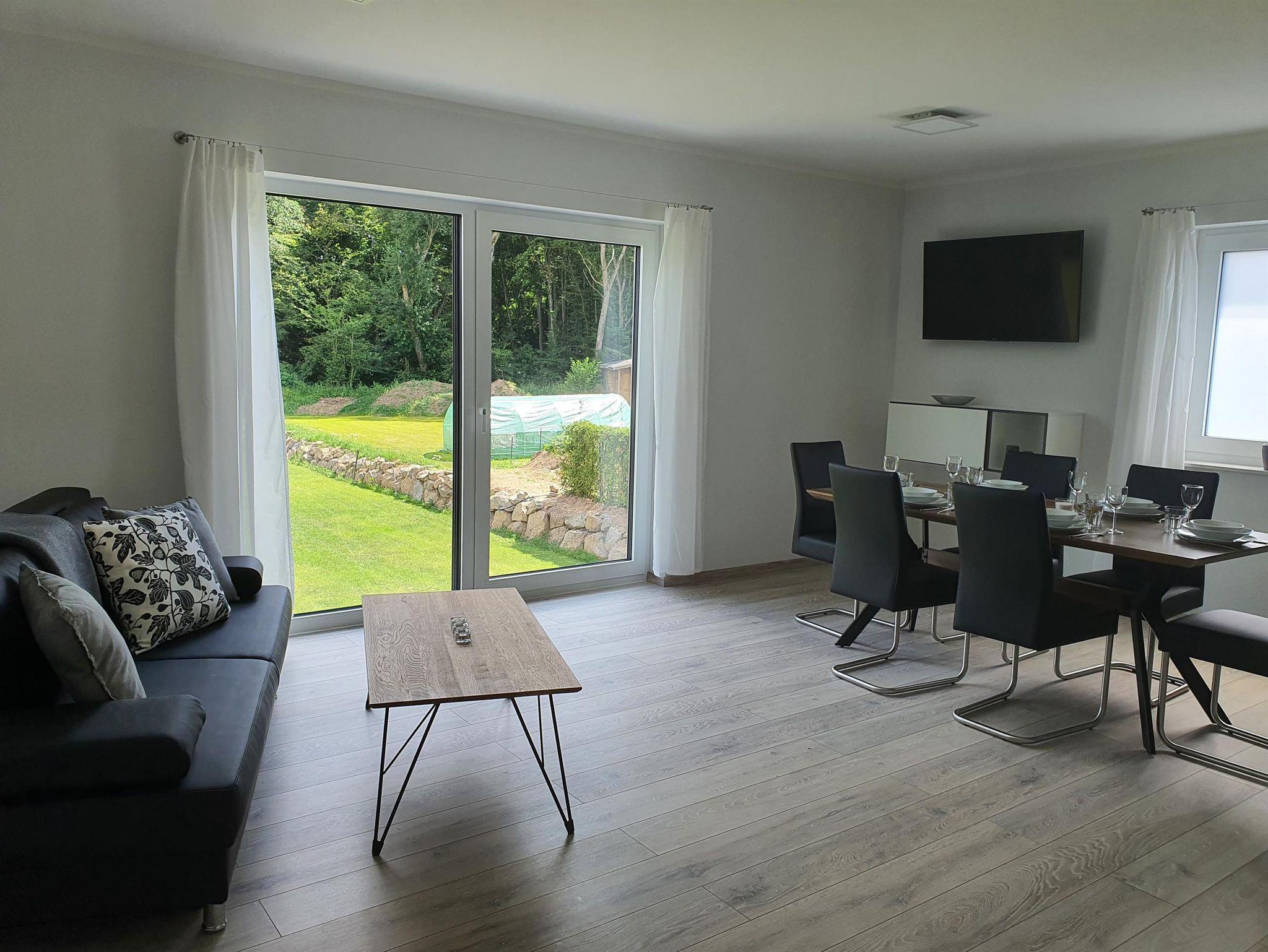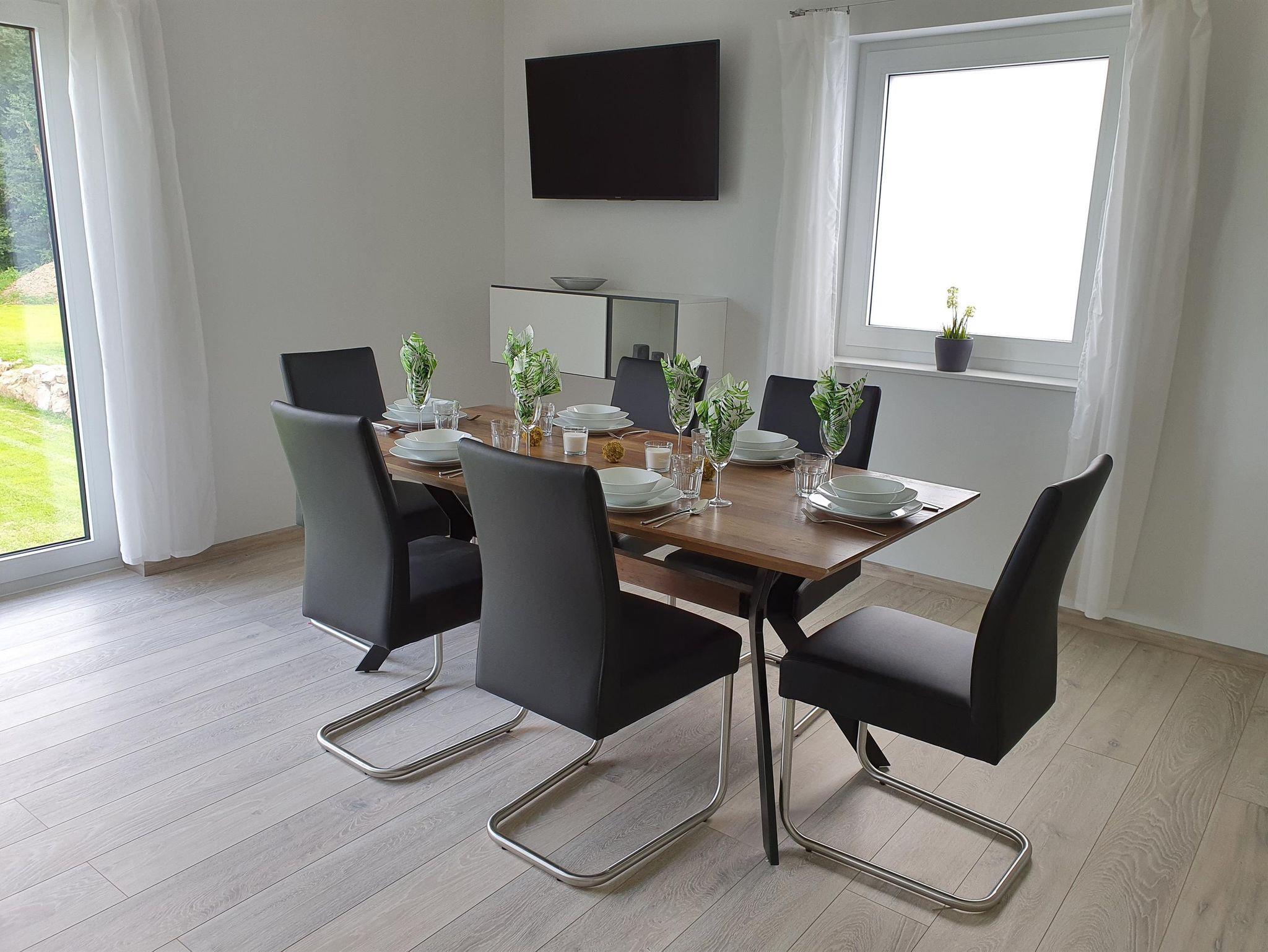 • einem geräumigen Wohn-/Esszimmer mit Platz für 4 Personen, eingerichtet mit einem großen Fernseher (SatFarb TV inkl. Netflix), Panoramafenster Südseite mit herrlichem Ausblick
