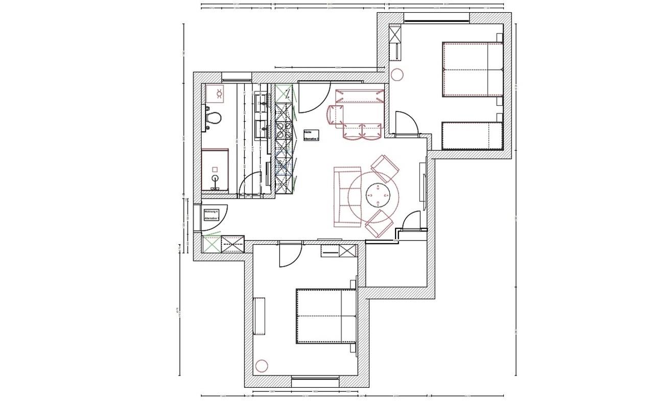 - ein Wohnzimmer mit Sofa, TV und Essplatz