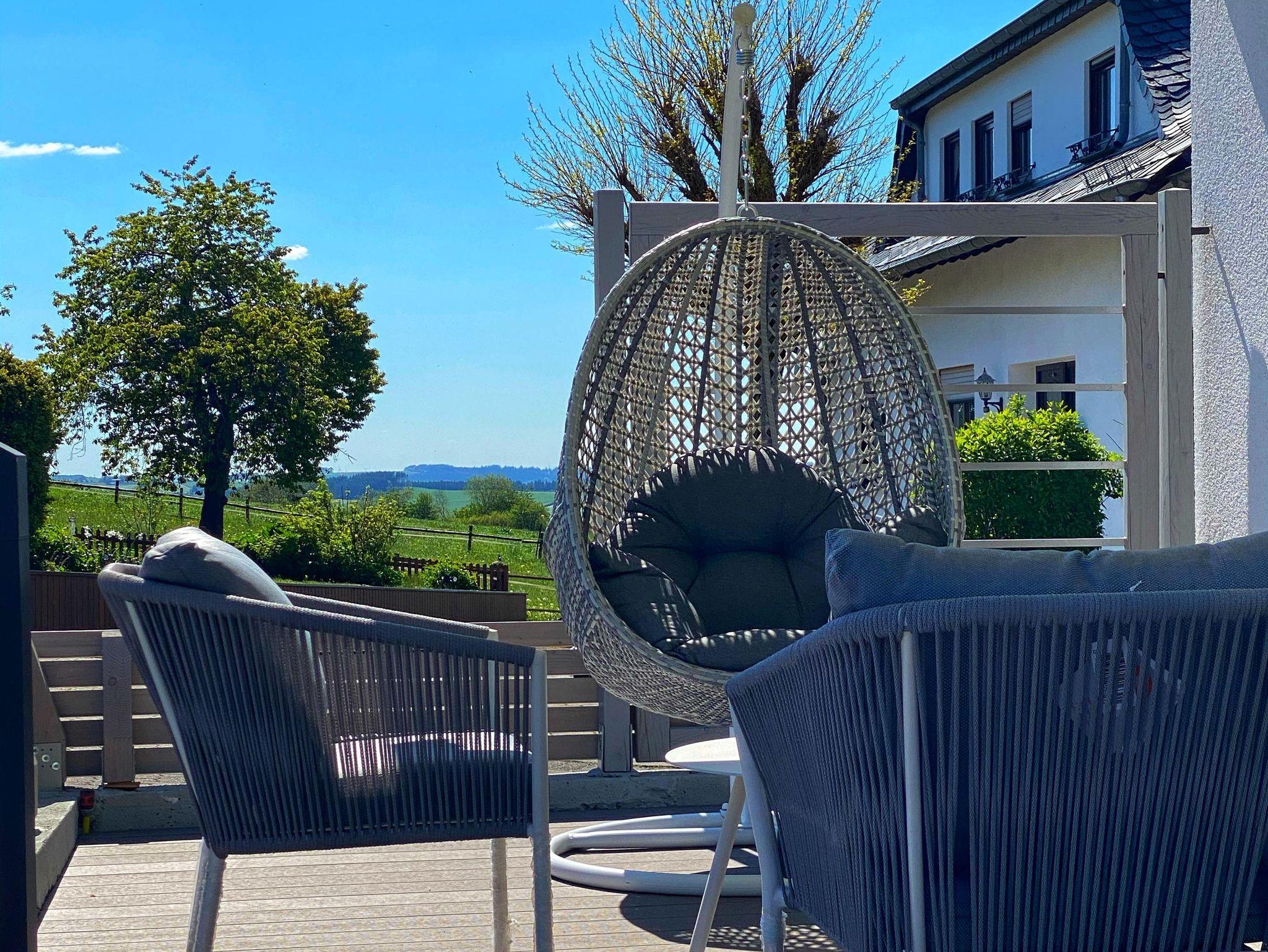 Auf unserer Terrasse finden Sie wunderschöne Lounge-Möbel, die zum Entspannen und Verweilen einladen. Genießen Sie die frische Luft und den herrlichen Ausblick auf die umliegende Natur. Zudem bieten wir Ihnen zwei elektrische Markisen, die Ihnen Schutz vor Sonne bieten.
