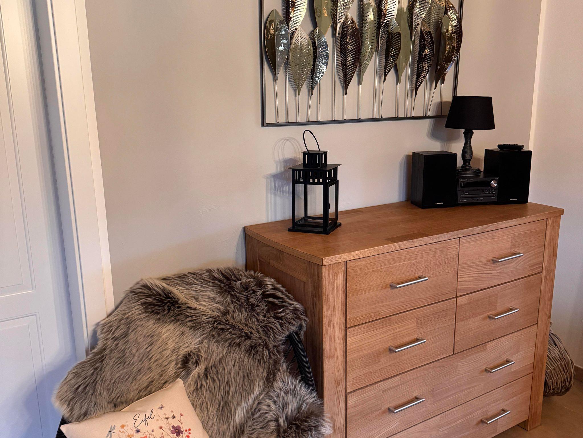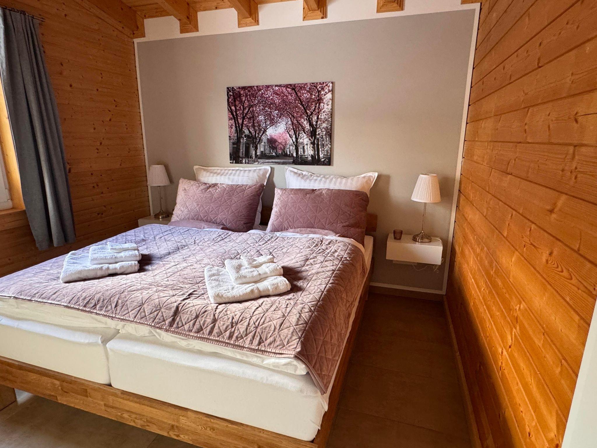 Das EifelChalet verfügt über 2 Schlafzimmer: Das größere Kirschblüten-Schlafzimmer mit Doppelbett (180 cm x 200 cm) und ohne TV und das kleinere Kuschel-Schlafzimmer mit Doppelbett (180 cm x 190 cm) und mit TV.