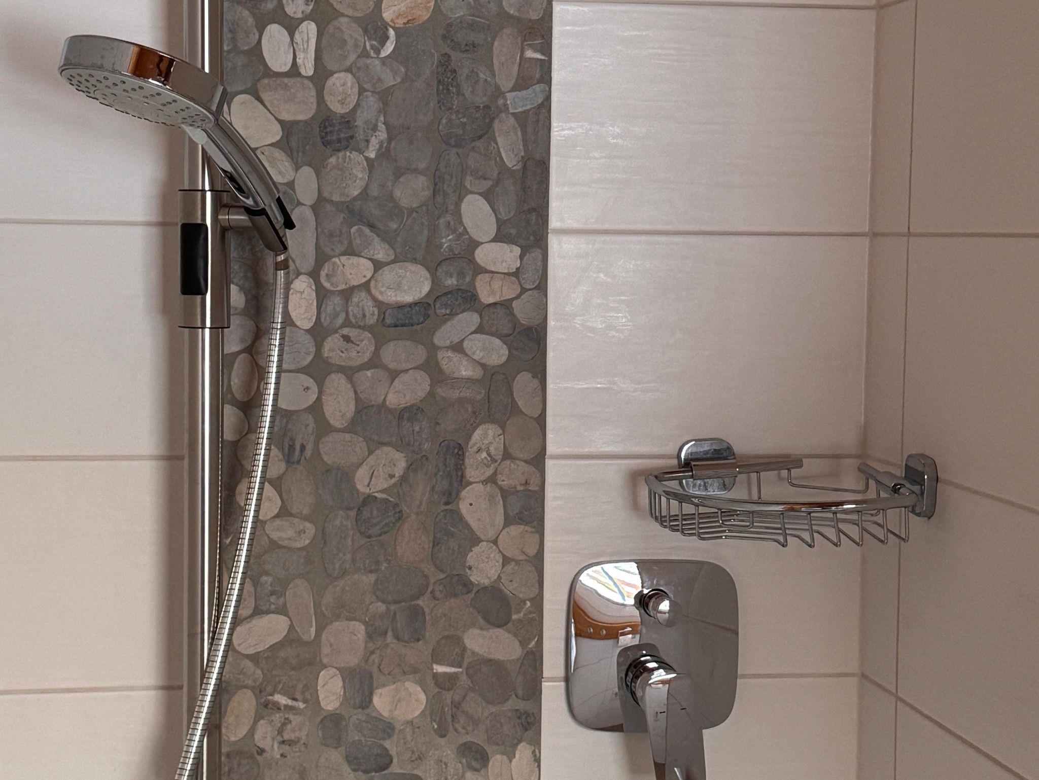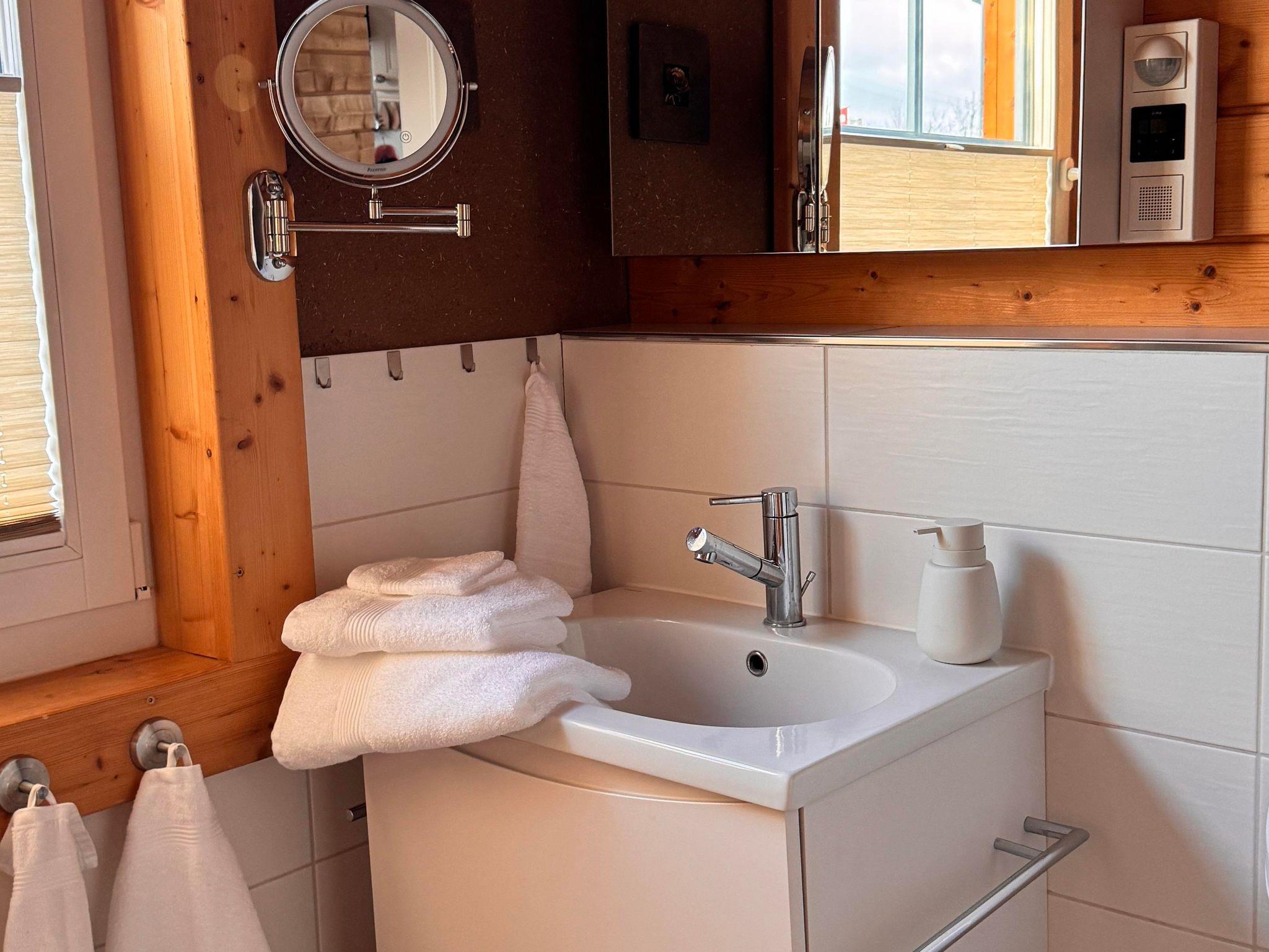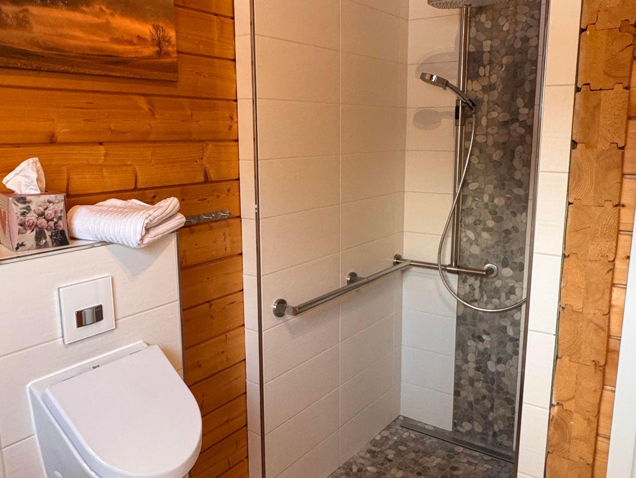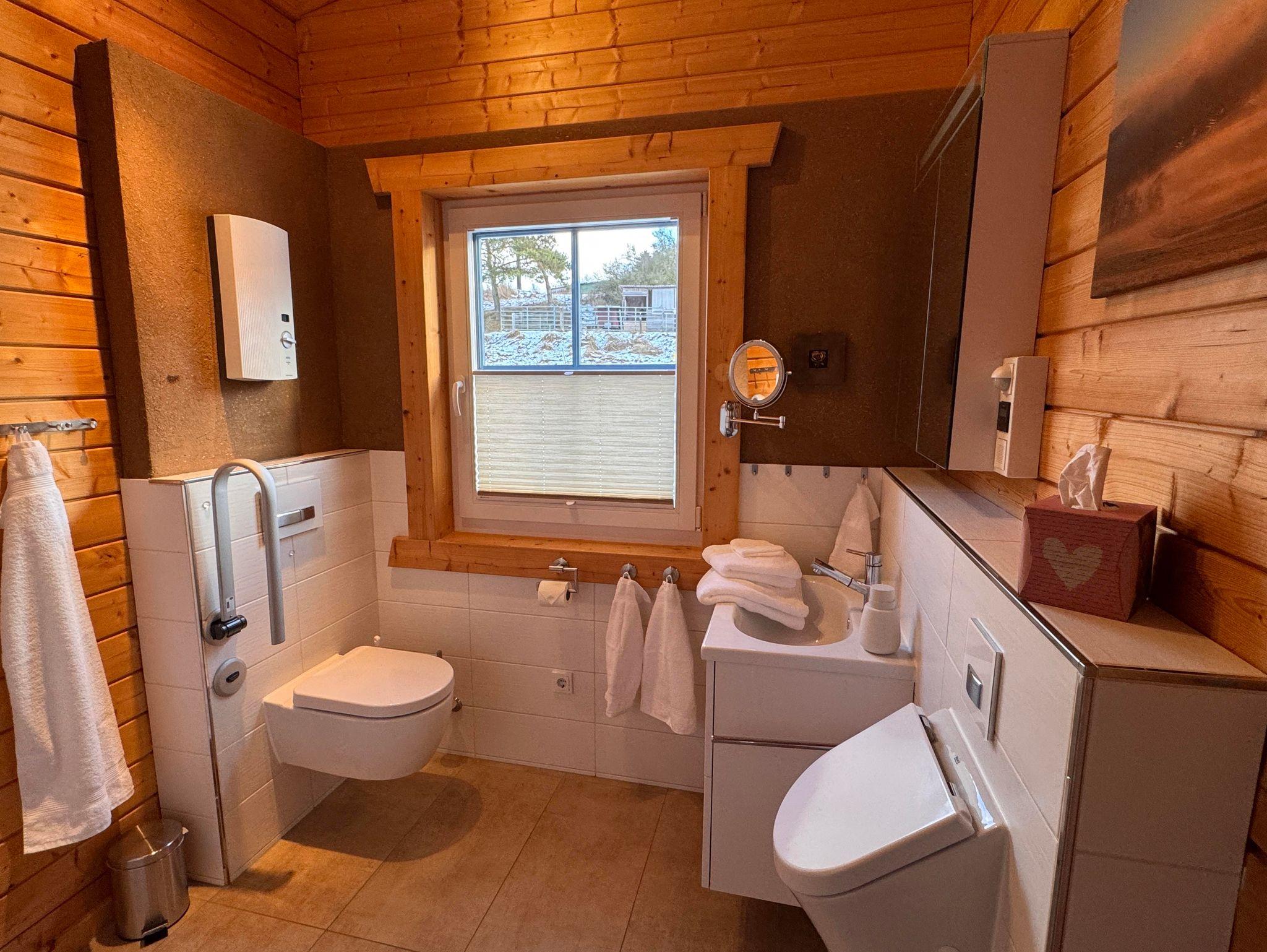 Das Badezimmer verfügt über eine ebenerdige Dusche mit zusätzlicher Regendusche, Haltegriffen und klappbarer Sitzgelegenheit in der Dusche, sowie über WC und Urinal, Waschtisch, Radio und beleuchtetem Spiegelschrank. Schminkspiegel und ein Fön stehen ebenfalls zur Verfügung.