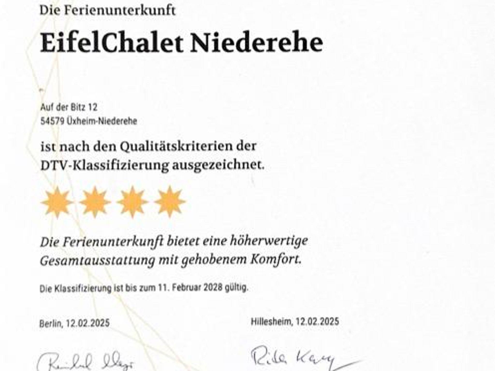 Wir freuen uns sehr, dass wir für unser „EifelChalet Niederehe“ vom Deutschen Tourismusverband im Februar 2025 mit 4 Sternen ausgezeichnet worden sind!