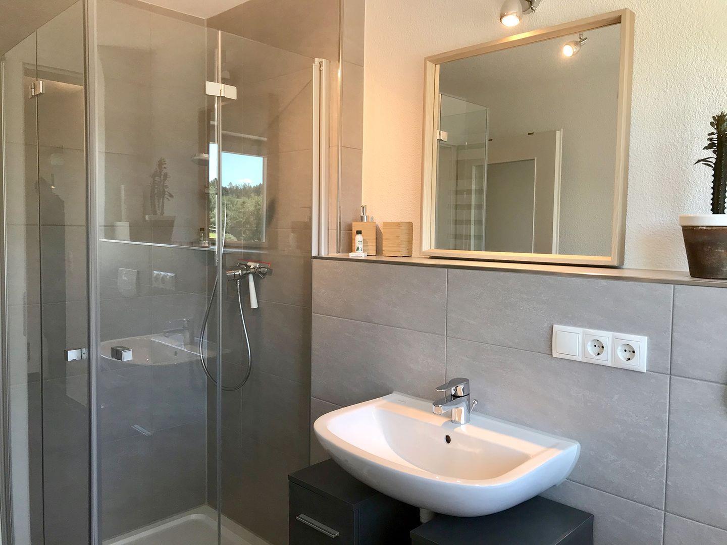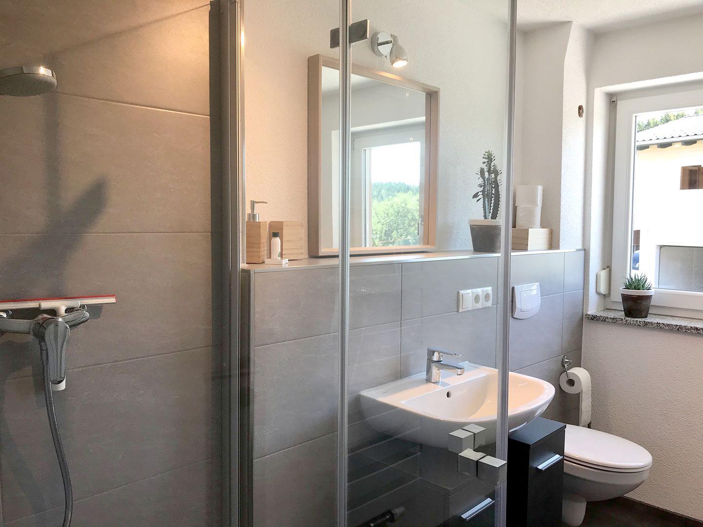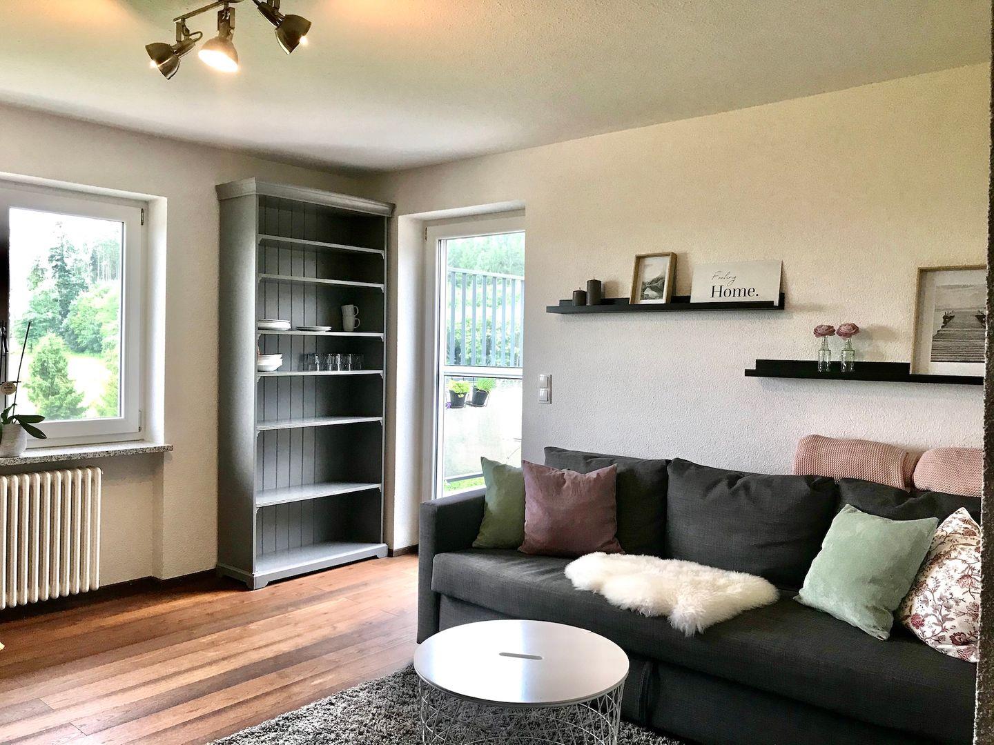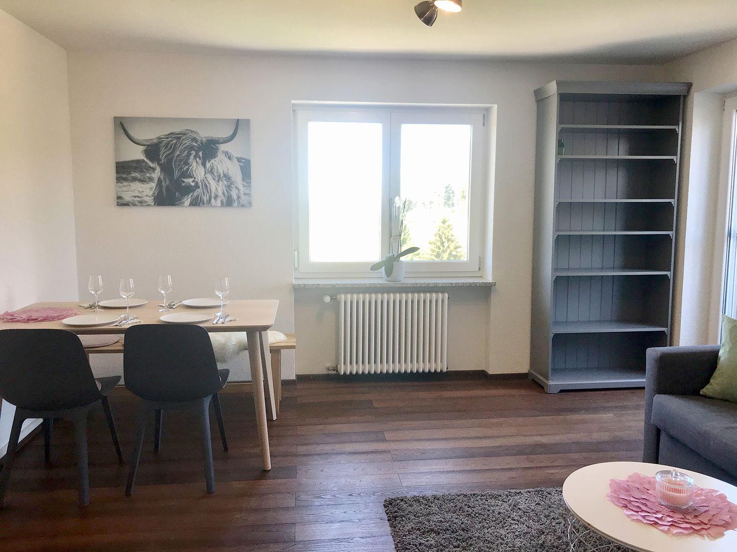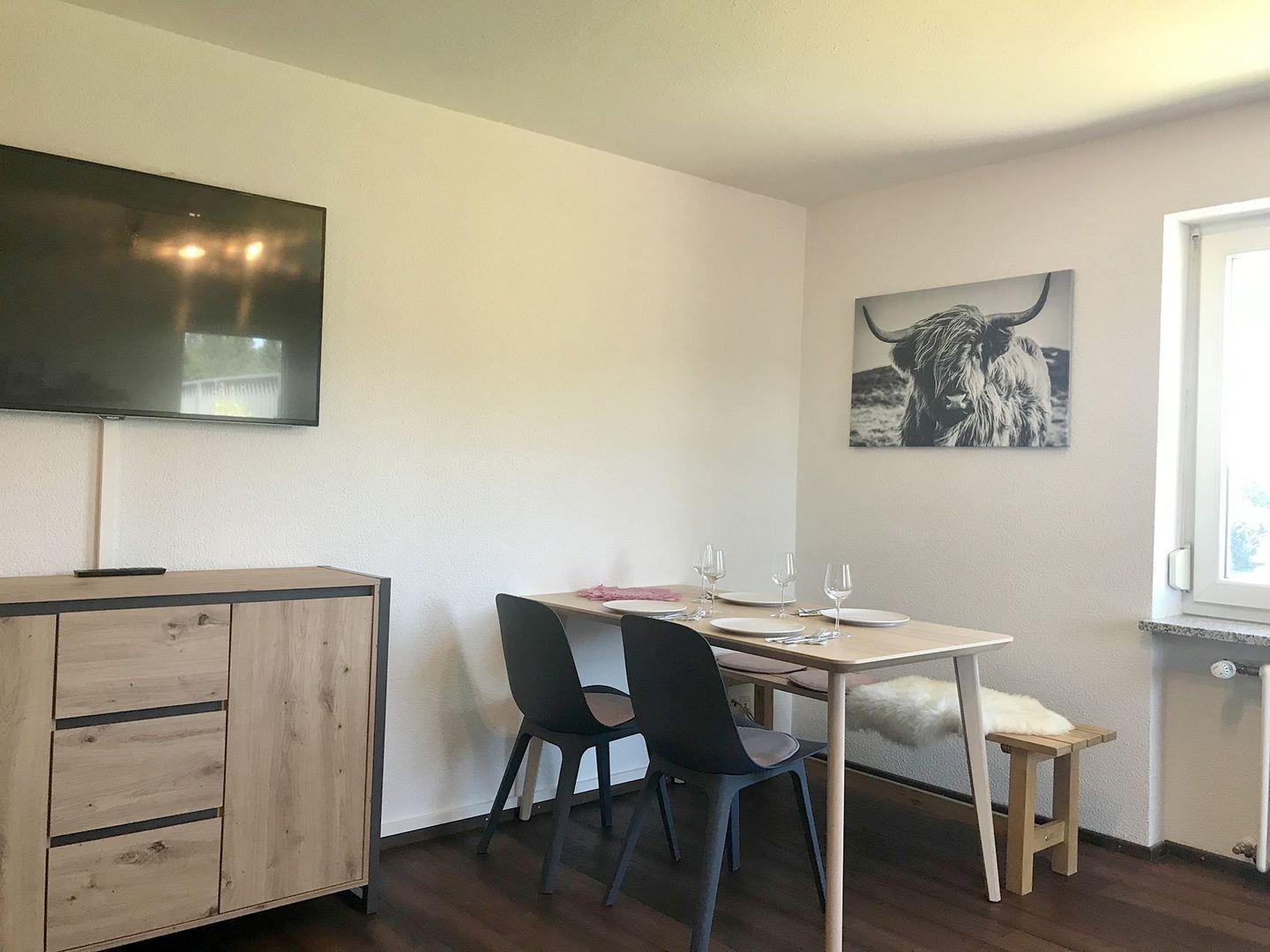 Die neu ausgebaute Ferienwohnung im 1. OG bietet auf ca. 55 m² modernen Komfort und überzeugt mit einem großzügigen Balkon sowie einem eigenen Stellplatz. Dank großer Panoramafenster genießen Sie eine fantastische Aussicht auf die ländliche Umgebung.