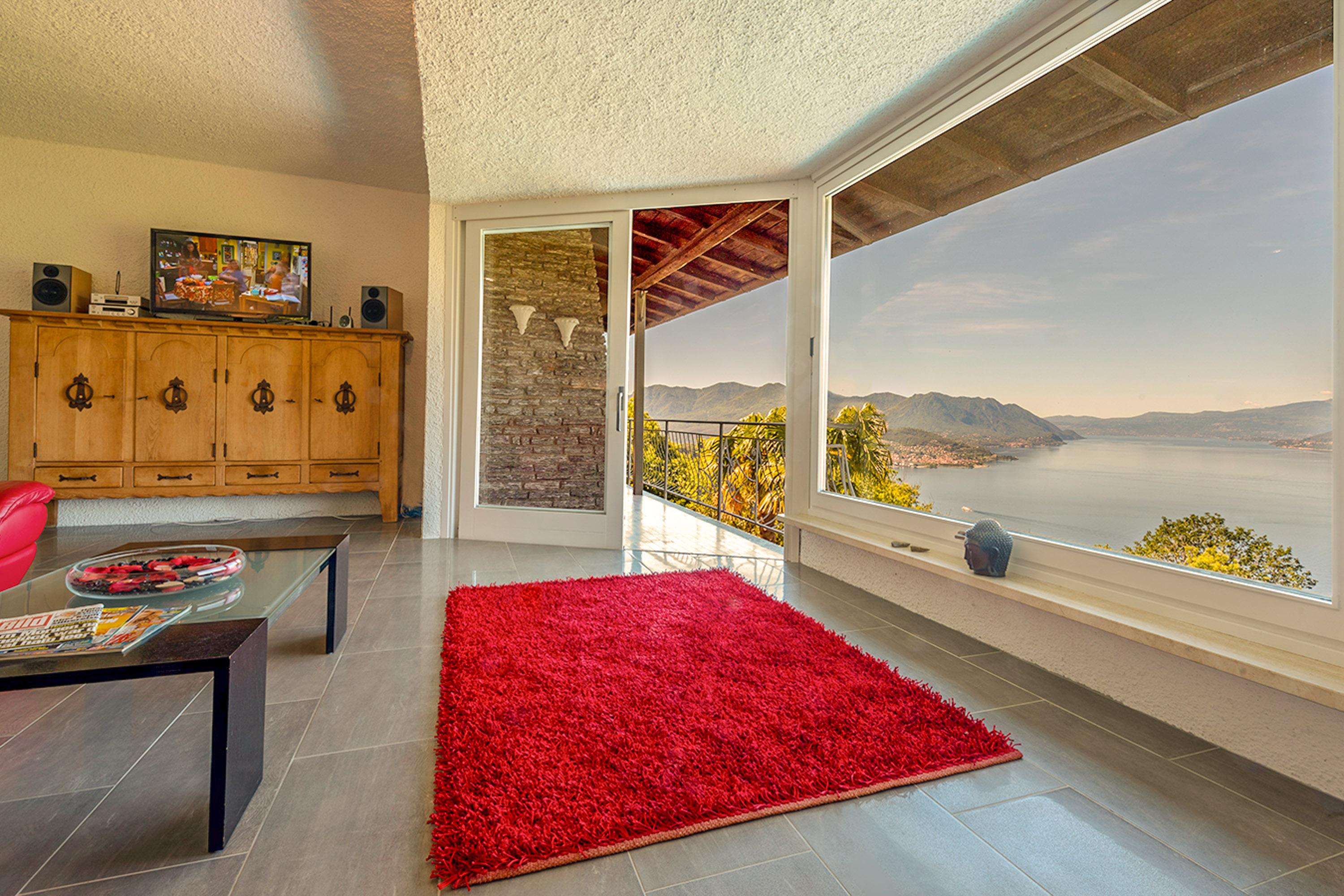 Die ebenerdige Wohnung erstreckt sich über 95 Quadratmeter und bietet zwei Schlafzimmer mit Doppelbett und Kleiderschrank, sowie zwei Duschbäder, von denen eines etwas kleiner ist. Die Küche, der Wohn- und Essbereich sind großzügig gestaltet und laden zum Verweilen ein. Das große Panoramafenster im Wohnzimmer und der Kamin mit Thermostat und Gas-Heizung, deren Kosten in der Heizperiode im Mietpreis inbegriffen sind, sorgen für gemütliche Stunden mit traumhaftem Ausblick. Genießen Sie eine Tasse Kaffee aus dem Saeco Kaffee-Vollautomat auf den bequemen Ledersofas des hochwertig eingerichteten Wohnzimmers. Vom großen Balkon aus liegt der See ausgebreitet vor Ihnen, und der schöne Außen-Kamin lädt zum Grillen ein. Der große Sitz- und Liegebereich um den Gemeinschaftspool lädt zum Relaxen und Verweilen ein. Diese Wohnung ist ideal für Singles, Paare und Familien mit großen Kindern geeignet und verspricht eine unvergesslich schöne Zeit am Lago Maggiore.