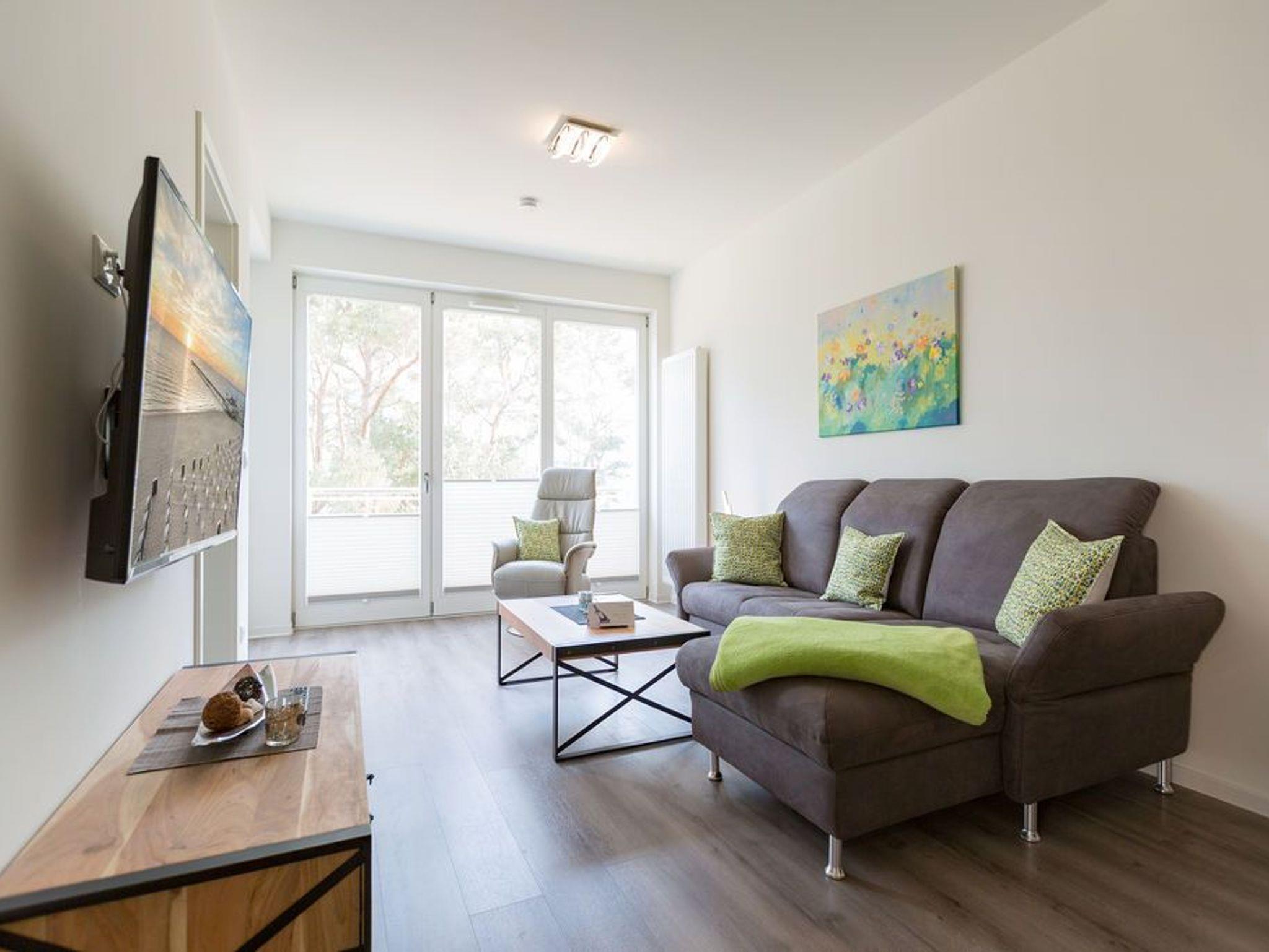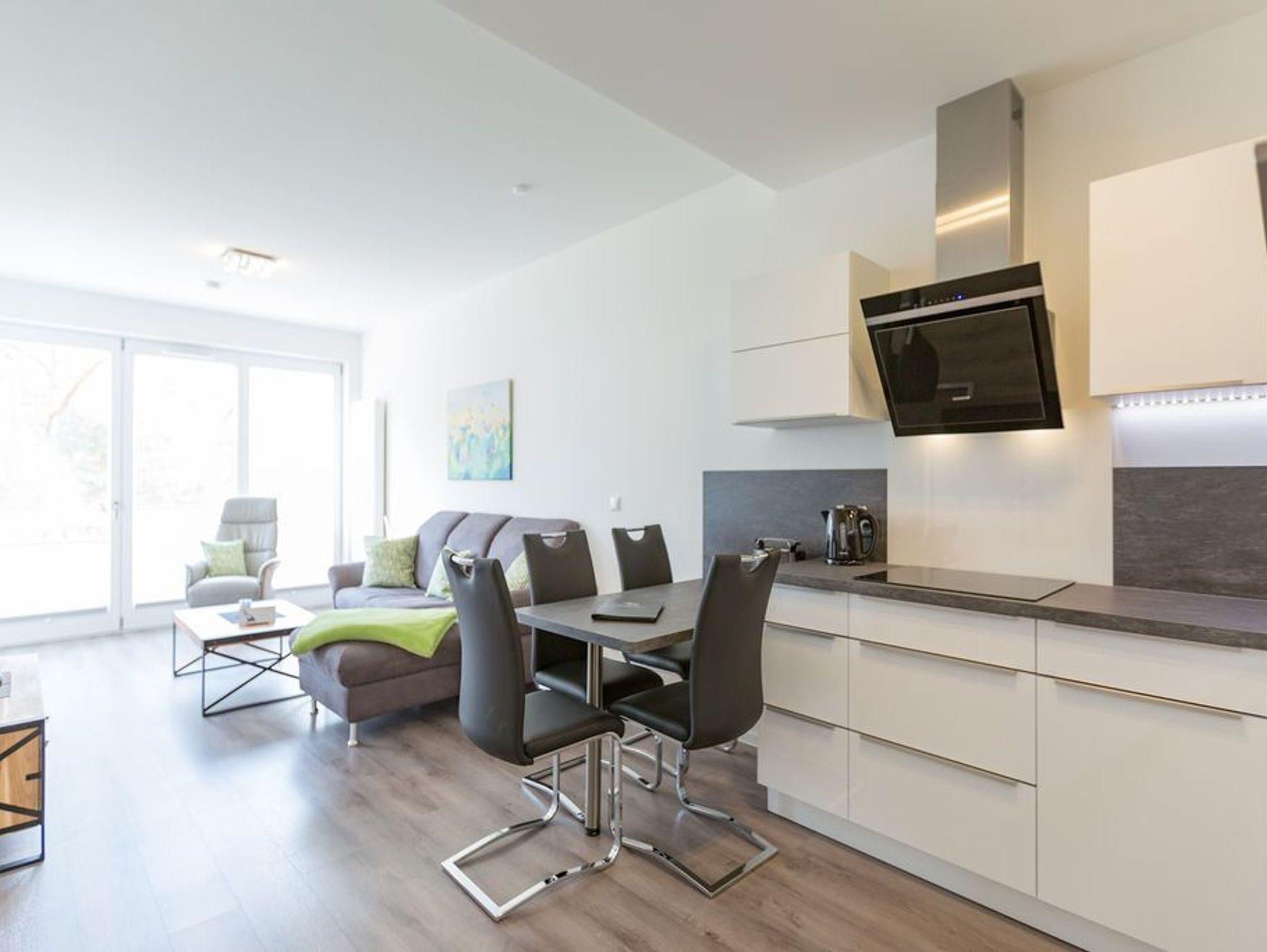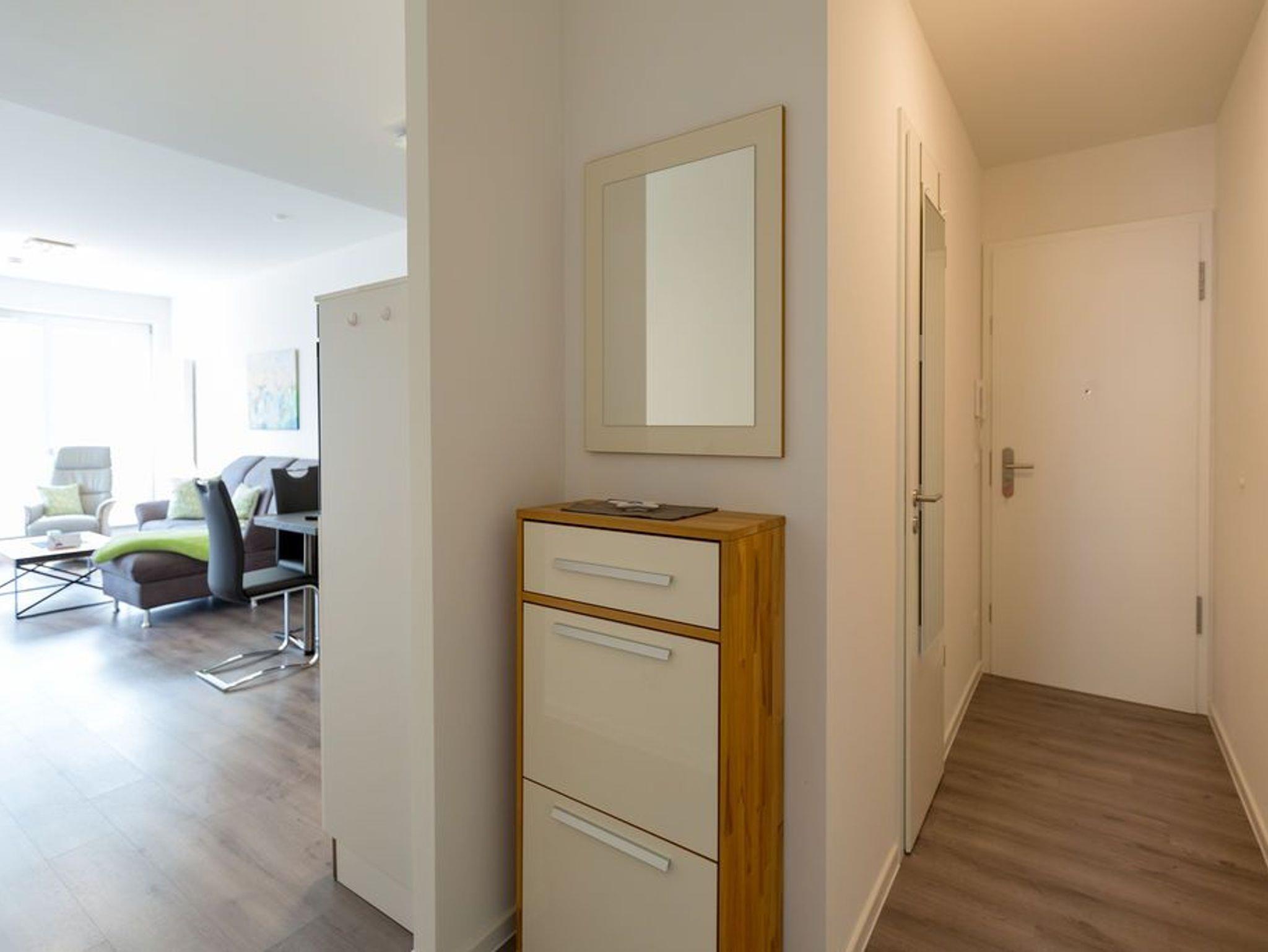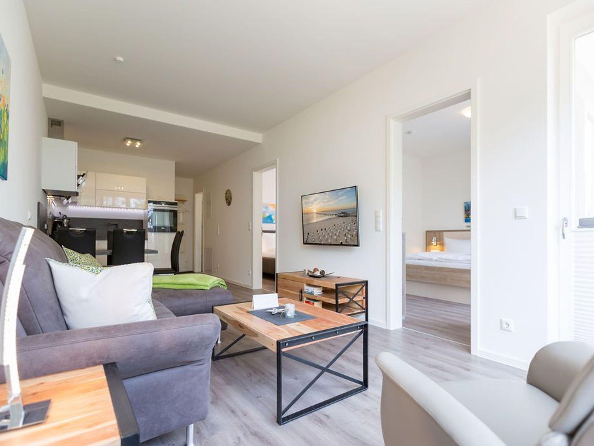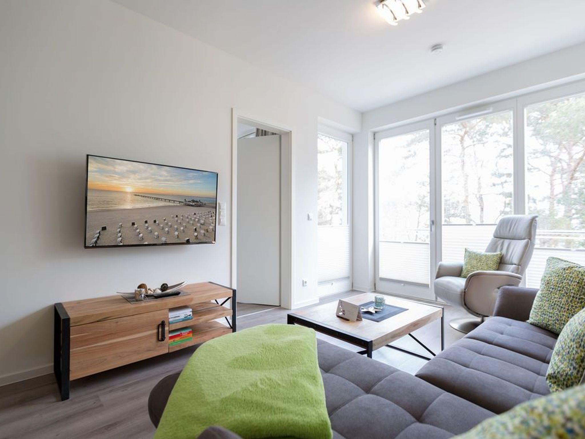 Die Ostsee rauscht geradewegs über den Balkon zum Fenster herein. Denn sie ist in diesem Drei-Zimmer-Wohlfühlparadies zum Greifen nah. Wussten Sie, dass es gesundheitsfördernd und gut für Geist und Seele ist, beim Meeresrauschen einzuschlafen? Auf den 63 Quadratmetern dieser wunderschönen Ferienwohnung in der 2. Etage können es sich bis zu vier Personen und ein Kleinkind bis zwei Jahre (im Kinderreisebett) so richtig gut gehen lassen und Ostseefeeling pur genießen. Frühstück auf dem Balkon (7 Quadratmeter), zu dem Sie sowohl aus dem Wohnzimmer wie auch aus einem der beiden Schlafzimmer Zugang haben, und der Tag beginnt traumhaft. Lassen Sie Ihre Gedanken über das Ostseeblau wandern und jeder Stress wird binnen kürzester Zeit von Ihnen abfallen. Die Einrichtung und die Materialien sind hochwertig und stylisch. Ob im gemütlichen Wohn-Ess-Zimmer oder in den beiden Schlafzimmern ? moderner Wohnkomfort empfängt Sie hier überall. Eine schöne, große Sofalandschaft und ein bequemer Sessel laden zum ausgiebigen Relaxen ein. Ein Flat-TV sorgt für das perfekte Heimkinogefühl. In der offenen Küche finden Sie alles Nötige. Ob Kaffeemaschine, Geschirrspüler oder Induktionsherd ? sämtliche Geräte sind Markengeräte. Auch ein edles Service ist vorhanden. Kochen, Backen, Zubereiten wird hier zum Kinderspiel. Ihre Mahlzeiten zu sich nehmen, das können Sie nicht nur auf dem Balkon, sondern auch am schönen, geräumigen Essplatz. Die bequemen Leder-Freischwinger eignen sich ideal für lange Dinner- und Gesprächsabende. In den beiden Schlafzimmern warten zwei komfortable Doppelbetten (1,80 m x 2,00 m) nur darauf, Ihnen Schlafvergnügen der Extra-Klasse zu bereiten ? inklusive der schönsten Träume. Geräumige Schränke bieten ausreichend Stauraum für die Urlaubsgarderobe. In einem Schlafzimmer gibt es einen Flat-TV. Das ebenfalls sehr geräumige Badezimmer verfügt über eine ebenerdige Dusche, ein WC und ein Waschbecken. Für uneingeschränktes Urlaubsvergnügen ist das WLAN kostenfrei. Die Betten sind bei Anreise bezogen und Handtücher liegen bereit. In der Tiefgarage ist ein Stellplatz im Doppelparker (Fahrzeughöhe max. 1,90 m) für Sie reserviert.