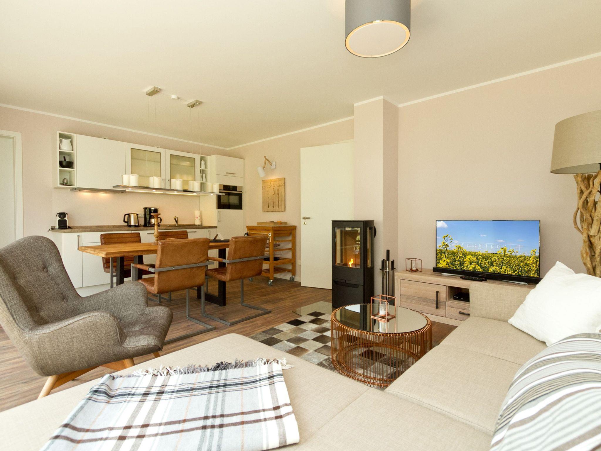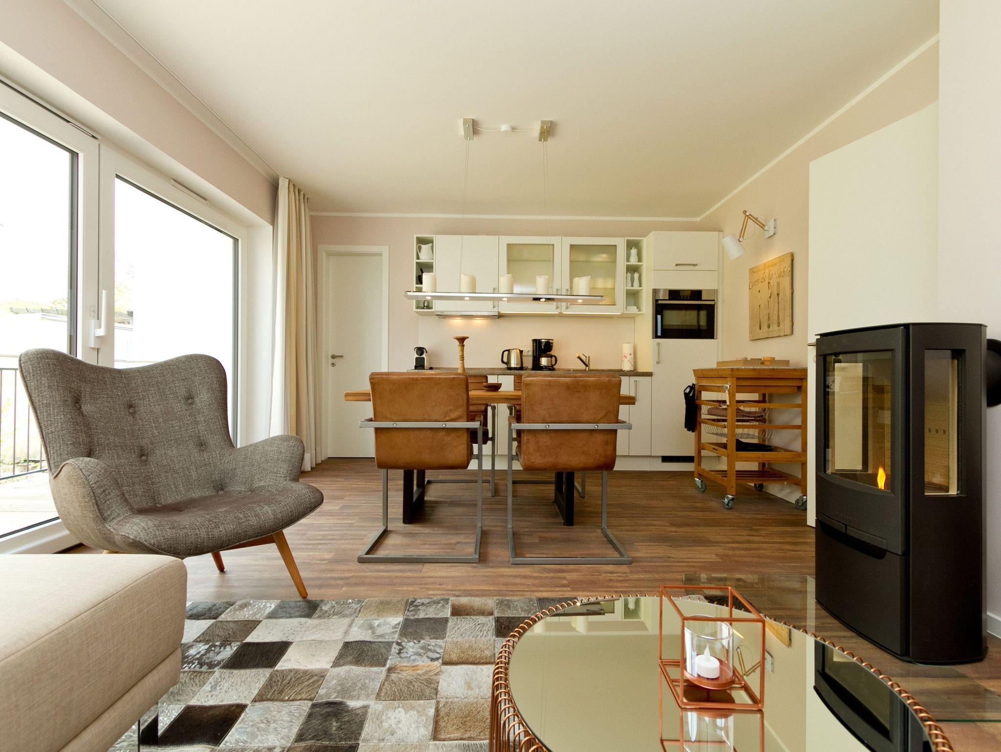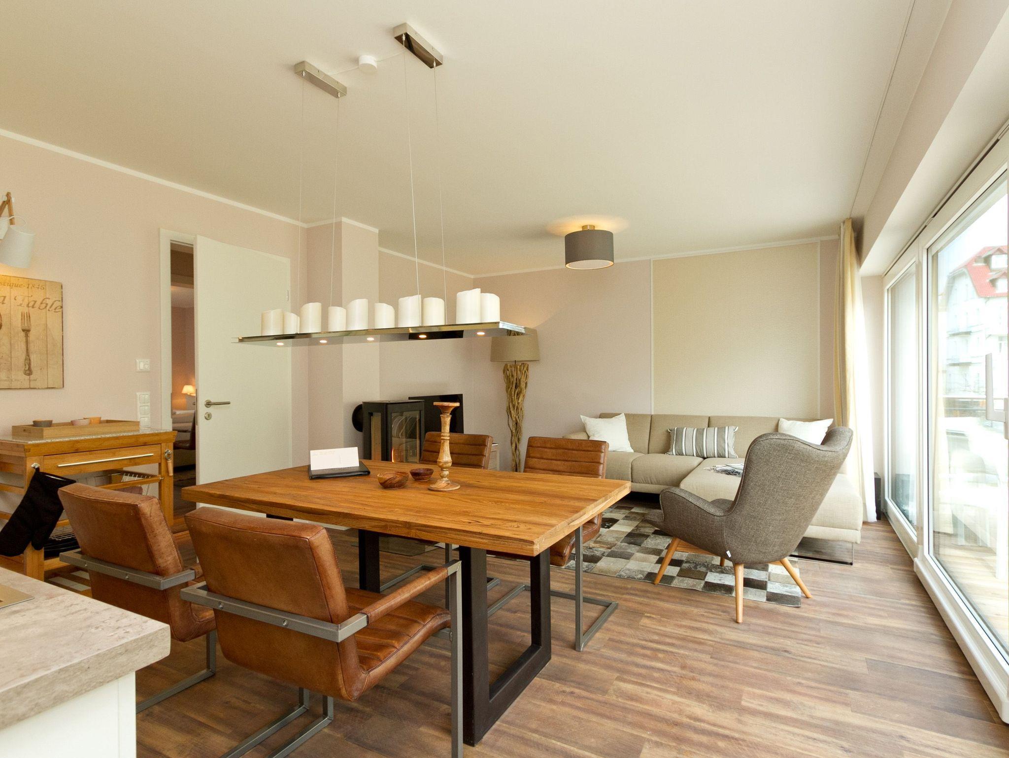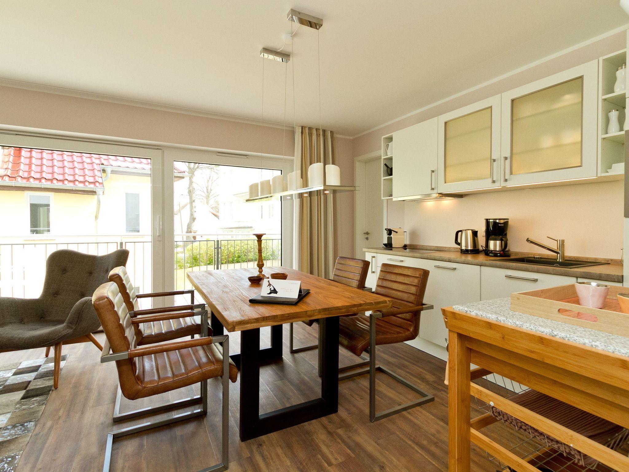 Ein modernes und stylisches Ambiente empfängt die Urlausfreudigen in diesem wunderschönen Appartement Nummer 04 im ersten Obergeschoss. Nordisch nobles Design kombiniert mit Industrial Chic in hellen Pastell- und Braun-Tönen durchzieht die 64 Quadratmeter. Auffallend ist der große und einladende Essbereich mit dem schweren Echtholztisch und den 1960er Retro-Freischwingern aus Echtleder. Hier lässt es sich wunderbar zusammensitzen und gemeinsam essen. Die offene Küche ist dafür mit allen nötigen Geräten und Geschirr ausgestattet. Offen zum Wohnbereich schaut man von der Küche aus auf eine gemütliche Sofalandschaft mit großem Kuschelsessel und einem urigen Kaminofen. Die bodentiefen Fenster lassen viel Licht ein. Durch sie können Sie auf den großzügigen Süd-Ost-Balkon hinaustreten. Hier scheint schon morgens beim Frühstück die Sonne. Und bei günstigem Wind können Sie sogar die Ostsee rauschen hören. So lässt es sich doch Urlauben. Die beiden Schlafzimmer bieten ebenfalls viel Komfort. Die Boxspringdoppelbetten (1,80 m x 2,00 m) sind wunderbar bequem und für erholsame Urlaubsträume bestens geeignet. In allen drei Räumen, in denen bis zu 4 Personen und ein Kleinkind bis 3 Jahre (im Kinderreisebett) wohnen können, gibt es Flat-TVs. Das Tageslichtbad verfügt über eine Dusche und über eine Waschmaschine. Entspannen Sie vom ersten Augenblick an. Denn die Betten sind bei Ihrer Anreise bereits bezogen und Handtücher liegen für Sie bereit. Ein fester Stellplatz vor dem Haus ist für Sie reserviert. Hier gibt es auch die Möglichkeit, ein E-Auto an der Ladestation kostenpflichtig aufzuladen.