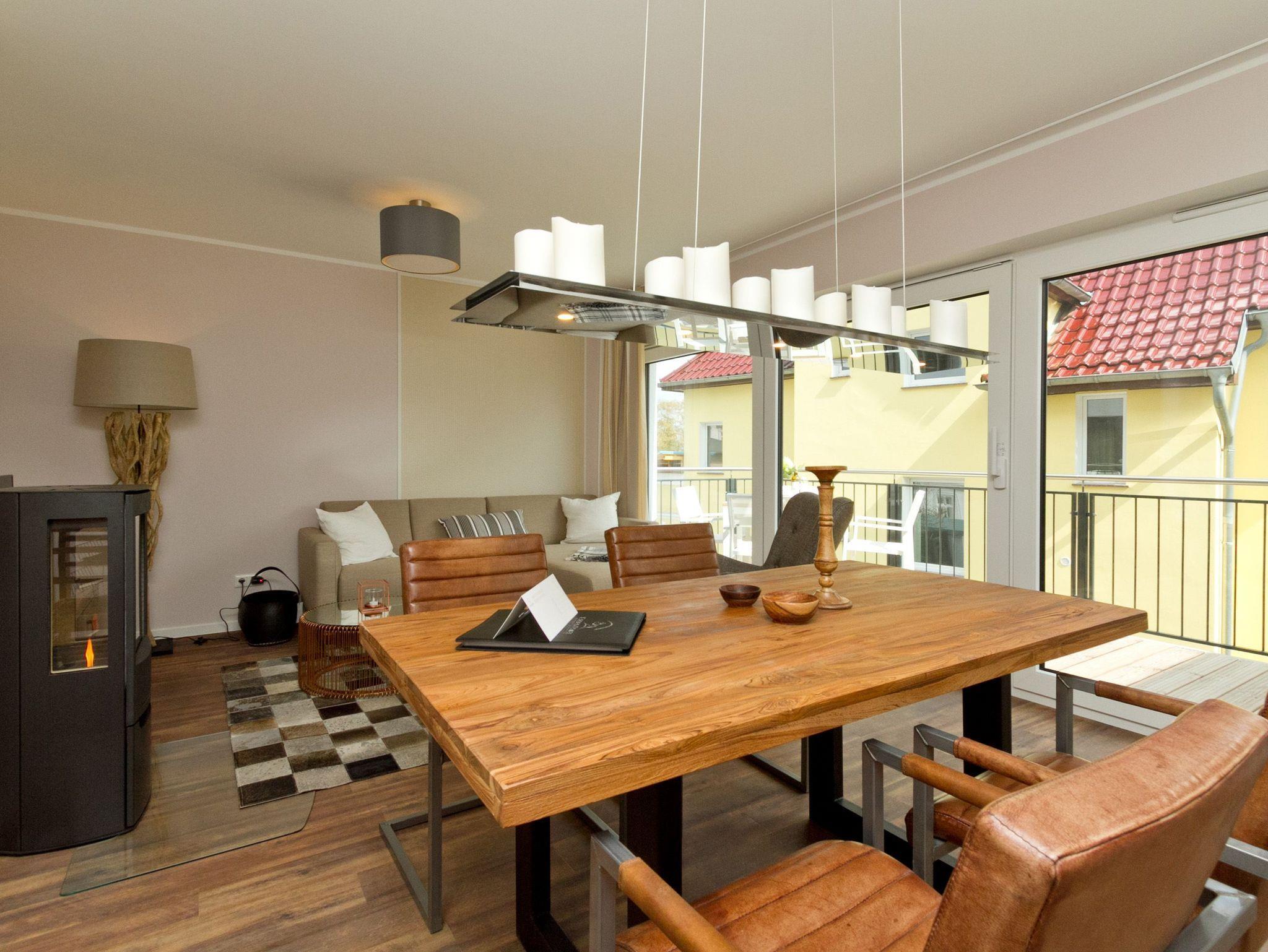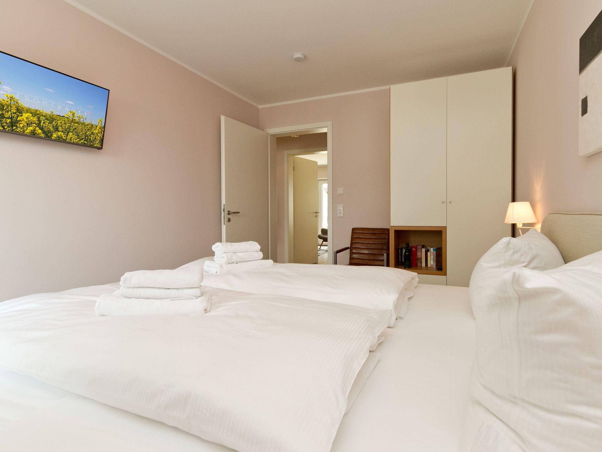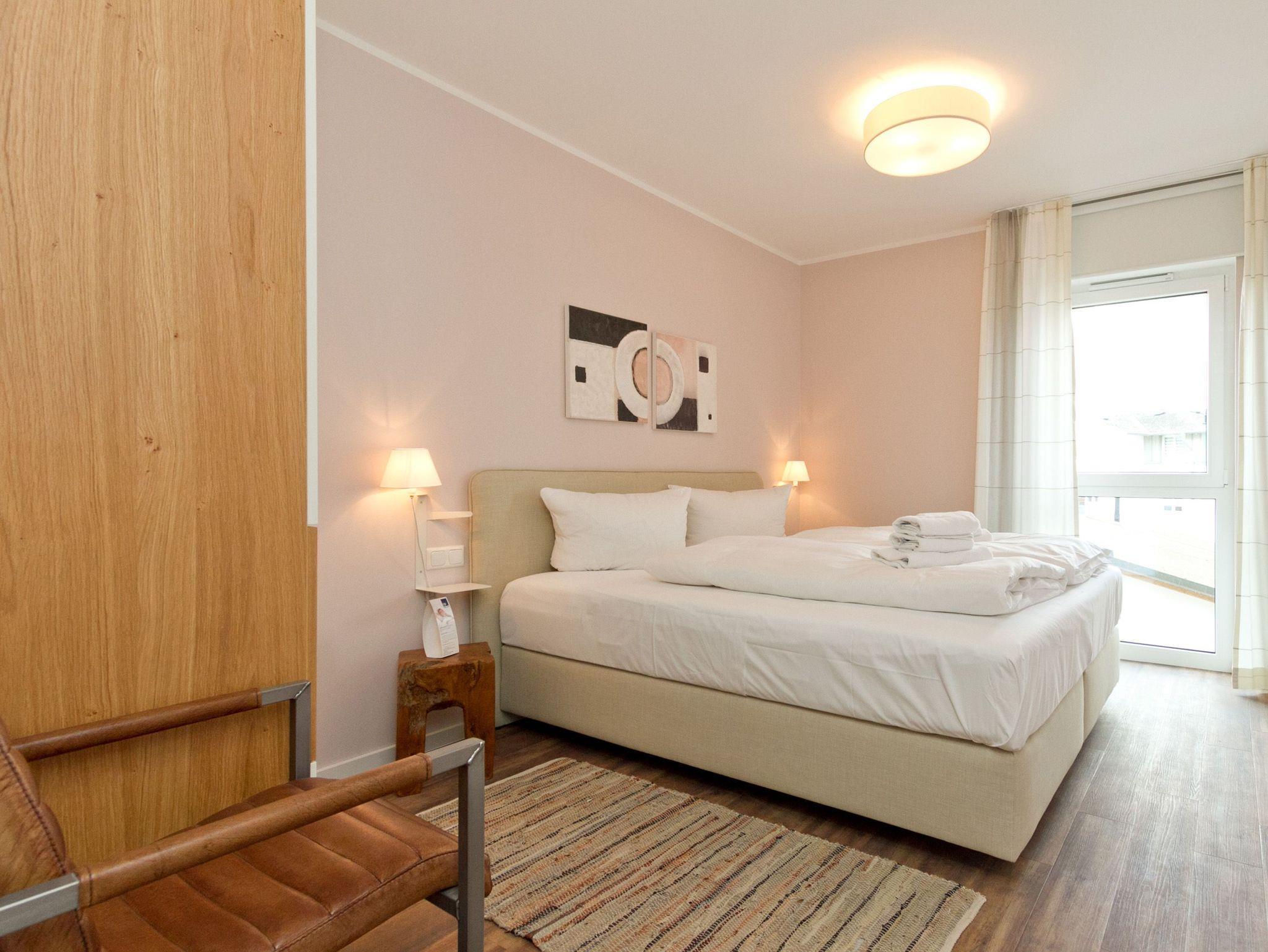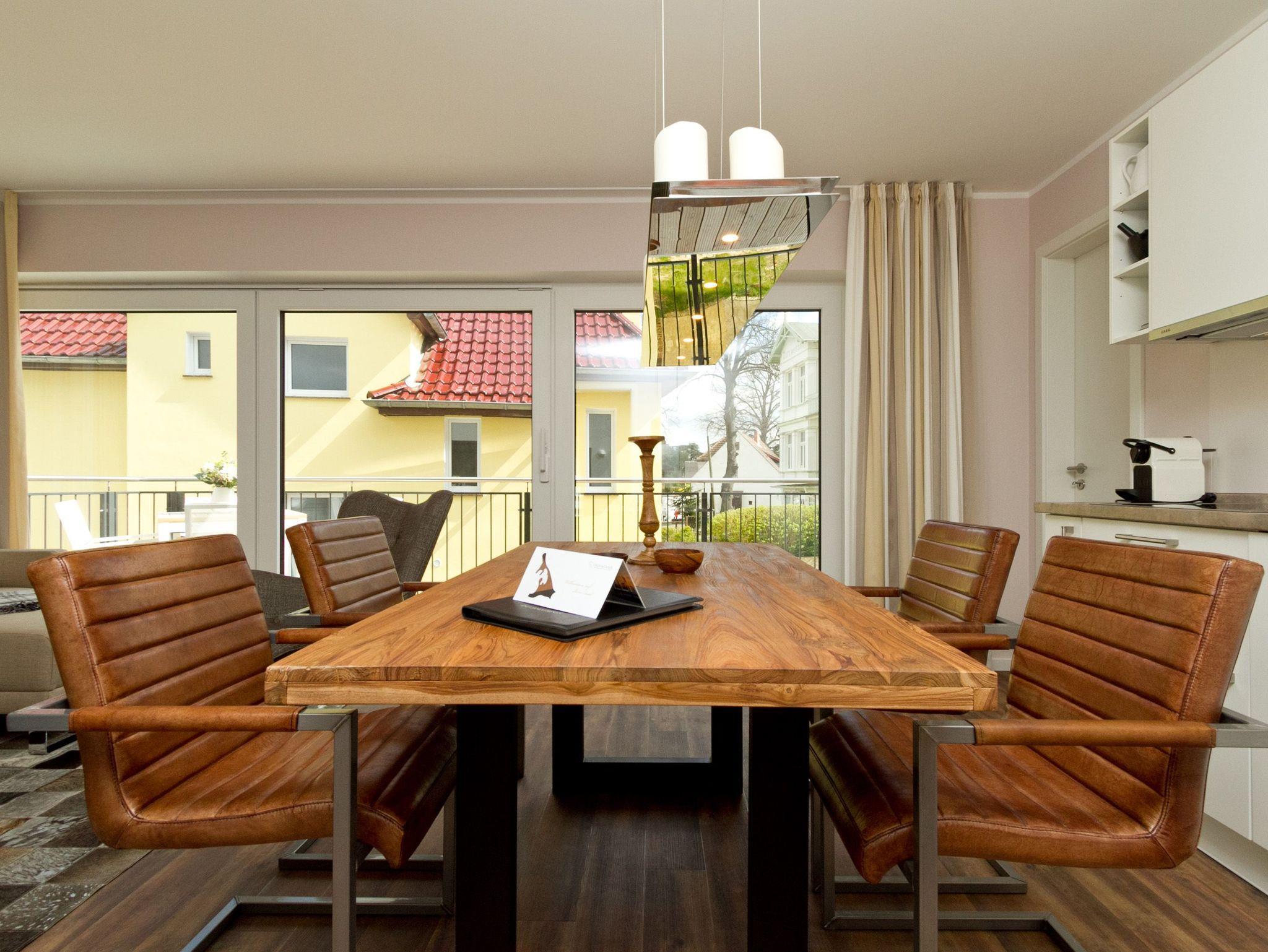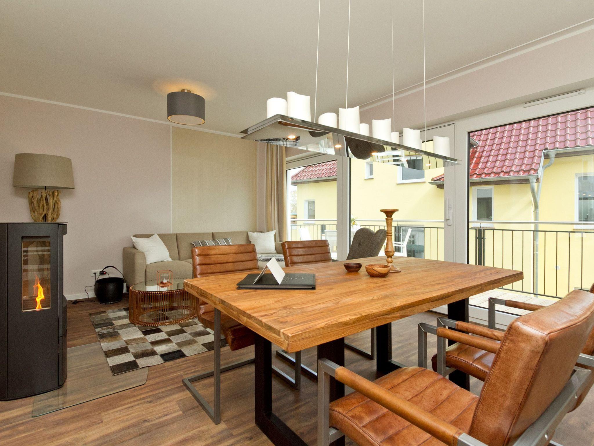 Ein modernes und stylisches Ambiente empfängt die Urlausfreudigen in diesem wunderschönen Appartement Nummer 04 im ersten Obergeschoss. Nordisch nobles Design kombiniert mit Industrial Chic in hellen Pastell- und Braun-Tönen durchzieht die 64 Quadratmeter. Auffallend ist der große und einladende Essbereich mit dem schweren Echtholztisch und den 1960er Retro-Freischwingern aus Echtleder. Hier lässt es sich wunderbar zusammensitzen und gemeinsam essen. Die offene Küche ist dafür mit allen nötigen Geräten und Geschirr ausgestattet. Offen zum Wohnbereich schaut man von der Küche aus auf eine gemütliche Sofalandschaft mit großem Kuschelsessel und einem urigen Kaminofen. Die bodentiefen Fenster lassen viel Licht ein. Durch sie können Sie auf den großzügigen Süd-Ost-Balkon hinaustreten. Hier scheint schon morgens beim Frühstück die Sonne. Und bei günstigem Wind können Sie sogar die Ostsee rauschen hören. So lässt es sich doch Urlauben. Die beiden Schlafzimmer bieten ebenfalls viel Komfort. Die Boxspringdoppelbetten (1,80 m x 2,00 m) sind wunderbar bequem und für erholsame Urlaubsträume bestens geeignet. In allen drei Räumen, in denen bis zu 4 Personen und ein Kleinkind bis 3 Jahre (im Kinderreisebett) wohnen können, gibt es Flat-TVs. Das Tageslichtbad verfügt über eine Dusche und über eine Waschmaschine. Entspannen Sie vom ersten Augenblick an. Denn die Betten sind bei Ihrer Anreise bereits bezogen und Handtücher liegen für Sie bereit. Ein fester Stellplatz vor dem Haus ist für Sie reserviert. Hier gibt es auch die Möglichkeit, ein E-Auto an der Ladestation kostenpflichtig aufzuladen.
