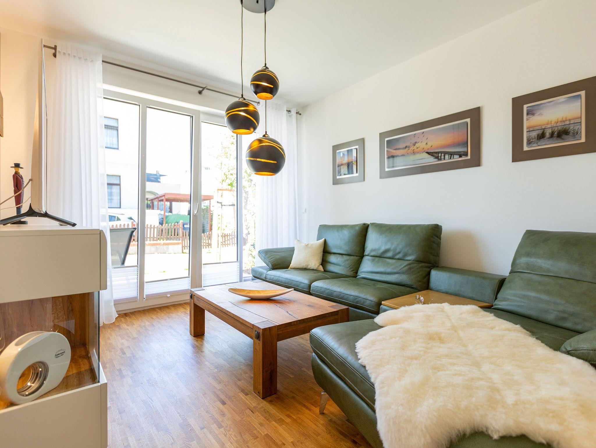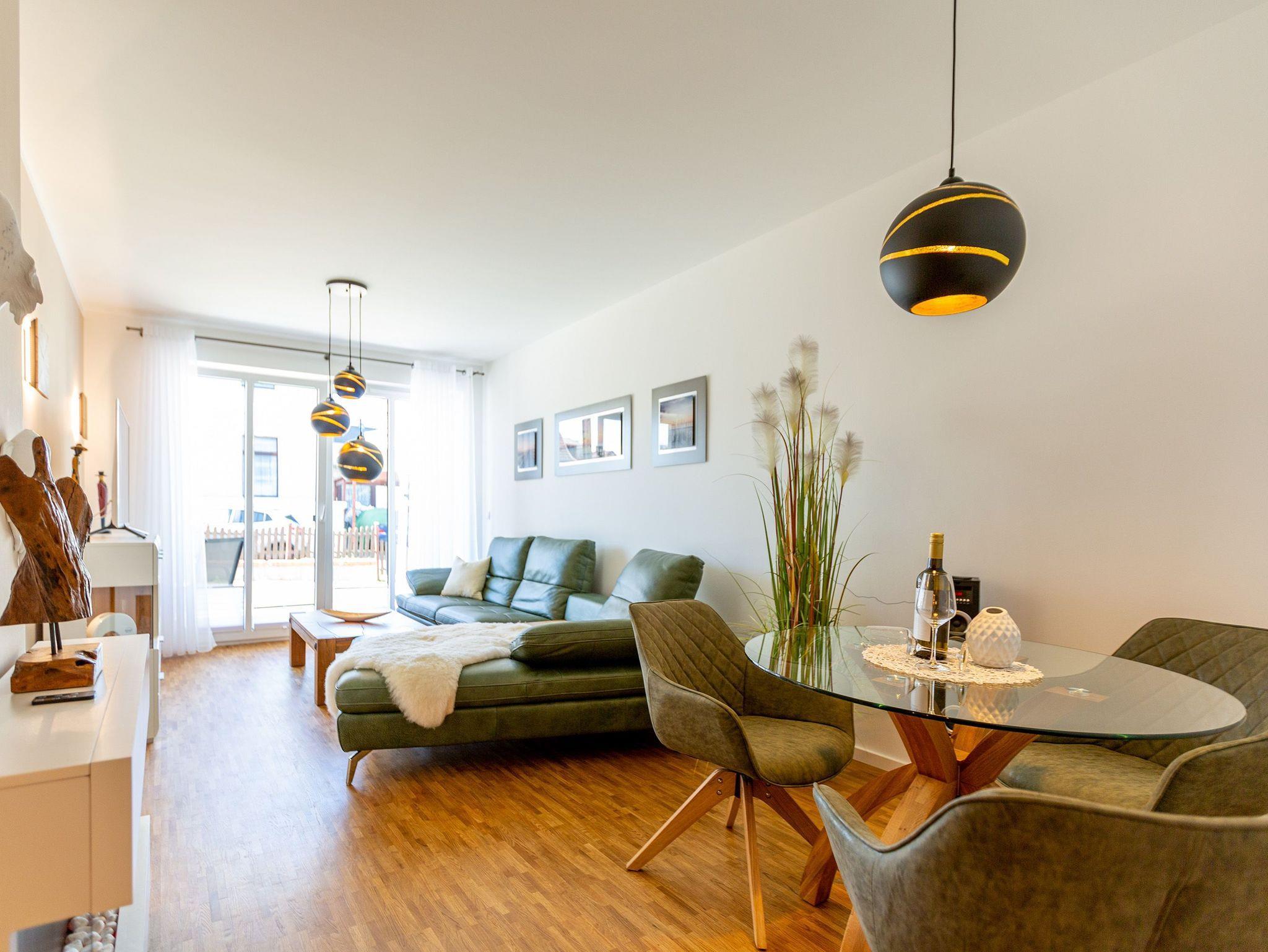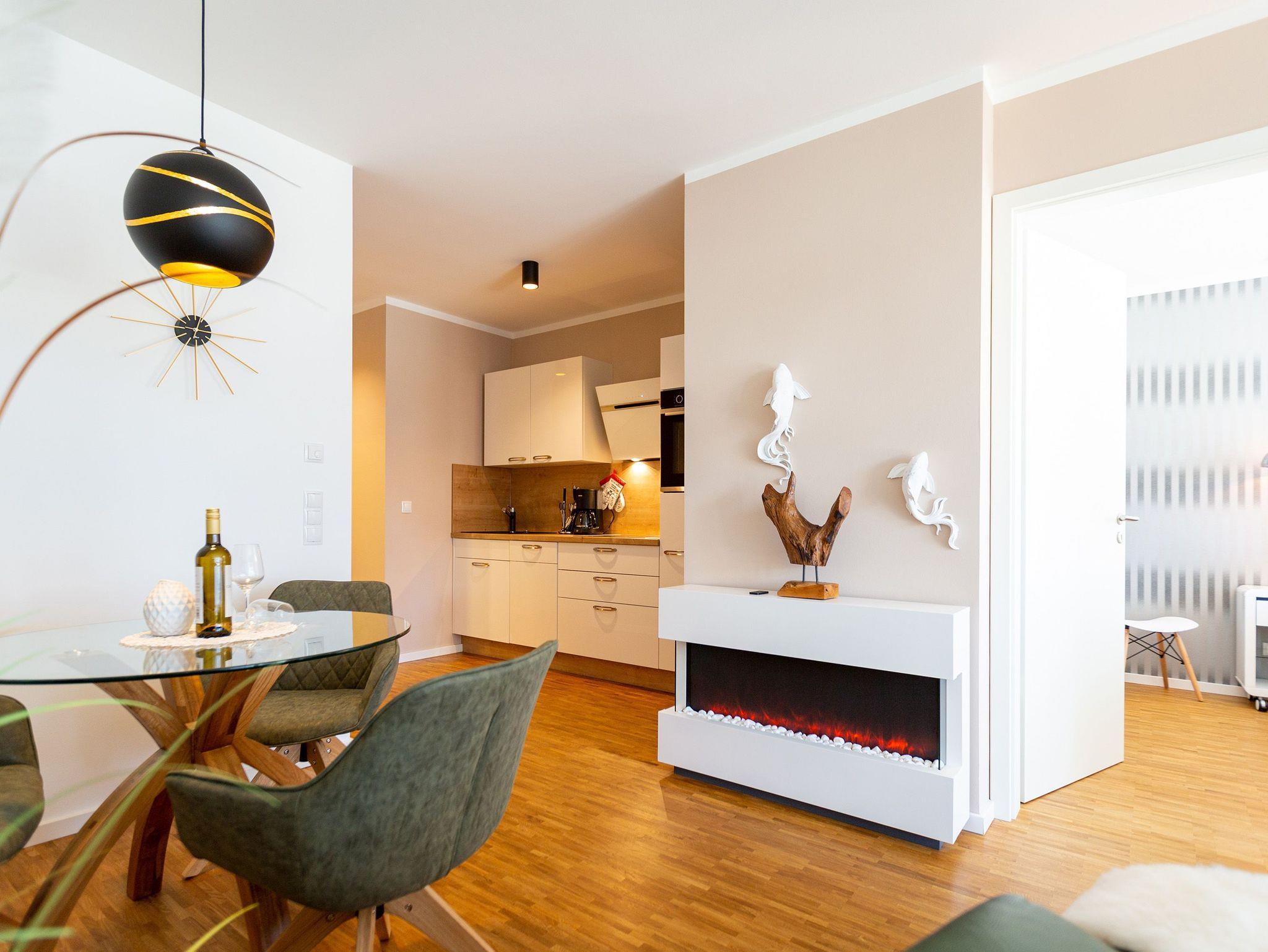 Ein Feriendomizil mit Stil und einer schönen Terrasse erwartet Sie im Erdgeschoss vom Quartier 7. Für zwei Personen ist dieses wunderschön eingerichtete Zwei-Zimmer-Appartement das ideale Auszeit-Zuhause. Auf den 50 Quadratmetern finden Sie alles, was Sie für eine entspannte Zeit auf Usedom brauchen können. Ein großzügiges und offenes Wohnzimmer lädt zum Relaxen ein. Ein großer Flat-TV gehört zur Ausstattung dazu. Ebenso ein Elektro-Kamin mit Panoramascheibe. Sollte es auf Usedom einmal widererwartend ungemütliches Wetter geben, sorgt er dafür, dass Sie sich schnell kuschelig und geborgen fühlen. Entspannen Sie auf der großen Ledersofalandschaft und genießen Sie einfach die Zeit, die hier auf der Insel bedeutungslos wird. Das WLAN ist hier kostenfrei nutzbar. Die Liebe zum Detail und zur Natur wird in den kleinen Dekorationen sichtbar. Zum Wohnzimmer hin öffnet sich eine komplett ausgestattete Küche. Markengeräte und edles Geschirr erleichtern das Zubereiten der Mahlzeiten. Am modernen Glastisch können Sie gemütlich sitzen und essen. Ist das Wetter schön, eignen sich dafür allerdings auch die Gartenmöbel auf der sonnenüberfluteten Süd-West-Terrasse (14 Quadratmeter). Skandinavisches Design: Im Schlafzimmer wartet ein bequemes und großes Boxspringdoppelbett (1,80 m x 2,00 m) nur darauf, Ihnen den Schlaf zu versüßen. Wenn die Ostsee nicht so ein Magnet wäre, könnte man hier glatt den ganzen Tag verkuscheln. Für das Kino-im-Bett-Gefühl ist ein Flat-TV vorhanden. Ein geräumiger Schrank bietet viel Platz für Kleidung. Auch vom Schlafzimmer aus haben Sie einen Zugang zur Terrasse. Das Bad ist mit Dusche und WC ausgestattet. Freuen Sie sich hier auf ein kleines Highlight: Eine finnische Sauna. Entspannen Sie ausgiebig in ihrem eigenen kleinen Private SPA. Handtücher liegen bereit. Ebenso ist das Bett bei Ihrer Anreise bezogen. In der Tiefgarage ist der Stellplatz Nr. WE 02 für Sie reserviert.