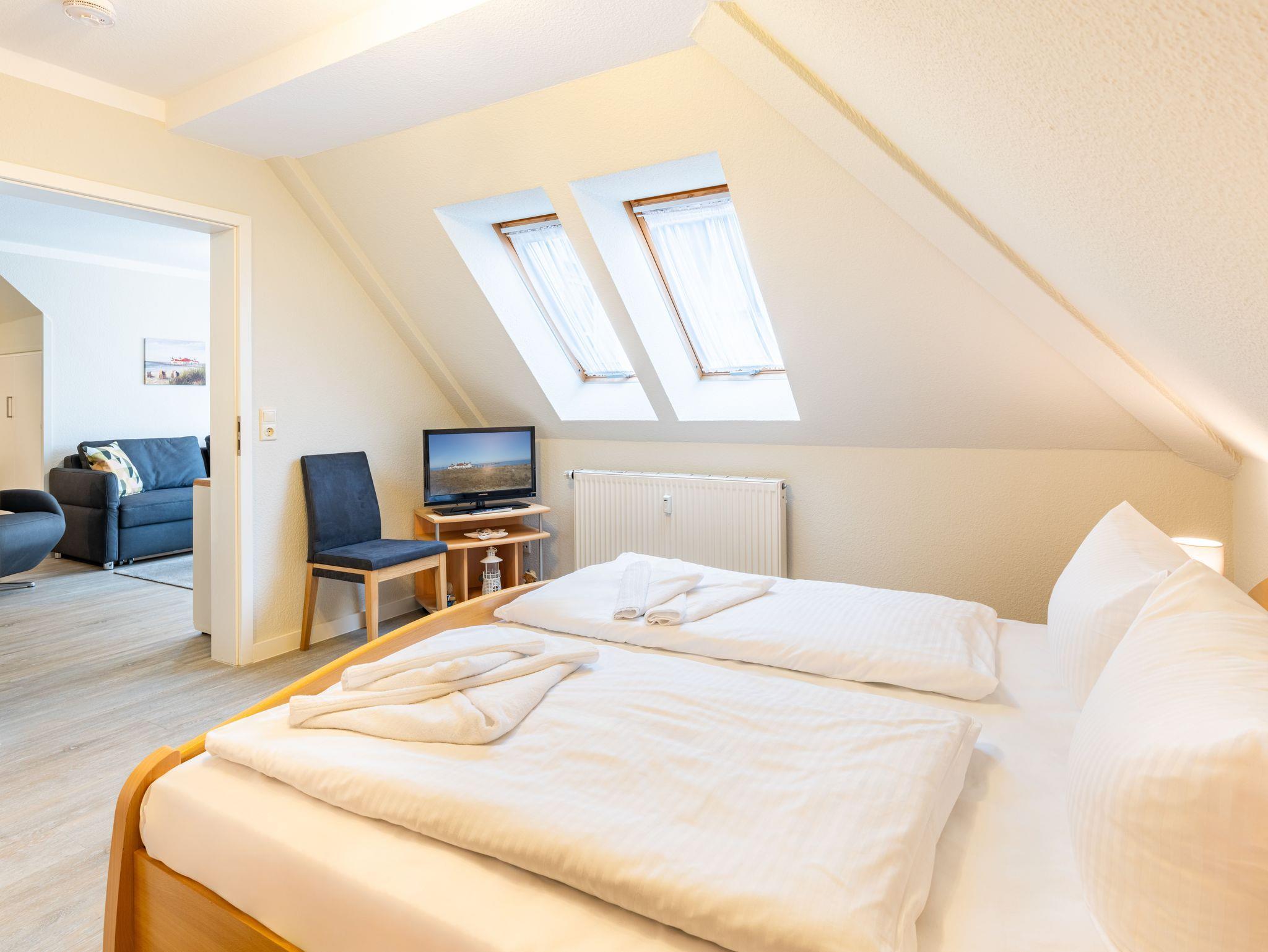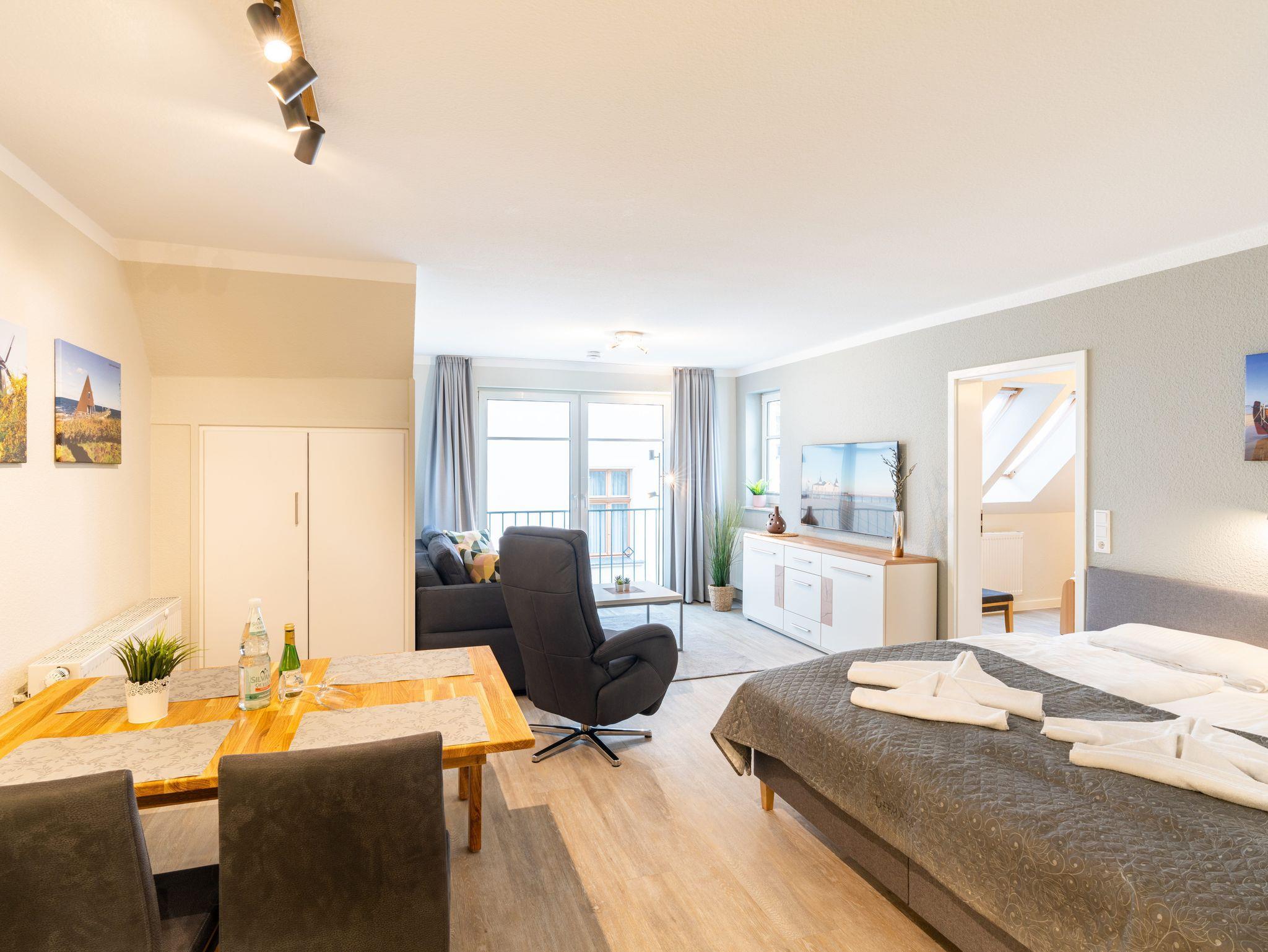 Die 50 qm große Wohnung befindet sich im zweiten Obergeschoss und ist für bis zu vier Personen ausgestattet. Die Wohnung verfügt über ein separates Schlafzimmer mit Doppelbett, ein Wohnzimmer mit Doppelbett (Couchecke mit TV-Gerät sowie eine offene Küche, ausgestattet mit Herd und Backofen, Kühlschrank u.v.m.. Bad mit Dusche und WC.