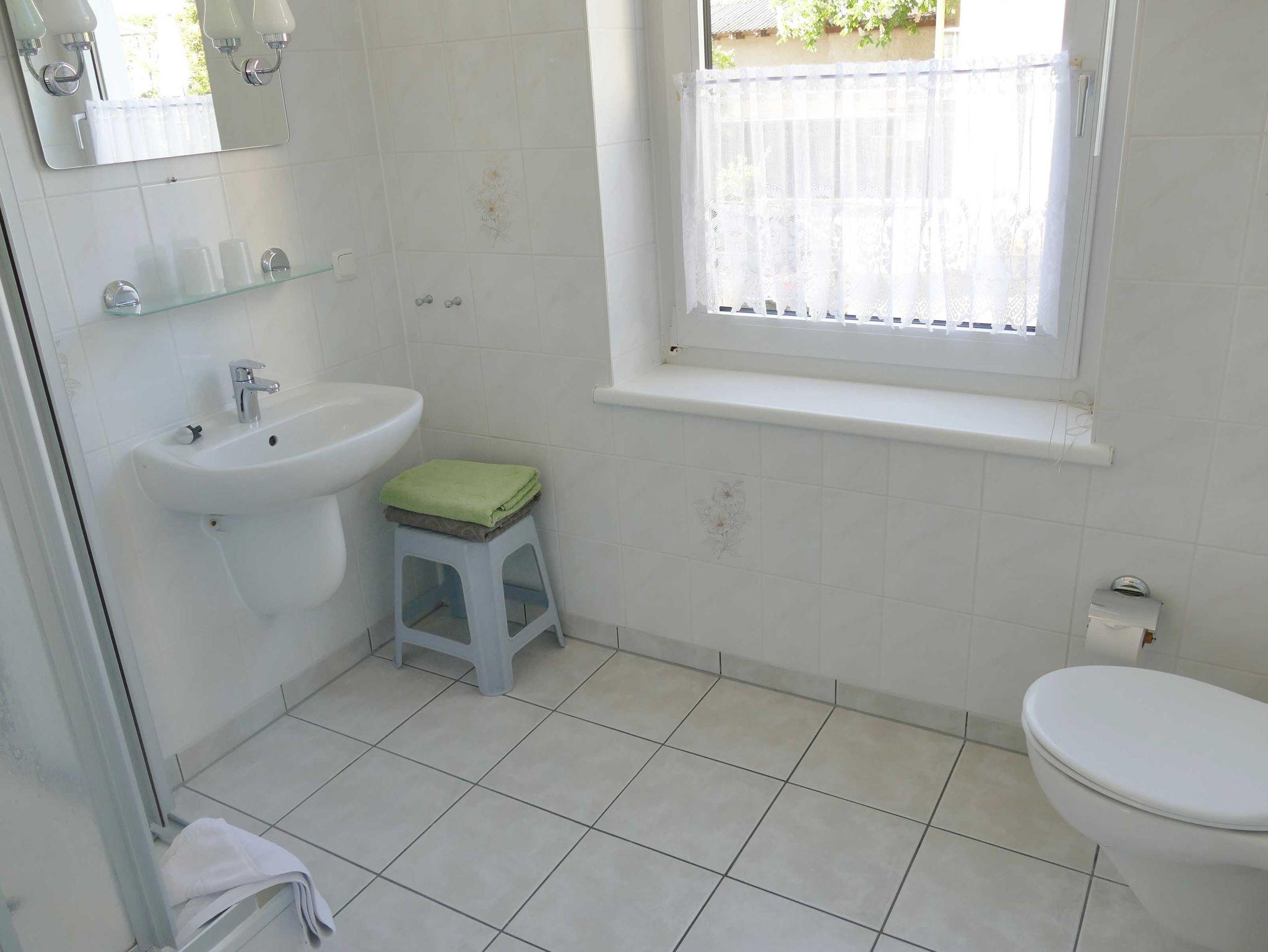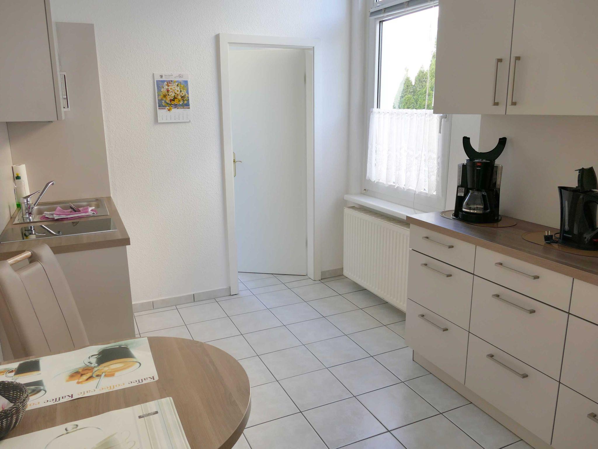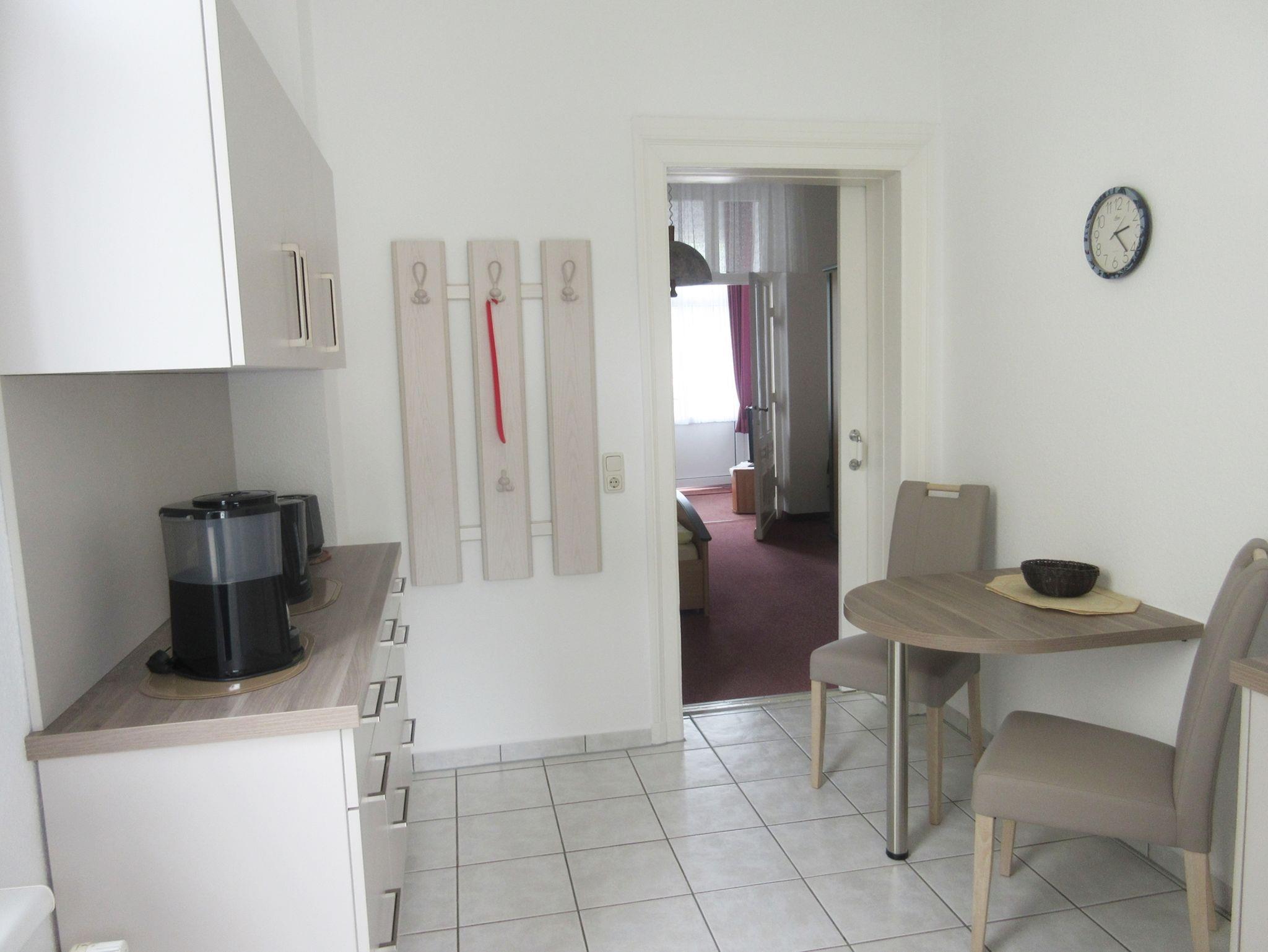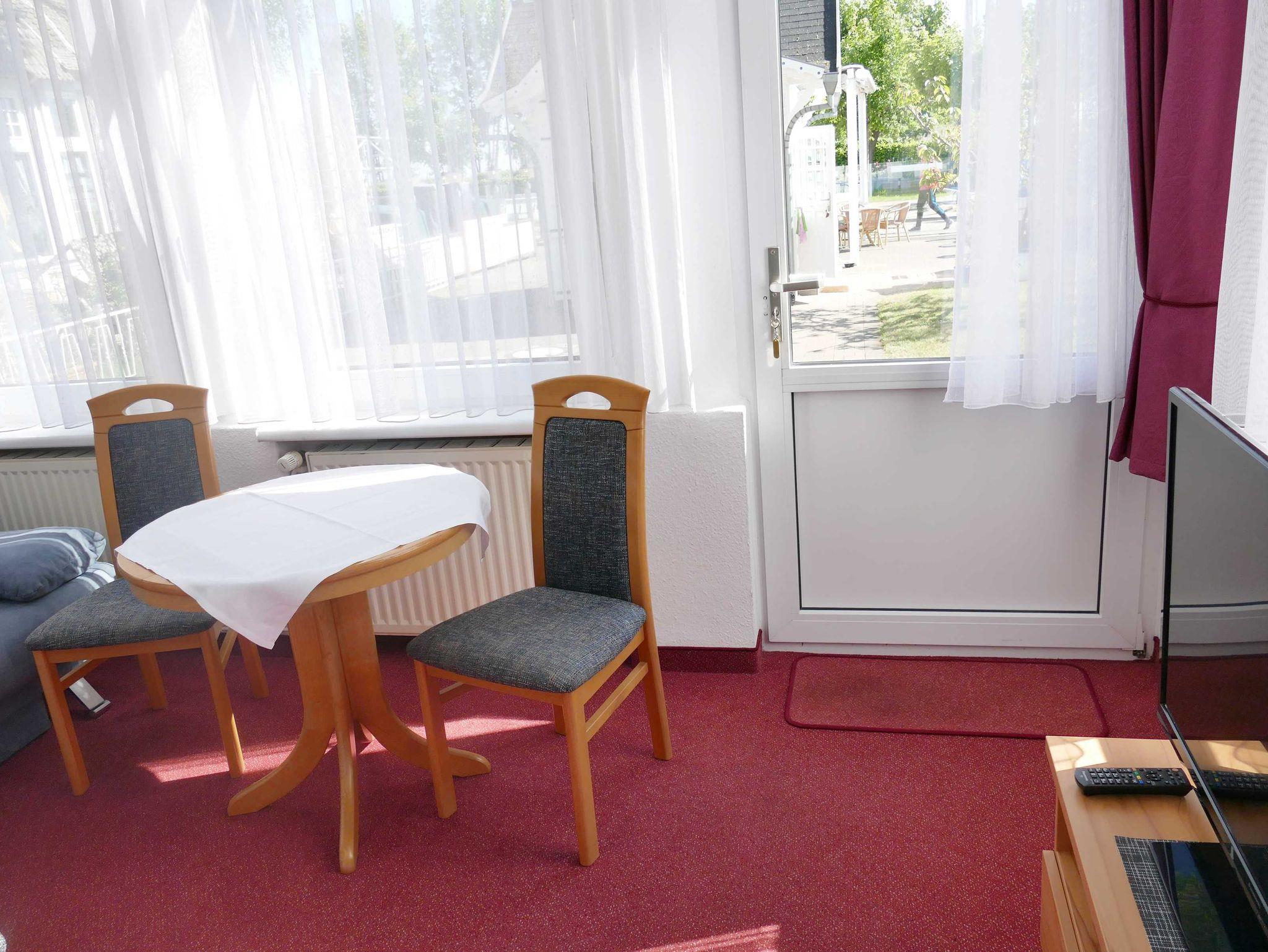 Die Wohnung im Hochparterre mit 60 qm Größe bietet Platz für bis zu 2 Personen, sie ist über einen separaten Eingang (Gartenseite der Pension) zu erreichen. Das Schlafzimmer verfügt über ein Doppelbett. Das gemütlich eingerichtete Wohnzimmer in der Veranda verfügt über eine Sitzecke und Kabel-TV. Die komplett eingerichtete Küche mit Backofen, Herd, Mikrowelle, Kühlschrank mit Gefriermöglichkeit u.v.m. gehört ebenso dazu wie ein Bad mit Dusche/WC.