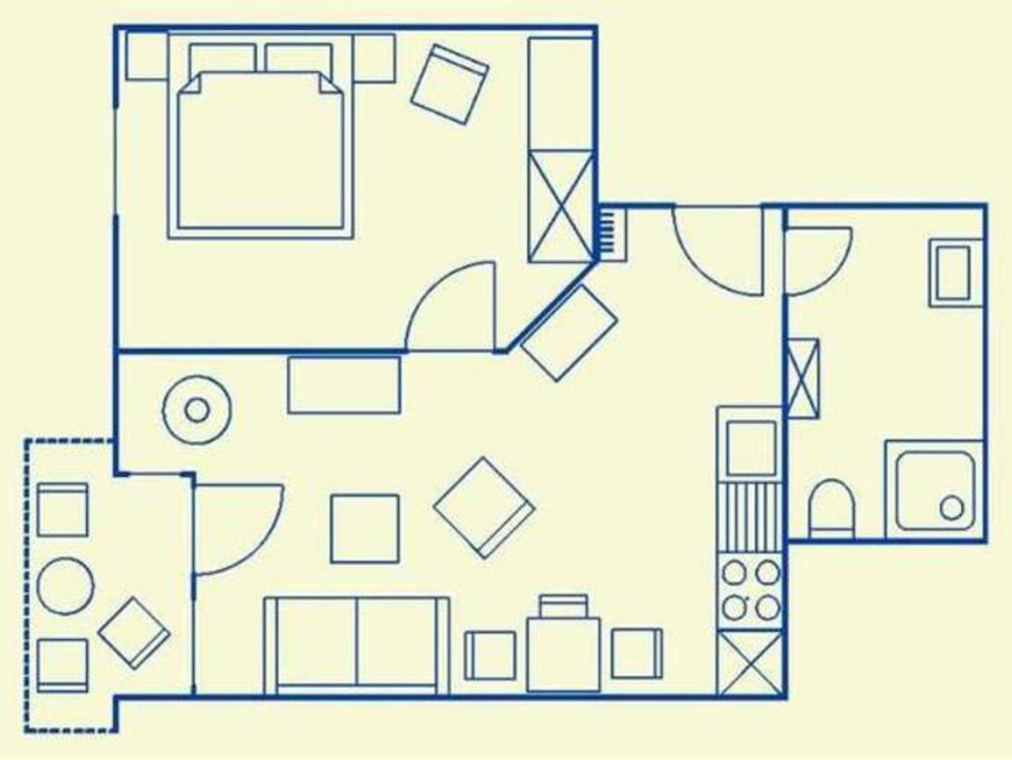 1 Schlafraum, 1 Wohnraum, 1 Küchenzeile, 1 Badezimmer mit Dusche