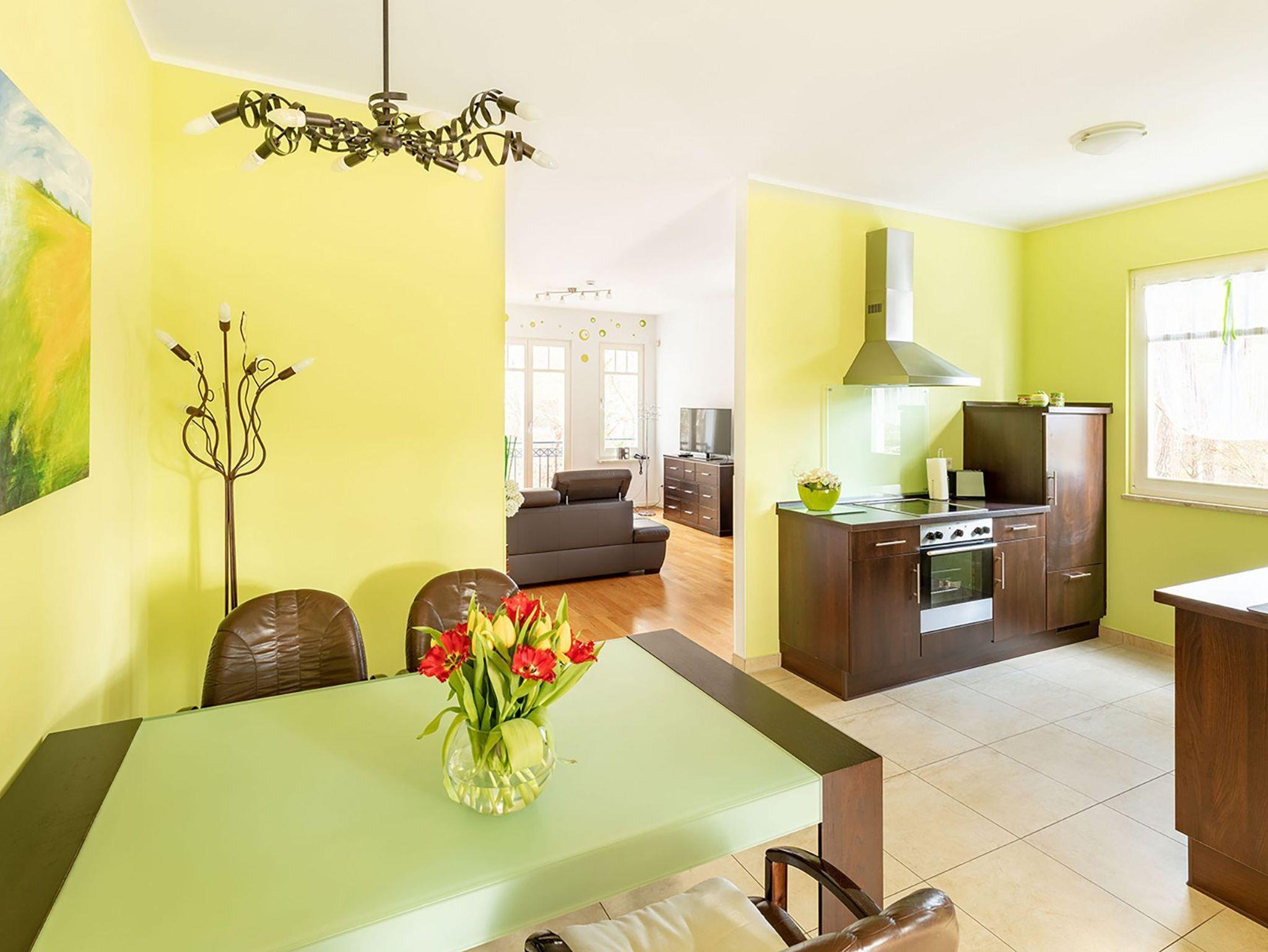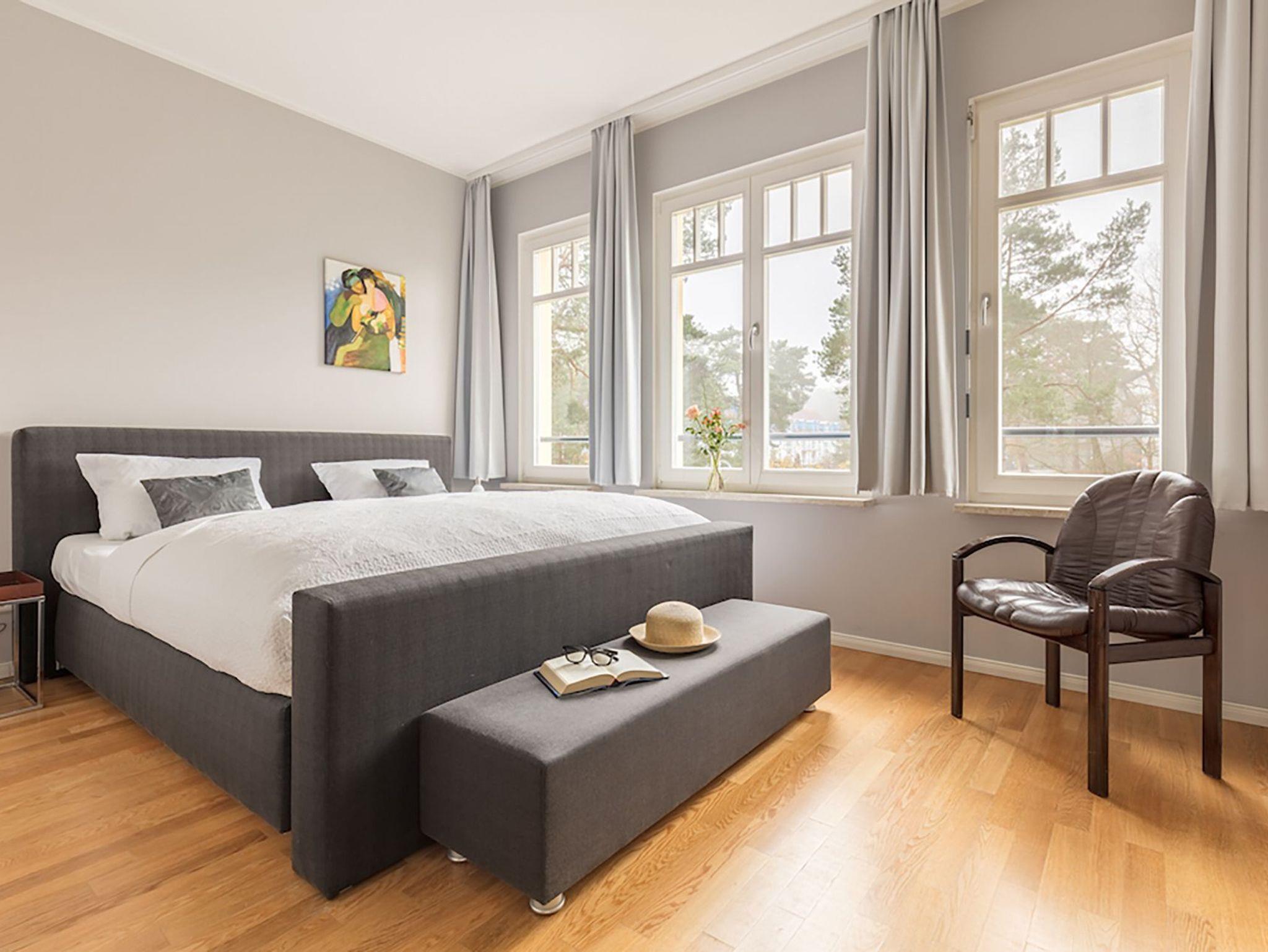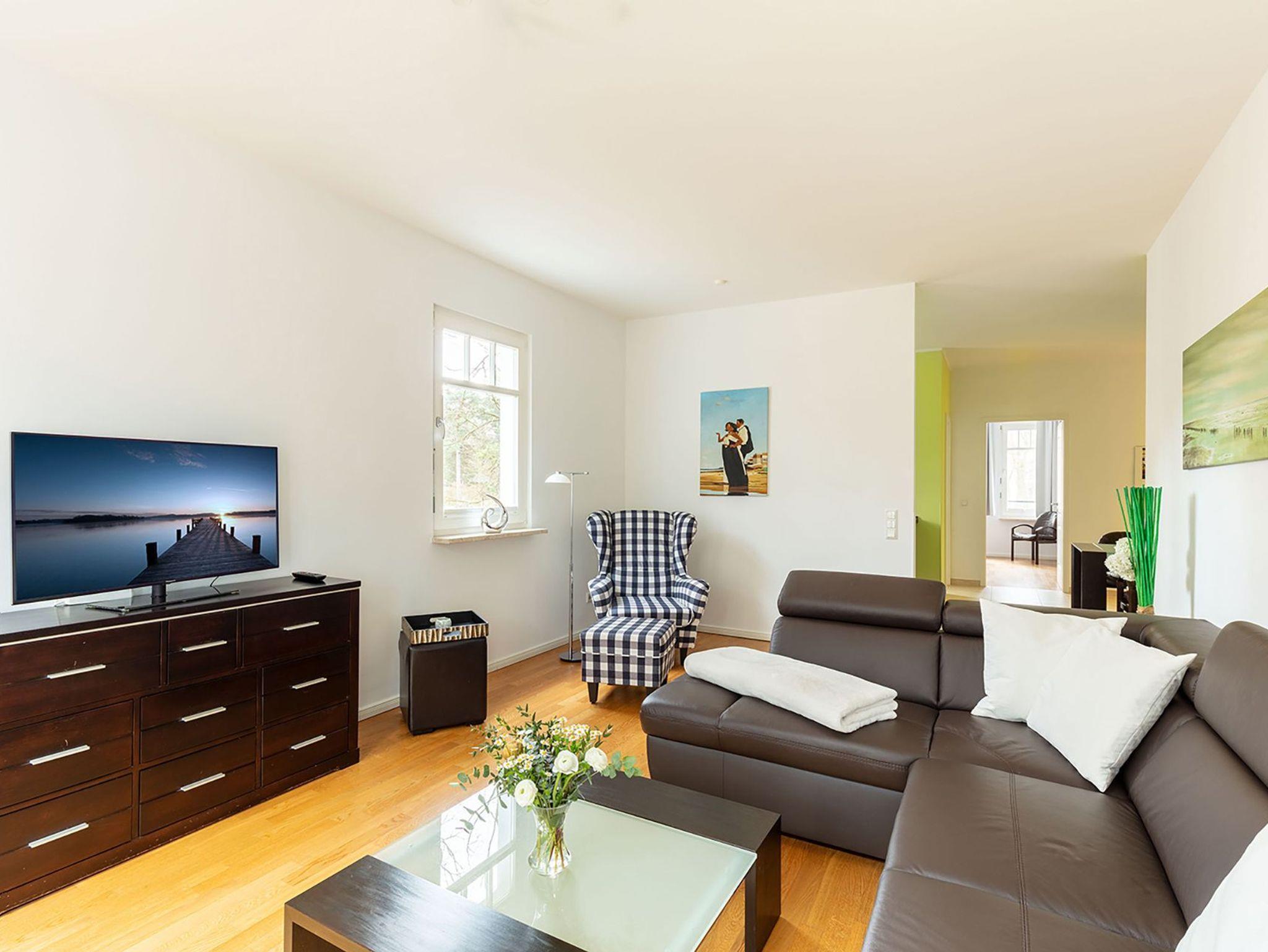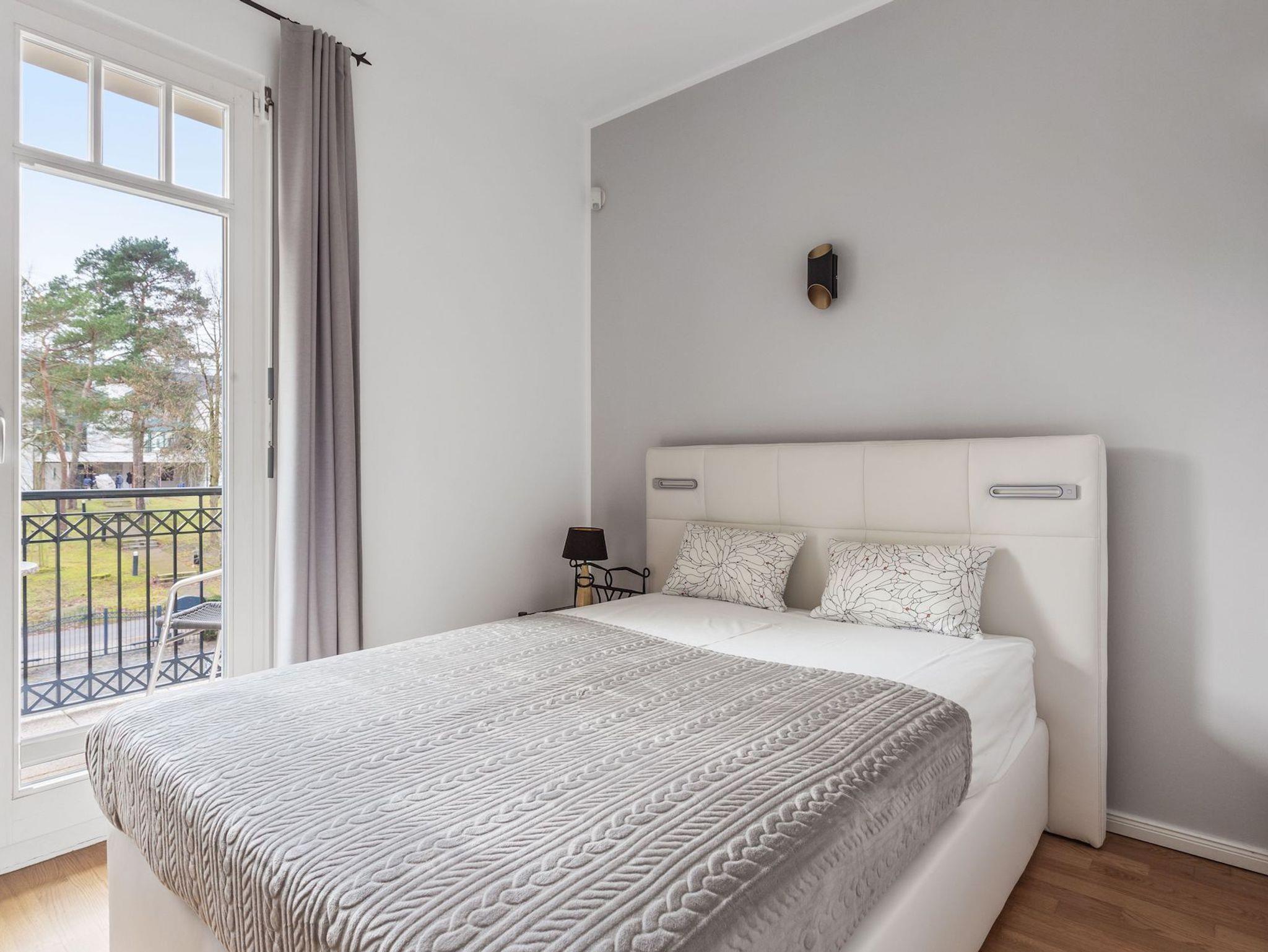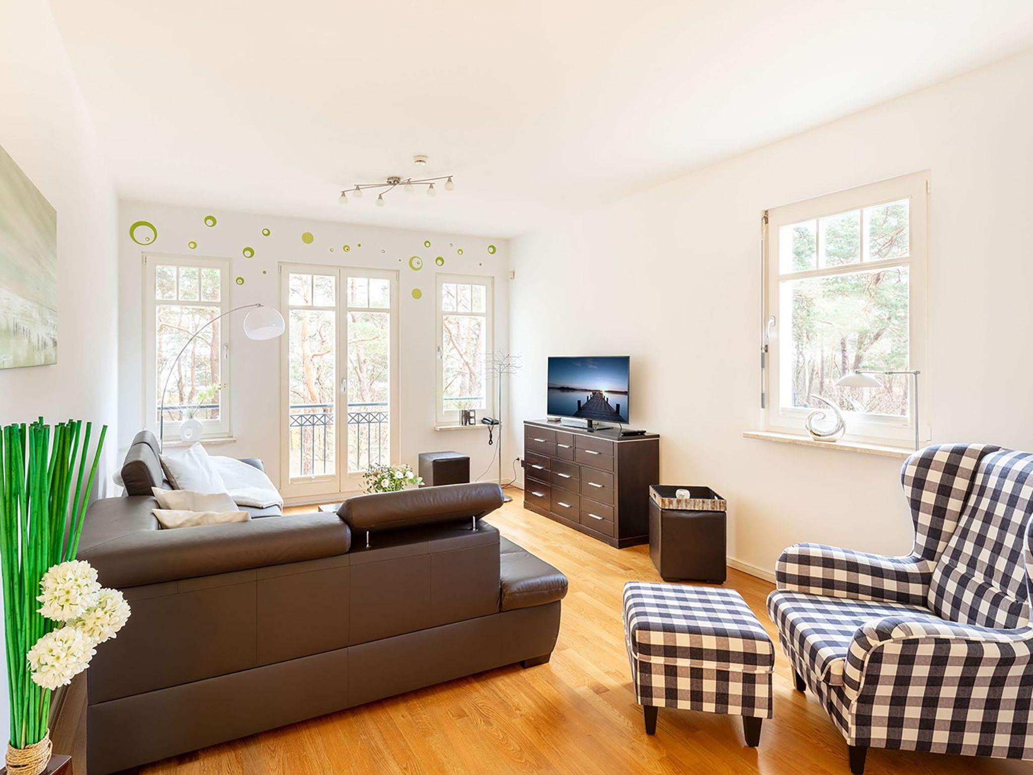 Willkommen im 78 m² großen 3-Raum-Apartment ?Wollin?, Ihrem großzügigen Rückzugsort in der 2. Etage ? stilvoll, modern und mit frischen grünen Akzenten, die sofort Urlaubslaune verbreiten. Genießen Sie vom gemütlichen Ohrensessel durch bodentiefe Fenster den Blick zur Ostsee ? hier beginnt jeder Tag mit einer frischen Meeresbrise. Auf dem sonnigen Südbalkon schauen Sie über einen kleinen, grünen Park und lassen den Alltag weit hinter sich. Das große Schlafzimmer verwöhnt Sie mit einem komfortablen Boxspringbett (1,80 m breit) und einem geräumigen 2-m-Kleiderschrank. Das zweite Schlafzimmer, von dem Sie direkt auf den Balkon treten, bietet ein 1,40 m breites Boxspringbett ? perfekt für einen Erwachsenen oder zwei Kinder. Das helle Tageslichtbad mit Dusche, Waschtisch und Spiegelschrank sorgt für einen frischen Start in den Tag. Die moderne Küche mit Fenster ist offen zum separaten Essplatz gestaltet und vollständig für 4 Personen ausgestattet ? ideal für gesellige Runden nach einem Strandtag. Echtholzparkett, Fußbodenheizung und wärmereflektierende Sonnenschutzrollos an allen Fenstern zur Ost- und Südseite schaffen zu jeder Jahreszeit Wohlfühlatmosphäre. Ein PKW-Stellplatz am Haus ist selbstverständlich inklusive. Hier erwartet Sie ein Platz zum Ankommen, Durchatmen und Genießen ? nur einen Wimpernschlag von der Ostsee entfernt.