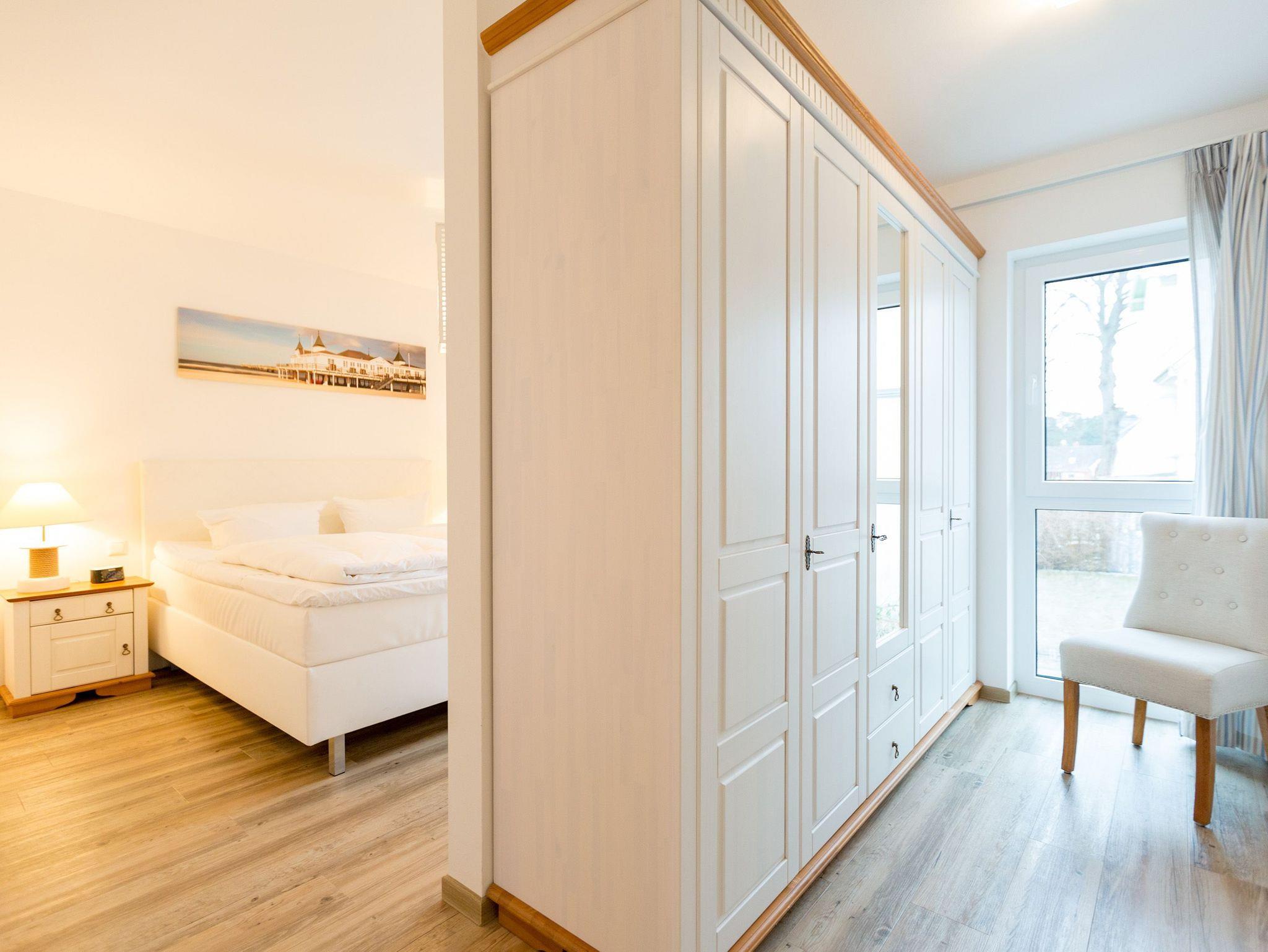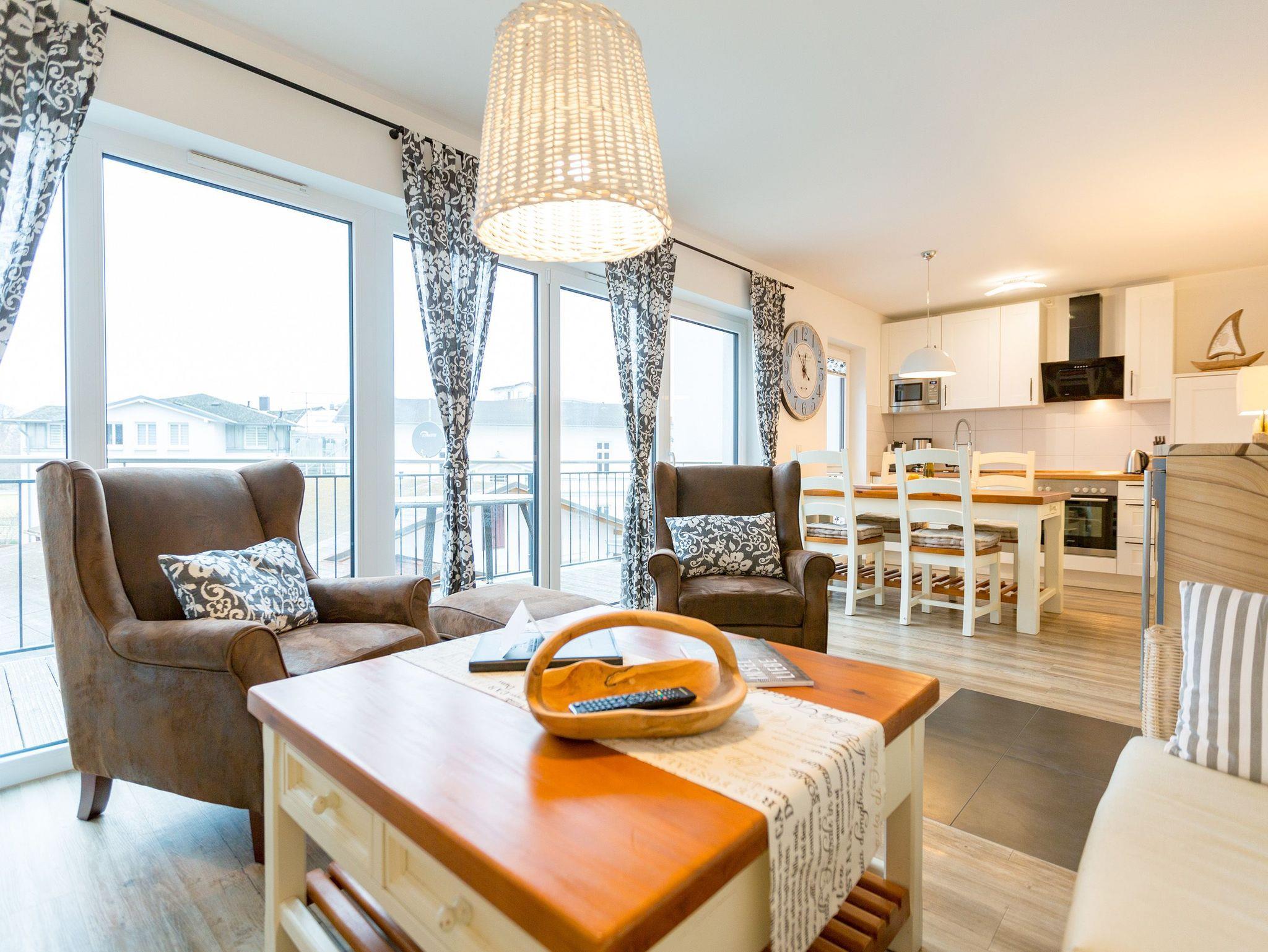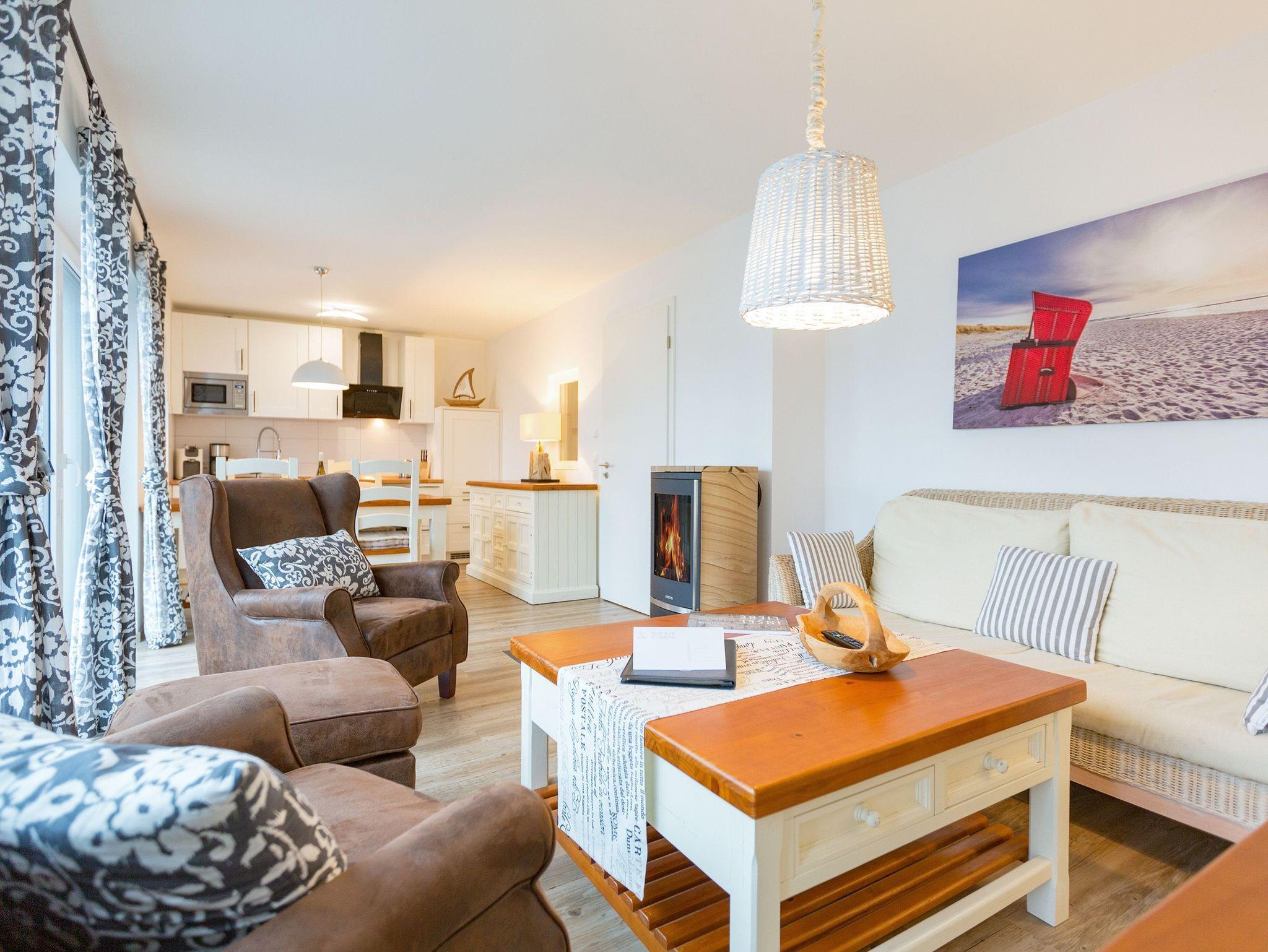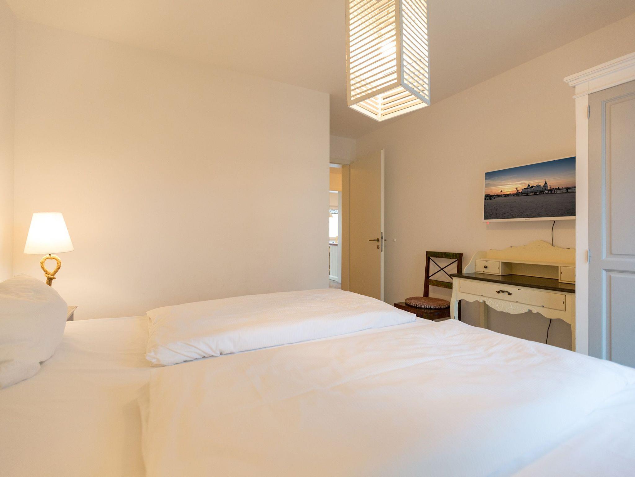 Träumen Sie nicht auch ab und an von einen kleinen Auszeit in ungewöhnlicher und ungewöhnlich schöner Umgebung? Dieses Appartement für bis zu 4 Personen [&] 1 Kleinkind ( bis 2 Jahre im Kinderreisebett) in der ersten Etage des Quartier Ahlbeck ist genau das Richtige für Liebhaber exquisiter Stilmöbel. Denn in diesem 80 Quadratmeter großen Ferienappartement erwartet Sie Landhausstil vom Feinsten. Der helle Wohnbereich mit der offenen Küche ist der ideale Rückzugsort, um neue Energie zu tanken. Ein bequemes Sofa aus Korb und die beiden großen Ohrensessel laden geradezu ein, sich in ihnen zu entspannen. Ein Kaminofen sorgt zusätzlich für Gemütlichkeit. Der Flat-TV besitzt einen Blue-Ray-Player. So wird das Urlaubsdomizil zum echten Heimkino. Durch die bodentiefen Fenster gelangen Sie auf einen lichtüberfluteten Süd-West-Balkon. Genießen Sie die Sonne und vergessen dabei einfach mal den Alltag. Lockt der Appetit, bietet die offene Wohnküche mit wunderschönem Essplatz alles, was das Herz des Hobbykochs höher schlagen lässt. Hochwertige Geräte vom Herd, über die Kaffeemaschine bis zur Mikrowelle und erlesenes Geschirr machen das Zubereiten und Genießen der Speisen zum Vergnügen. Die zwei Bäder sind geräumig und mit Dusche, Waschtisch und WC ausgestattet. Schalten Sie ab und kommen Sie zur Ruhe in der eigenen Finnischen Sauna. Danach bleischwer und völlig entspannt ins Bett fallen? Kein Problem. In den beiden Schlafzimmern warten bequeme Boxspringdoppelbetten (1,80 m x 2,00 m) nur darauf, Ihnen himmlische Träume zu bescheren. Auch hier sind Möbel und Wände wunderbar hell gehalten und geben den Zimmern ein luftig leichtes Ambiente. Große Schränke bieten viel Platz für Ihre Sachen. Damit Ihre Urlaubsauszeit so entspannend wie möglich ist, sind die Betten bei Ihrer Anreise bezogen und Handtücher liegen bereit.
