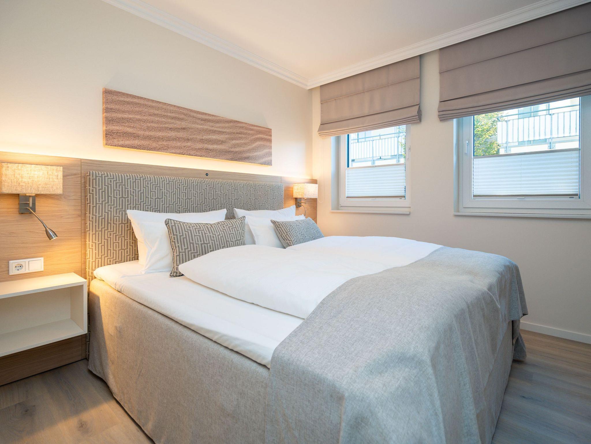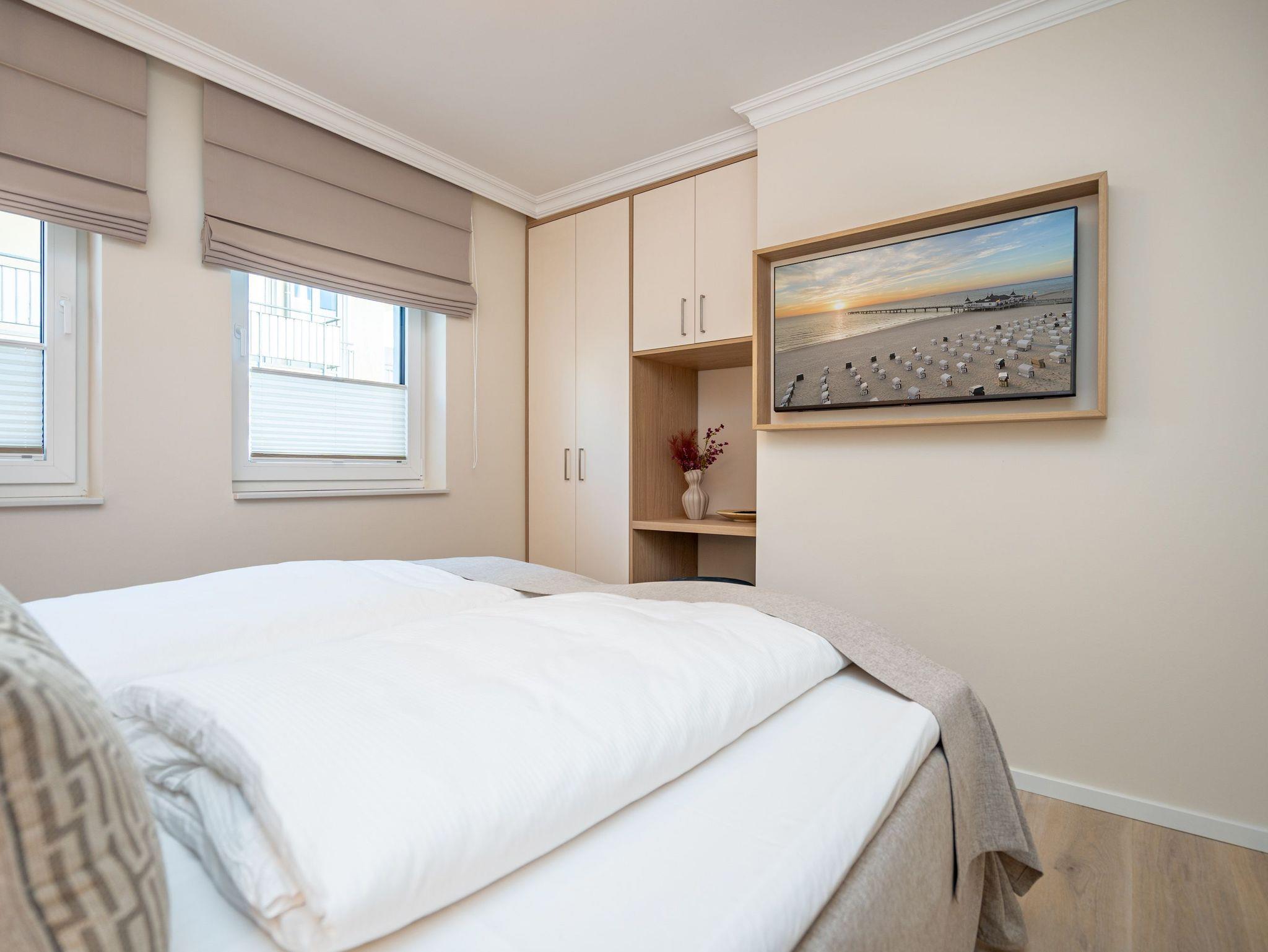 Ein stilvolles 3-Raum-Appartement mit 68 m² Wohnfläche im Hochparterre, das durch Helligkeit, klare Linien und eine wohnliche Atmosphäre überzeugt. Ideal für bis zu vier Personen, die Komfort und eine hochwertige Ausstattung zu schätzen wissen. Der offene Wohnbereich ist großzügig gestaltet und mit einer gemütlichen Sitzgruppe, Gas-Kamin (per Fernbedienung steuerbar) und Flat-TV ausgestattet ein Platz zum Entspannen und Wohlfühlen. Die moderne Küchenzeile bietet alles, was man für den Urlaub braucht: Backofen, Cerankochfeld, Mikrowelle, Spülmaschine und Kühlschrank mit Gefrierfach. Am angrenzenden Essplatz lässt sich gemeinsam genießen und verweilen. Besonderes Highlight ist die großzügige Süd-Ost-Terrasse mit etwa 50 m² Fläche. Sie ist möbliert und bietet viel Raum für entspannte Stunden im Freien ob beim Frühstück in der Sonne oder beim Abendessen an der frischen Luft. Beide Schlafzimmer verfügen über komfortable Boxspringbetten (180 × 200 cm), geräumige Kleiderschränke und je einen Flat-TV. Das innenliegende Bad ist mit Dusche, Waschtisch und WC ausgestattet, ein separates Gäste-WC sorgt für zusätzlichen Komfort. Zur Wohnung gehört ein Stellplatz in der Tiefgarage (Durchfahrthöhe 1,95m), WLAN steht kostenfrei zur Verfügung. Ein modernes Appartement mit großzügiger Terrasse ideal für Gäste, die Wert auf Stil, Licht und Wohnqualität legen.