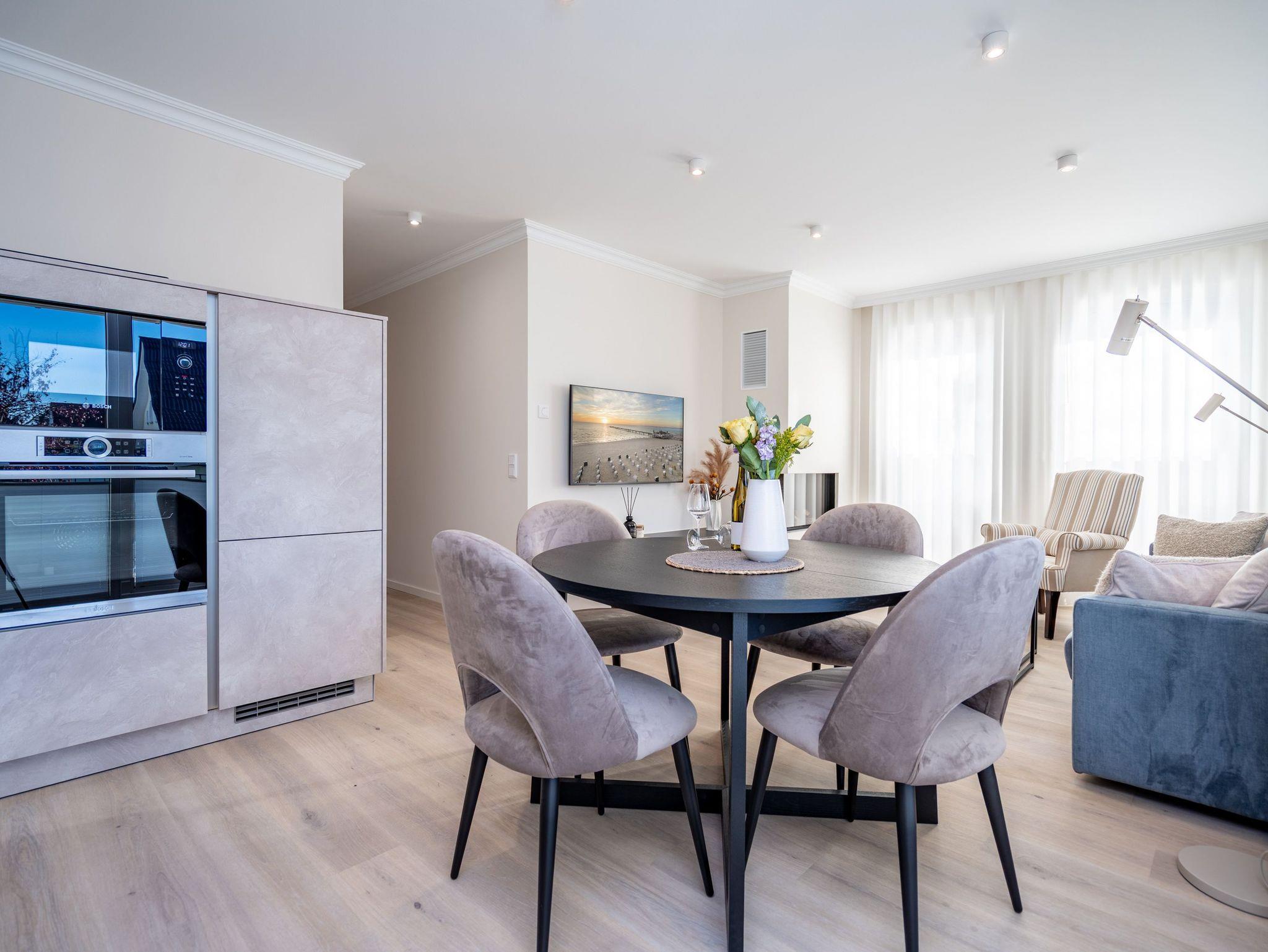 Ein stilvolles 3-Raum-Appartement mit 68 m² Wohnfläche im Hochparterre, das durch Helligkeit, klare Linien und eine wohnliche Atmosphäre überzeugt. Ideal für bis zu vier Personen, die Komfort und eine hochwertige Ausstattung zu schätzen wissen. Der offene Wohnbereich ist großzügig gestaltet und mit einer gemütlichen Sitzgruppe, Gas-Kamin (per Fernbedienung steuerbar) und Flat-TV ausgestattet ? ein Platz zum Entspannen und Wohlfühlen. Die moderne Küchenzeile bietet alles, was man für den Urlaub braucht: Backofen, Cerankochfeld, Mikrowelle, Spülmaschine und Kühlschrank mit Gefrierfach. Am angrenzenden Essplatz lässt sich gemeinsam genießen und verweilen. Besonderes Highlight ist die großzügige Süd-Ost-Terrasse mit etwa 50 m² Fläche. Sie ist möbliert und bietet viel Raum für entspannte Stunden im Freien ? ob beim Frühstück in der Sonne oder beim Abendessen an der frischen Luft. Beide Schlafzimmer verfügen über komfortable Boxspringbetten (180 × 200 cm), geräumige Kleiderschränke und je einen Flat-TV. Das innenliegende Bad ist mit Dusche, Waschtisch und WC ausgestattet, ein separates Gäste-WC sorgt für zusätzlichen Komfort. Zur Wohnung gehört ein Stellplatz in der Tiefgarage (Durchfahrthöhe 1,95m), WLAN steht kostenfrei zur Verfügung. Ein modernes Appartement mit großzügiger Terrasse ? ideal für Gäste, die Wert auf Stil, Licht und Wohnqualität legen.