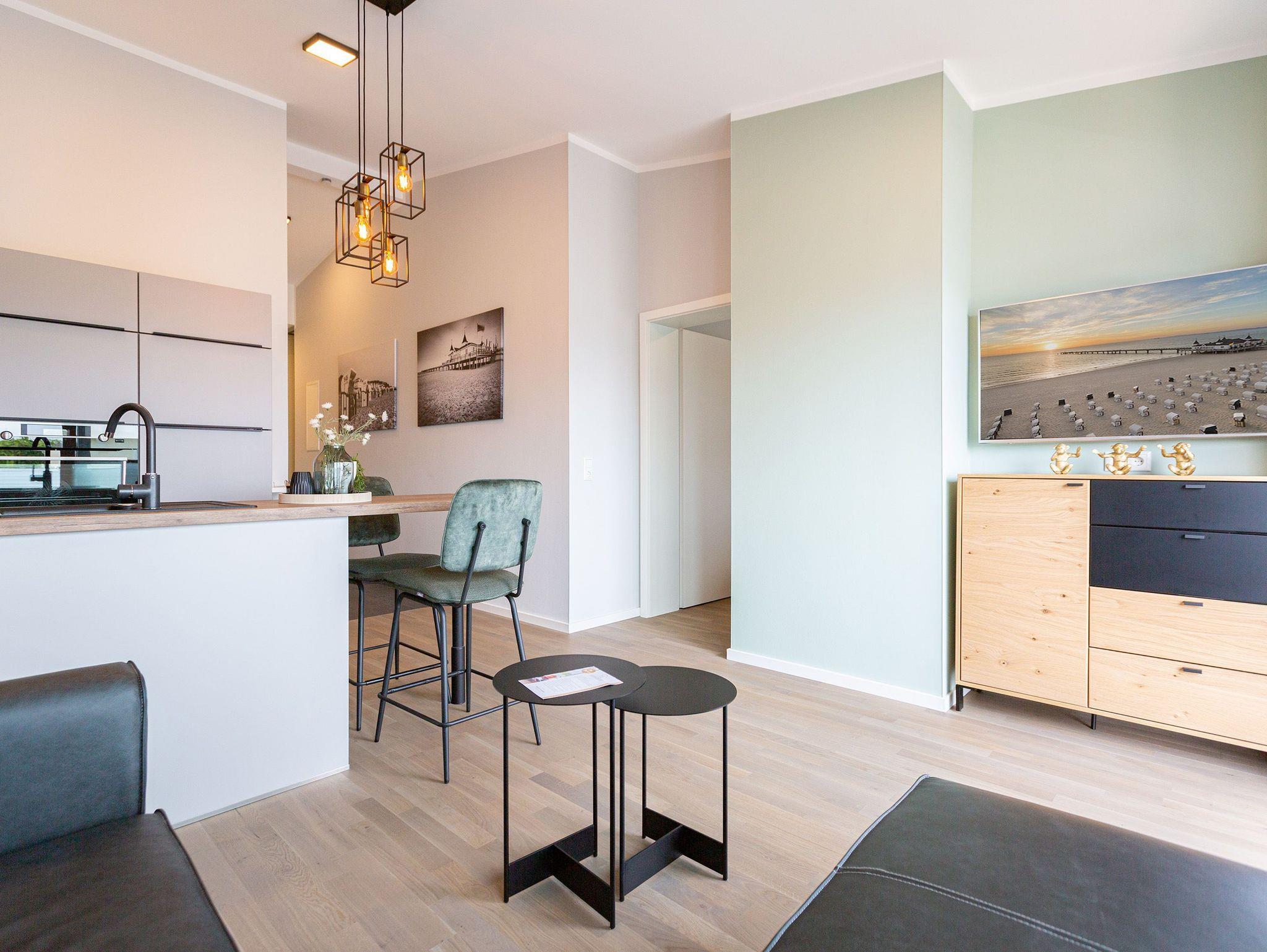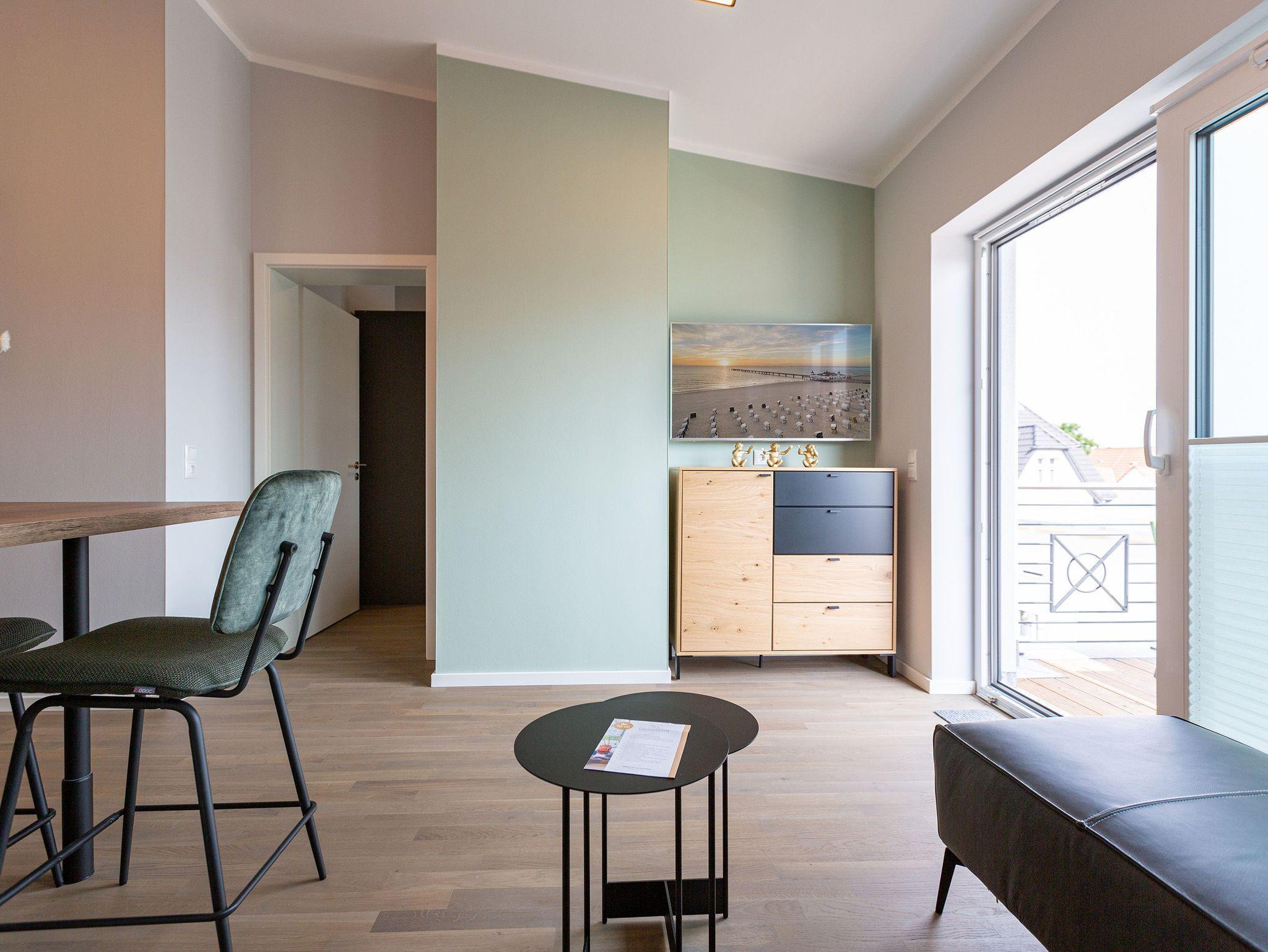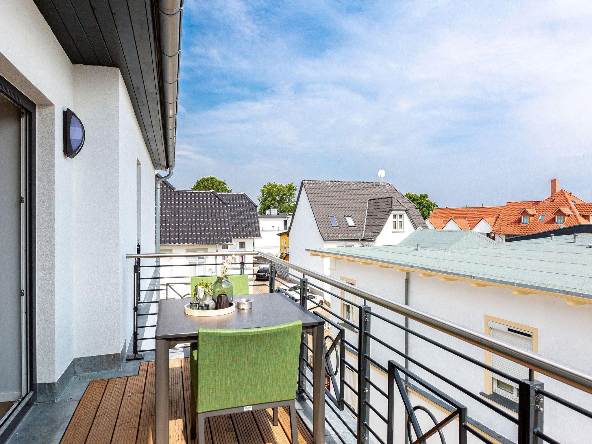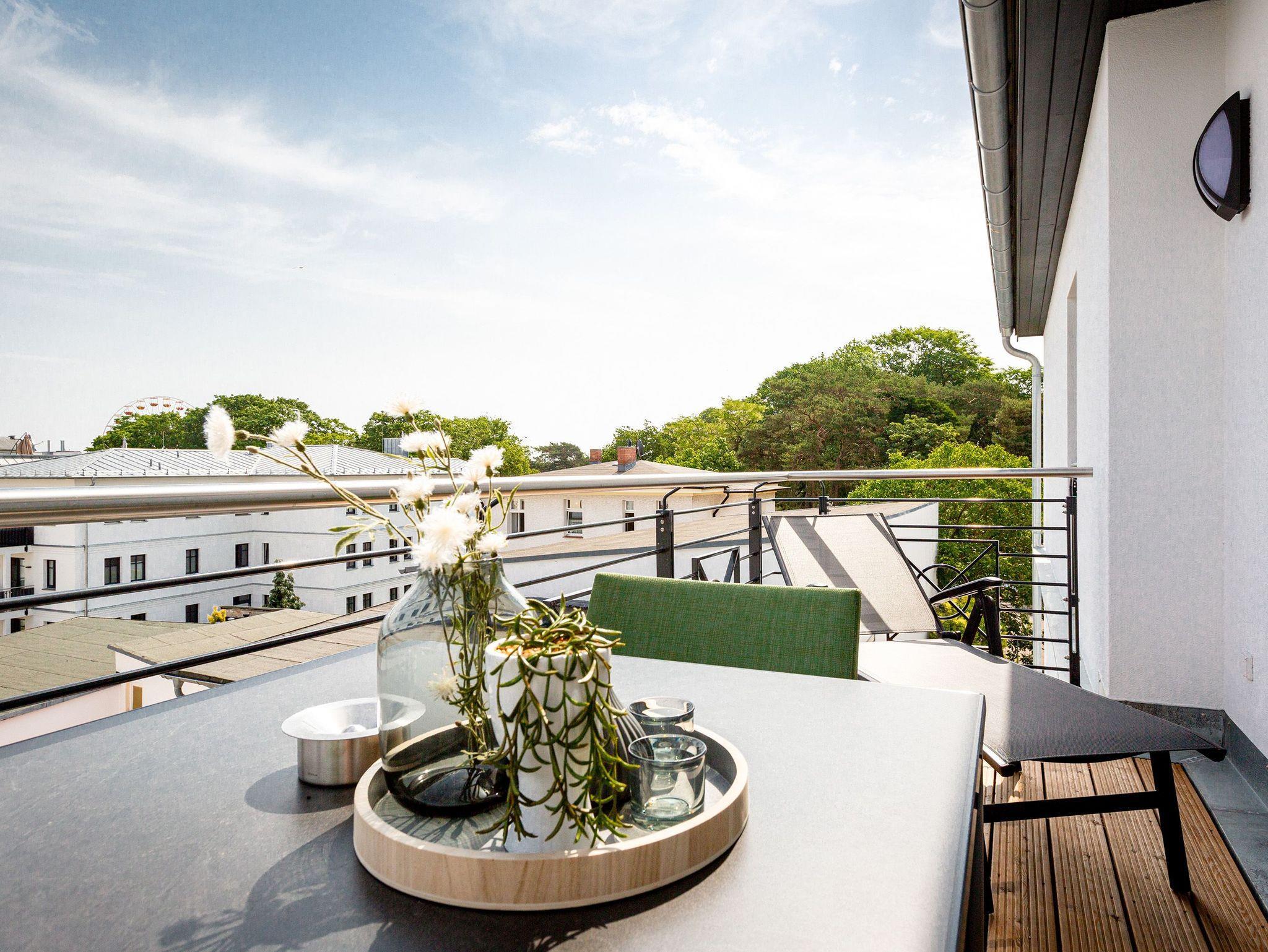 Klein, aber fein und absolut kuschelig ist dieses 46 Quadratmeter große Zwei-Raum-Appartement für zwei Personen direkt unter dem Dach im 3. Obergeschoss des Quartiers Frohsinn. Wer sich zu zweit oder auch allein mal in aller Ruhe für eine Auszeit an der Ostsee in ein wunderschönes Ambiente zurückziehen möchte, findet hier ein kleines Wohlfühlparadies vor. Der Blick vom sonnigen Balkon (8 Quadratmeter groß) mit Gartenmöbeln und Liegestuhl offeriert einen traumhaften Blick über die Dächer des altehrwürdigen Seebades. Das Wohnzimmer ist dank der großen Fenster hell und freundlich. Kuscheln Sie bei einem spannenden Film auf dem Flat-TV auf der Ledercouch oder lassen Sie es sich am gemütlichen Essplatz gut gehen. Eine offene Küchenzeile bietet alles Nötige zum Kochen, Backen und Zubereiten. Ihnen stehen hochwertige Markengeräte wie ein Induktionsherd, eine Spülmaschine, ein Kühlschrank mit Gefrierfach, edles Geschirr und vieles mehr zur Verfügung. Modernes Design durchzieht jeden Winkel dieser schönen Wohnung. Auch das Schlafzimmer ist modern mit einem bequemen Boxspringdoppelbett (1,60 m x 2,00 m), einem Schrank, einer Kommode und ebenfalls mit einem Flat-TV eingerichtet. Das Bett ist bei Ihrer Anreise schon bezogen und das WLAN können Sie kostenfrei nutzen. Das Bad mit Dusche, Waschtisch und WC ist geräumig und hält eine kleine Überraschung bereit. Hier können Sie in der Finnischen Sauna so richtig aus- und entspannen. Handtücher liegen natürlich für das Wellness-Vergnügen sowie für Ihren Aufenthalt bereit. In der Tiefgarage gibt es einen Stellplatz für Ihr Auto und einen separaten Raum für Fahrräder.