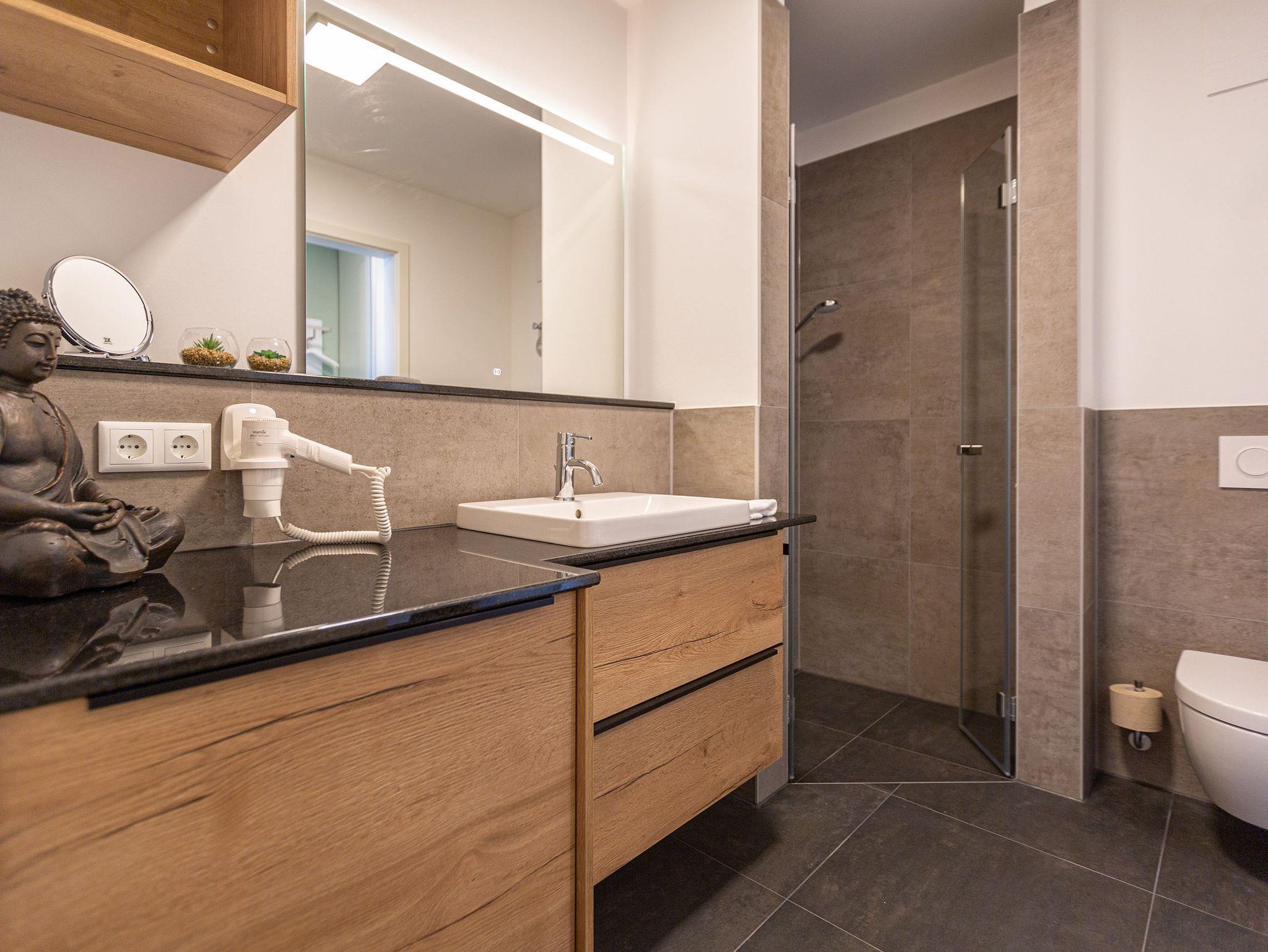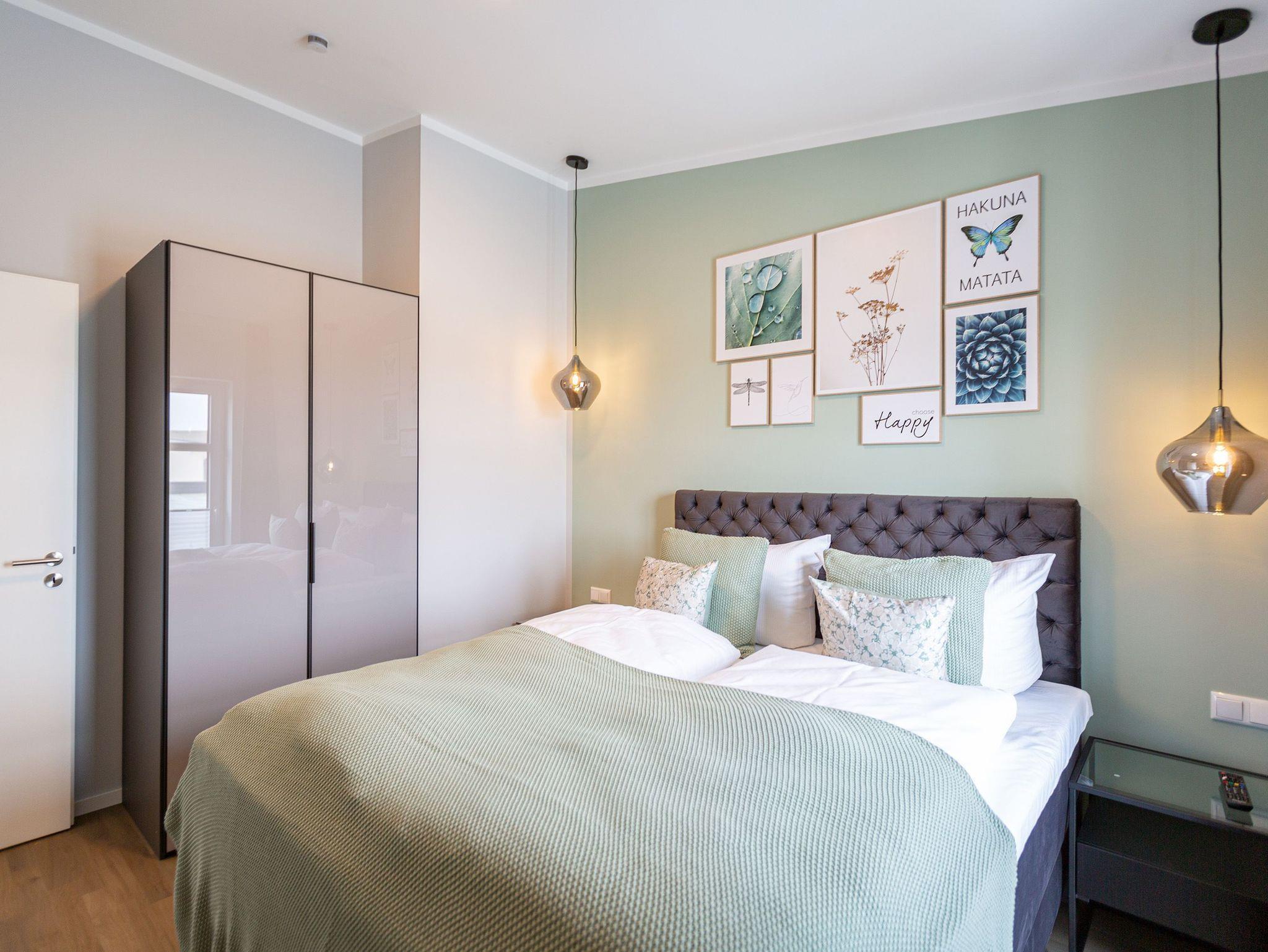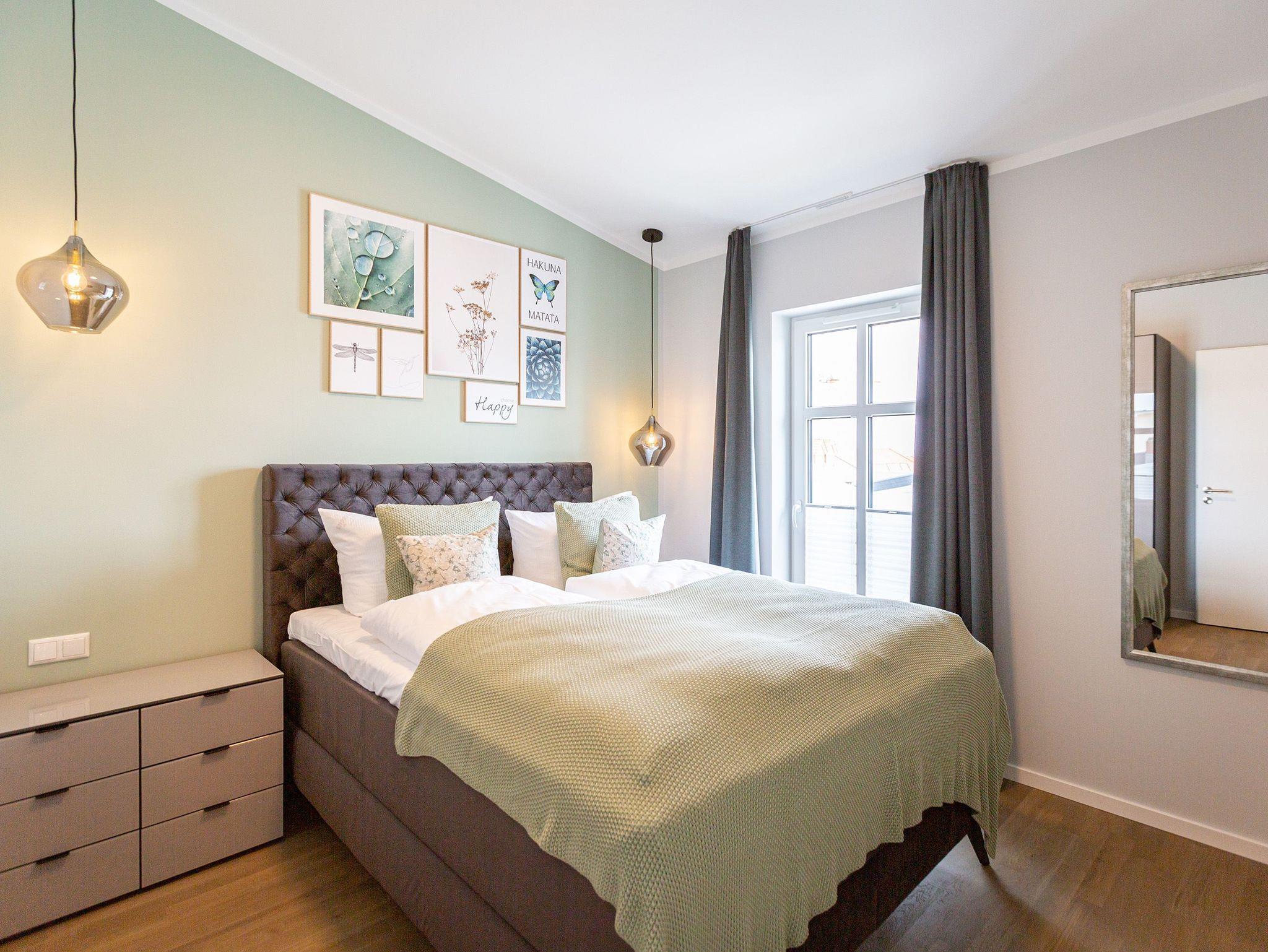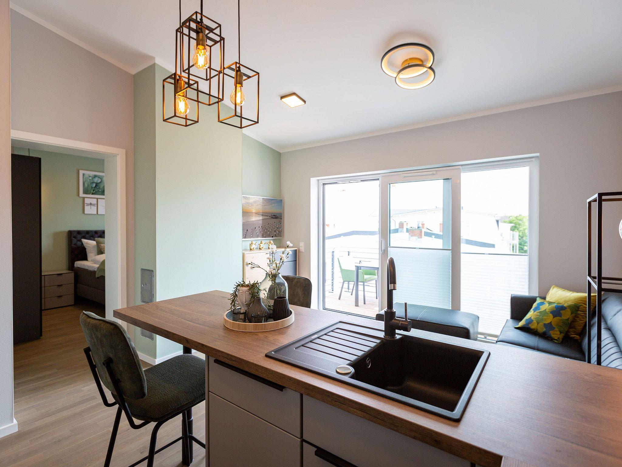 Klein, aber fein und absolut kuschelig ist dieses 46 Quadratmeter große Zwei-Raum-Appartement für zwei Personen direkt unter dem Dach im 3. Obergeschoss des Quartiers Frohsinn. Wer sich zu zweit oder auch allein mal in aller Ruhe für eine Auszeit an der Ostsee in ein wunderschönes Ambiente zurückziehen möchte, findet hier ein kleines Wohlfühlparadies vor. Der Blick vom sonnigen Balkon (8 Quadratmeter groß) mit Gartenmöbeln und Liegestuhl offeriert einen traumhaften Blick über die Dächer des altehrwürdigen Seebades. Das Wohnzimmer ist dank der großen Fenster hell und freundlich. Kuscheln Sie bei einem spannenden Film auf dem Flat-TV auf der Ledercouch oder lassen Sie es sich am gemütlichen Essplatz gut gehen. Eine offene Küchenzeile bietet alles Nötige zum Kochen, Backen und Zubereiten. Ihnen stehen hochwertige Markengeräte wie ein Induktionsherd, eine Spülmaschine, ein Kühlschrank mit Gefrierfach, edles Geschirr und vieles mehr zur Verfügung. Modernes Design durchzieht jeden Winkel dieser schönen Wohnung. Auch das Schlafzimmer ist modern mit einem bequemen Boxspringdoppelbett (1,60 m x 2,00 m), einem Schrank, einer Kommode und ebenfalls mit einem Flat-TV eingerichtet. Das Bett ist bei Ihrer Anreise schon bezogen und das WLAN können Sie kostenfrei nutzen. Das Bad mit Dusche, Waschtisch und WC ist geräumig und hält eine kleine Überraschung bereit. Hier können Sie in der Finnischen Sauna so richtig aus- und entspannen. Handtücher liegen natürlich für das Wellness-Vergnügen sowie für Ihren Aufenthalt bereit. In der Tiefgarage gibt es einen Stellplatz für Ihr Auto und einen separaten Raum für Fahrräder.