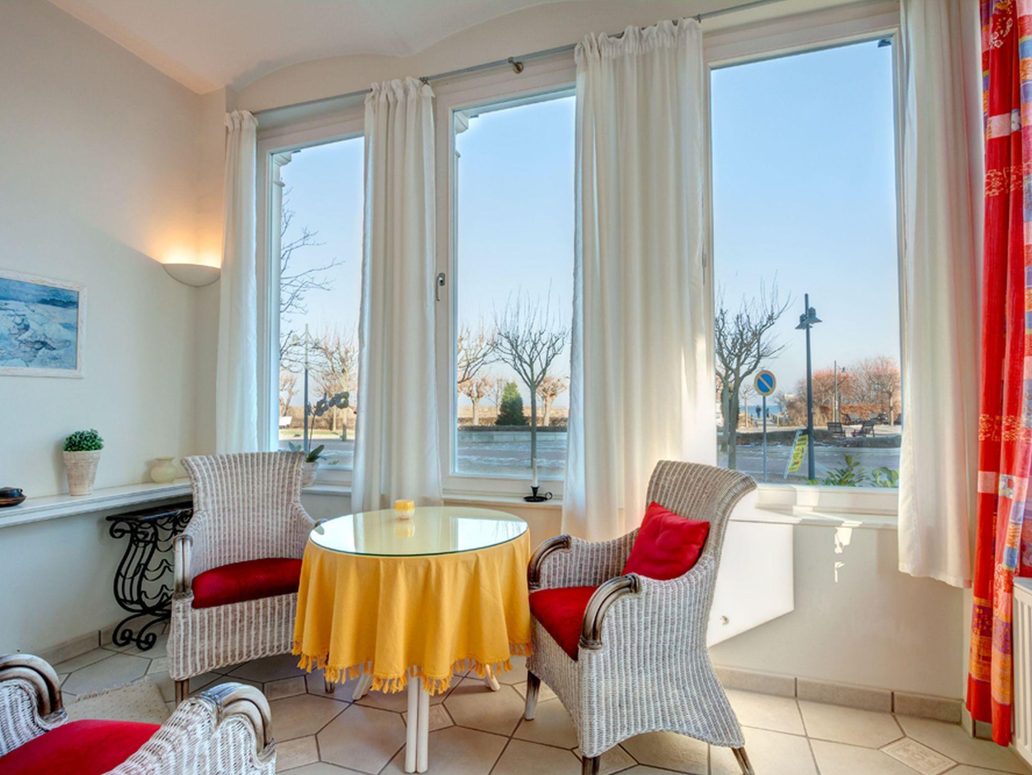 Willkommen in dieser modernen, hellen 2-Raum-Nichtraucher-Ferienwohnung im Erdgeschoss einer sanierten Villa im weißen Landhausstil. Die Wohnküche ist mit einer Couch, einem Tisch und vier Stühlen ausgestattet und bietet Unterhaltung durch einen Flachbild-TV, ein Radio mit CD-Player und einen DVD-Player.