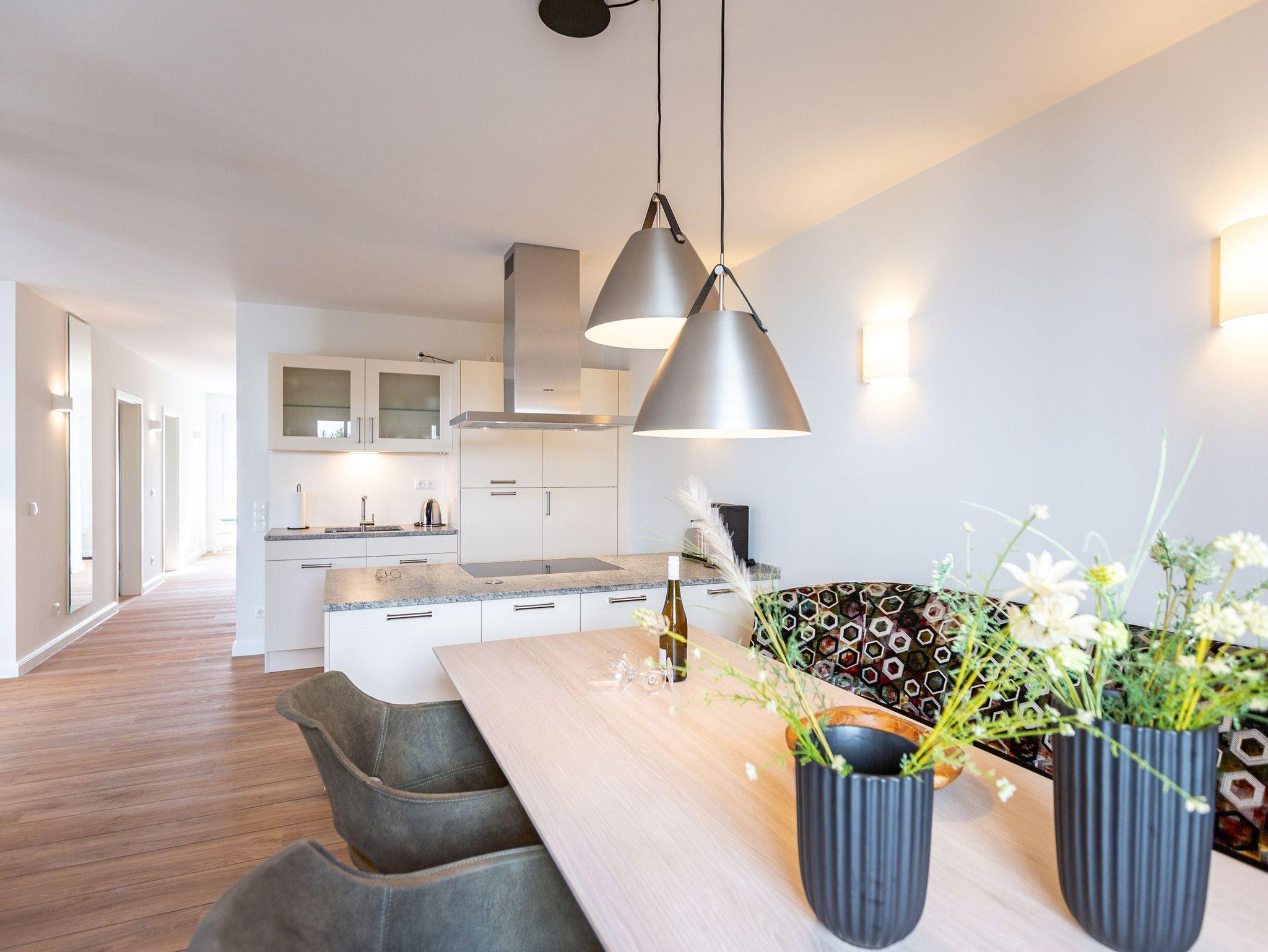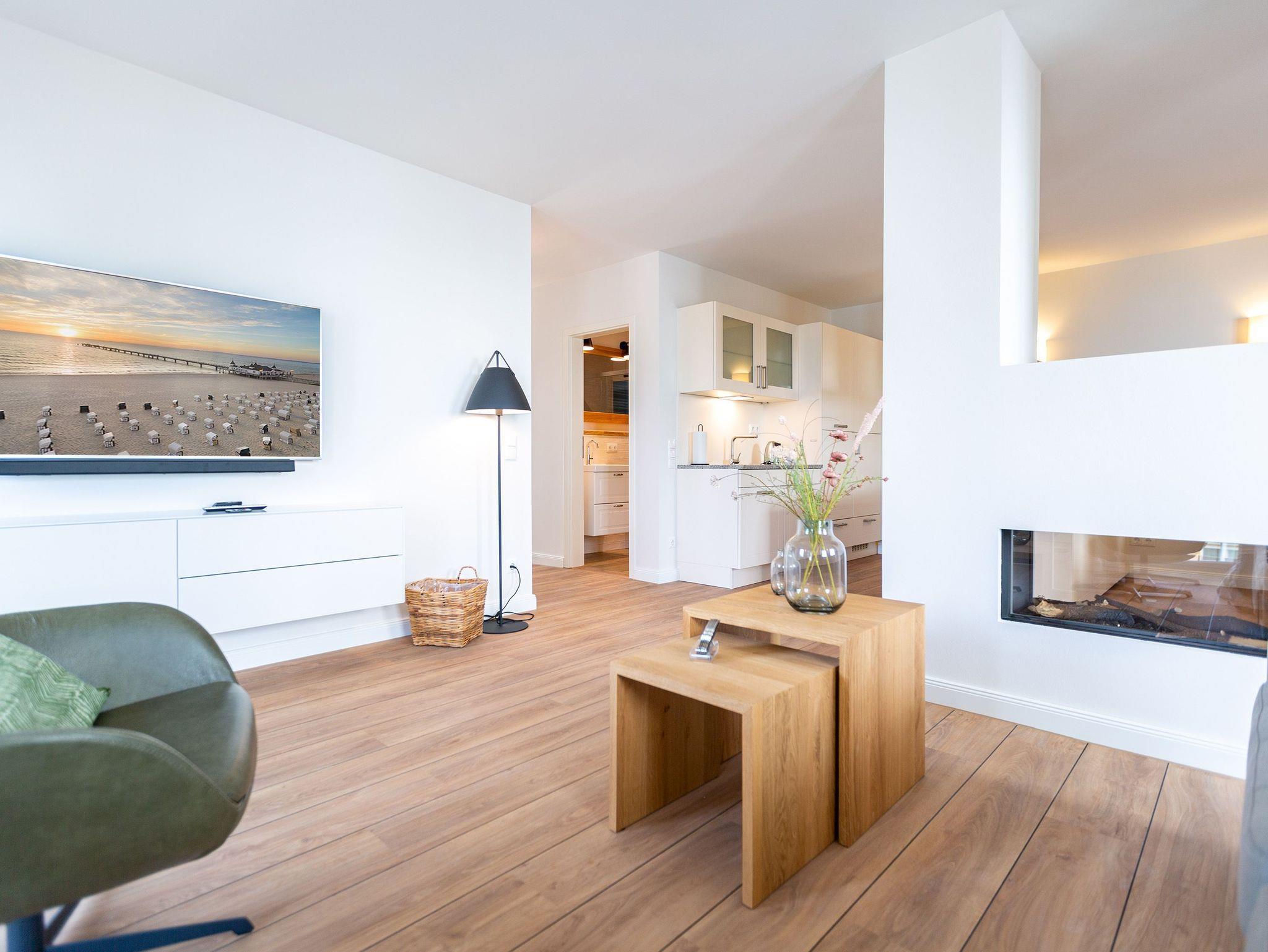 In diesen 2021 errichteten Häusern trifft Helligkeit auf Moderne und bietet Ihnen in seinen stilvoll eingerichteten Zwei- bis Drei-Zimmer Appartements Komfort auf höchster Ebene. Die offen gestalteten Wohn-Ess-Bereiche überzeugen durch ein stylisches Ambiente und ihr großzügiges Raumkonzept. Die teilweise mit Kochinseln ausgestatteten Küchen integrieren sich perfekt in den ebenso schlichten wie modernen Wohnraum. Alle Appartements verfügen über zwei Bäder oder ein Bad und ein zusätzliches Gäste-WC. Um Ihre Auszeit am Meer zusätzlich zu verschönern, wurden alle Appartements mit Gaskamin und Finnischer Sauna ausgestattet. Genießen Sie von den großzügigen Balkonen und Terrassen den Ausblick auf die parkähnliche Grünanlage oder verbringen Sie Ihren Abend auf dem frei zur Verfügung stehenden Grillplatz mit Sitzecke und Grill. Ein kostenloser PKW-Stellplatz in der Tiefgarage (Einfahrtshöhe 1,95m, Anfahrt über die Straße ?Kieferngrund? Höhe Hausnummer 17) gehört ebenso zum Komfort dieser Appartement-Häuser wie kostenfreies W-Lan. Für E-Autos steht am Objekt eine E-Ladesäule mit 2 Ladeplätzen (gesamt 22 kW) auf dem Grundstück kostenpflichtig zur Verfügung. Eine Waschmaschine und ein Trockner können Sie gegen Gebühr über die kostenlose App (Android [&] Apple) WeWash nutzen.