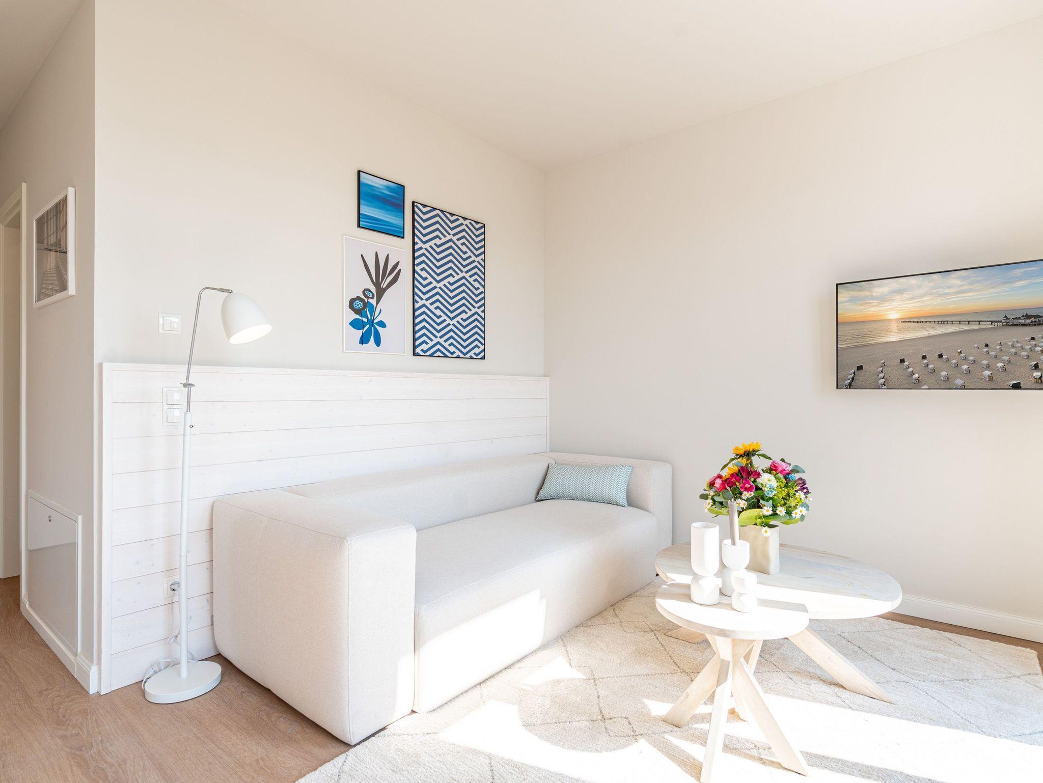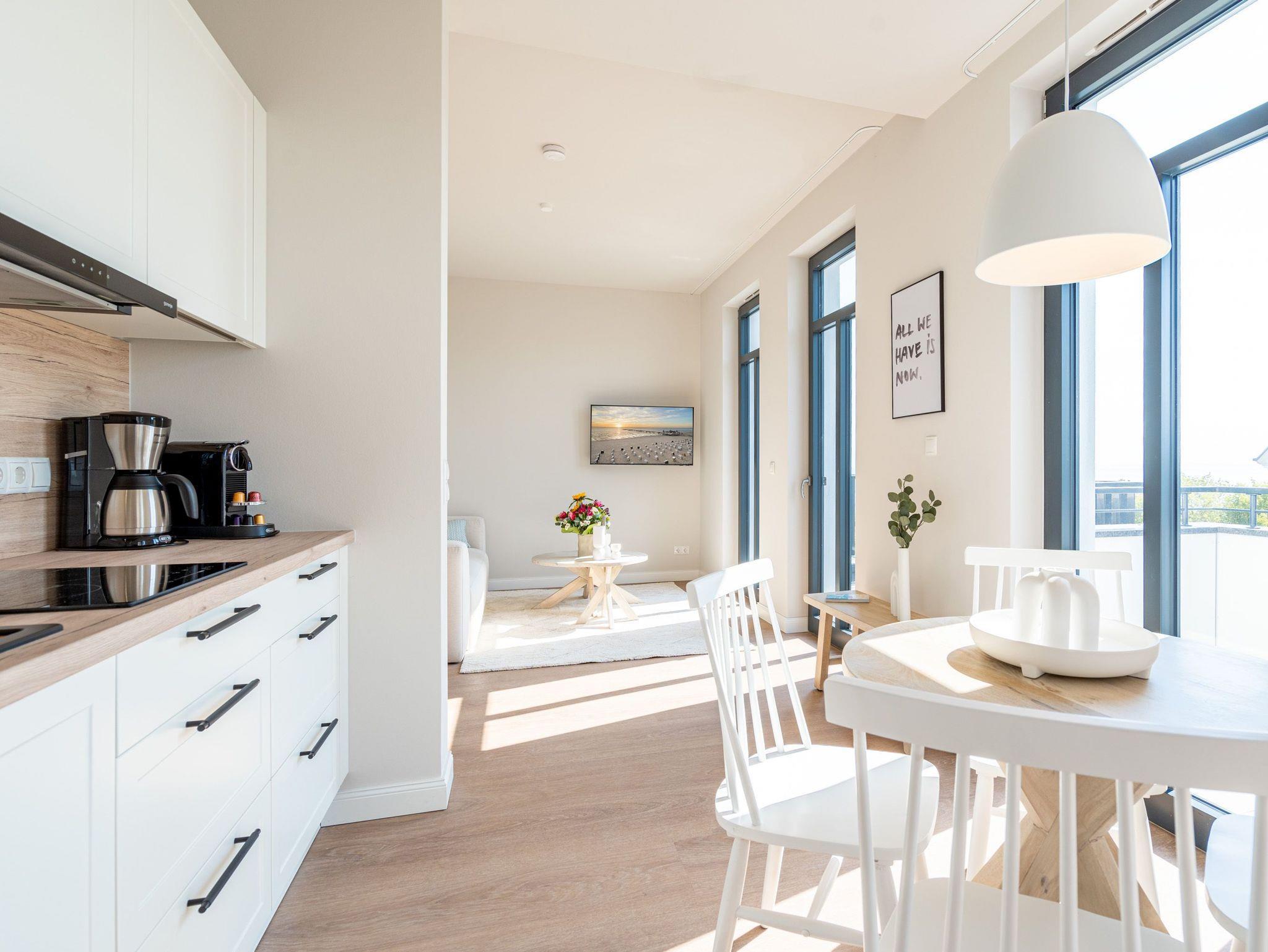 Ein absolutes Urlaubsparadies für zwei Personen mit viel Platz für entspannte Urlaubsträume und Urlaubsaussichten bietet das stilvolle Zwei-Zimmer-Appartement 3.6 (Haus A) im 3. Oberschoss der Strandterrasse. Viel Licht erfüllt die 50 Quadratmeter vom Eingang bis hinaus auf die beiden Balkone. Vom Innenarchitekten konzipiert, strahlt diese kuschelige Wohnung viel Ruhe und Harmonie aus. Kommen Sie runter, schalten Sie ab und genießen Sie von einem der beiden Balkone aus, den wundervoll weiten Blick über die Ostsee. Zum Süd-Osten hin ausgerichtet, können Sie von hier aus die romantischsten Sonnenaufgänge erleben. Durch die bodentiefen Fenster wird das Drinnen zum neuen Draußen ? selbst wenn das Meer einmal stürmisch tost. Die Einrichtung ist stylisch und exklusiv. Von der Stange ist hier nichts. Machen Sie es sich auf dem Sofa bequem. Schalten Sie bei einem spannenden Film auf dem 43-Zoll-Flachbildfernseher ab. Und geben Sie sich der Gelassenheit des süßen Nichtstuns hin. Kochen Sie gemeinsam in der zum Wohnzimmer hin offenen und voll ausgestatteten Küche. 3-Platten-Induktionsherd, Kühlschrank, Kaffeemaschine, Geschirrspülmaschine ? alles steht zu Ihrer Verfügung. Ein gemütlicher Esstisch bietet ausreichend Platz für Ihre Mahlzeiten. Vom Wohnzimmer aus haben Sie Zugang zum ersten Balkon mit einem Loungesessel. Auch die Nächte werden hier zum erholsamen Vergnügen. Dafür sorgt das bequeme Boxspringdoppelbett (1,80 m x 2,00 m). Es gibt einen geräumigen Kleiderschrank und ebenfalls einen 43-Zoll-Flachbildfernseher. Machen Sie die riesigen Schiebefenster weit auf und lassen Sie schon morgens die frische Ostseeluft hinein. Oder treten Sie gleich nach dem Aufstehen auf den zweiten Balkon hinaus und starten mit einem weiten Blick in den neuen Urlaubstag. Das innenliegende Bad ist mit einer Dusche, einem Waschtisch und einer Toilette ausgestattet. Ein reservierter PKW-Stellplatz in der Tiefgarage sorgt dafür, dass Sie Ihr Auto unbeschwert abstellen können. Erleben Sie unvergesslich schöne Tage am Meer in einem Urlaubsdomizil, das unvergleichlich schön ist.