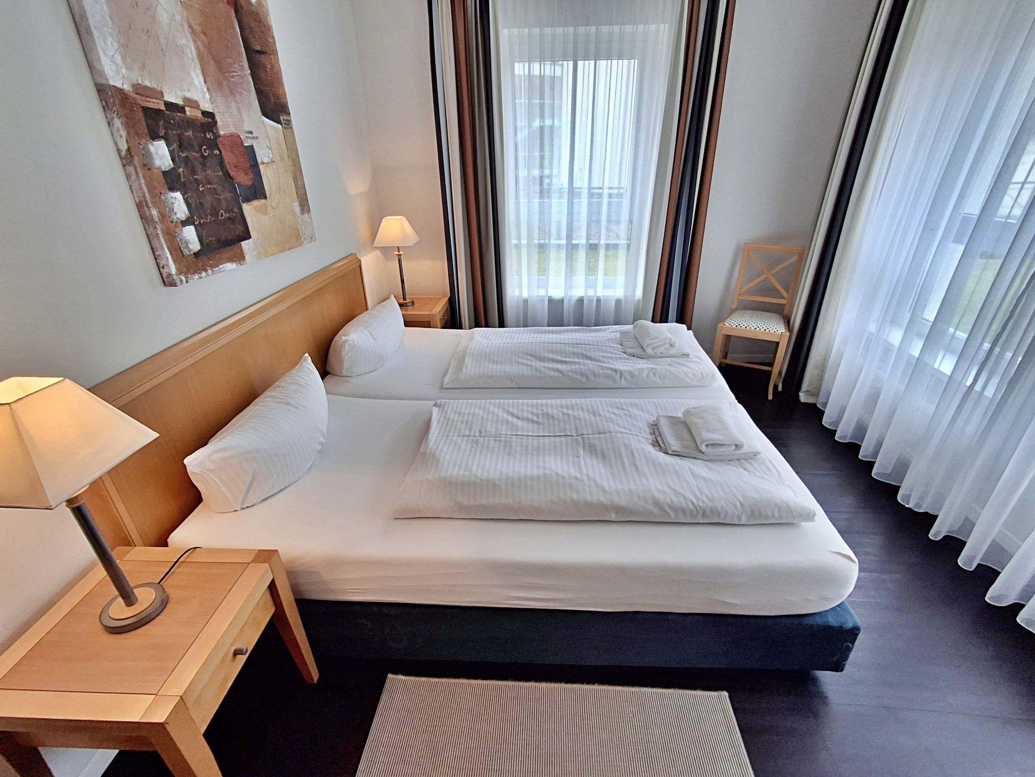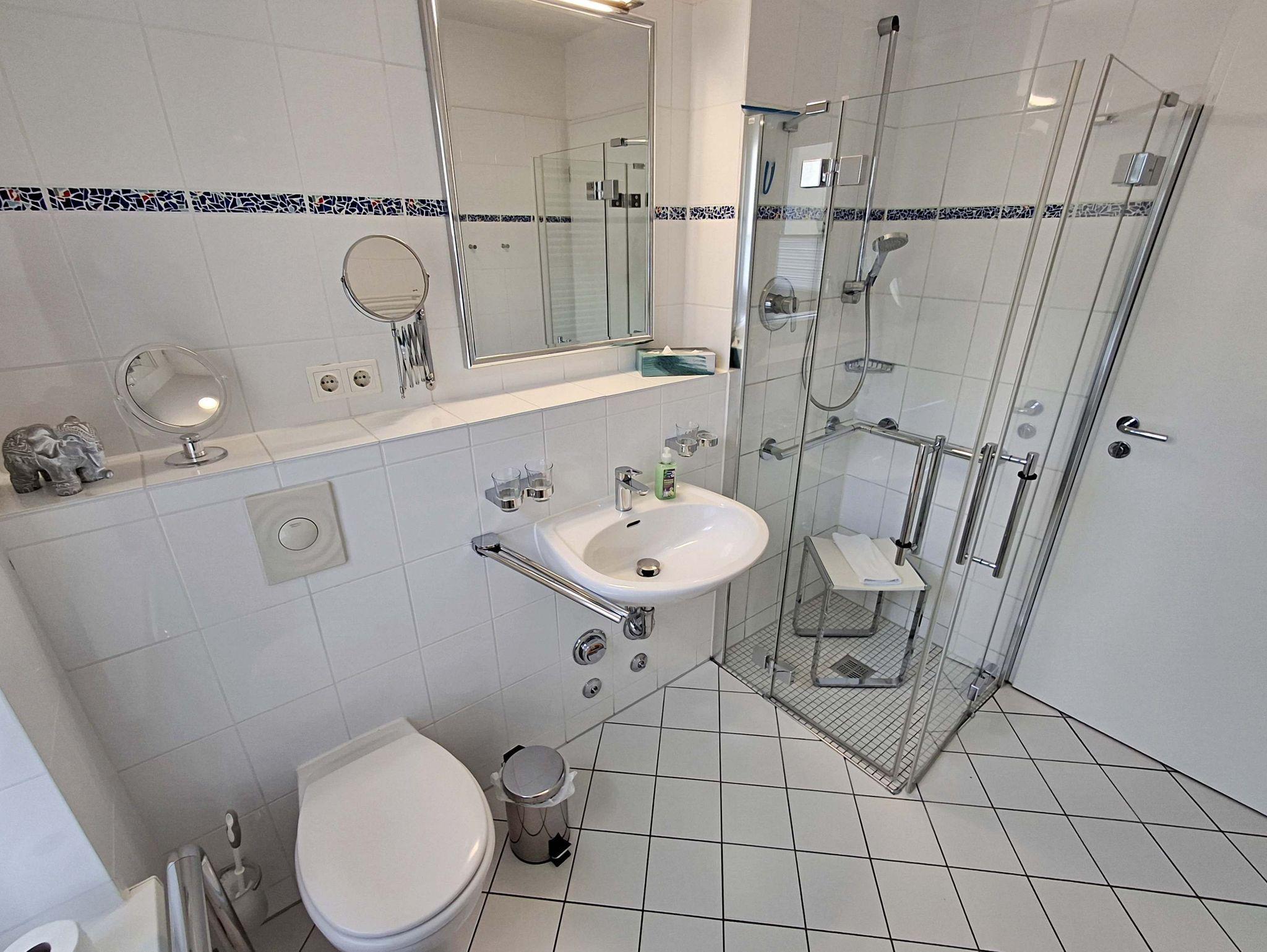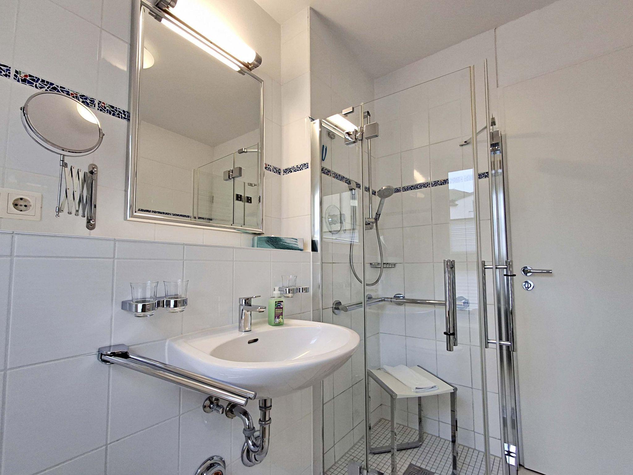 Die 54 qm große 2-Raum-Ferienwohnung befindet sich im Erdgeschoss der Appartementanlage und ist für 2 Erwachsene und ein Kleinkind ausgestattet. Die Wohnung verfügt über ein Wohnzimmer mit bequemen Sofas und eine Essecke mit 4 Stühlen. Für die Unterhaltung sorgen ein Flachbild-TV und eine Stereoanlage. Die vollständig ausgestattete Küchenzeile mit Ceranherd, Backofen, Mikrowelle, Kühlschrank mit Gefrierfach und Geschirrspülmaschine lässt keine Wünsche offen. Im Schlafzimmer befinden sich ein Doppelbett, ein großer Kleiderschrank und ein Schreibtisch. Das Tageslicht-Bad ist mit ebenerdiger Dusche, WC, Kosmetikspiegel und Haarfön ausgestattet. Eine Terrasse lädt zum Sitzen und Verweilen ein. WLAN steht Ihnen kostenfrei zur Verfügung.