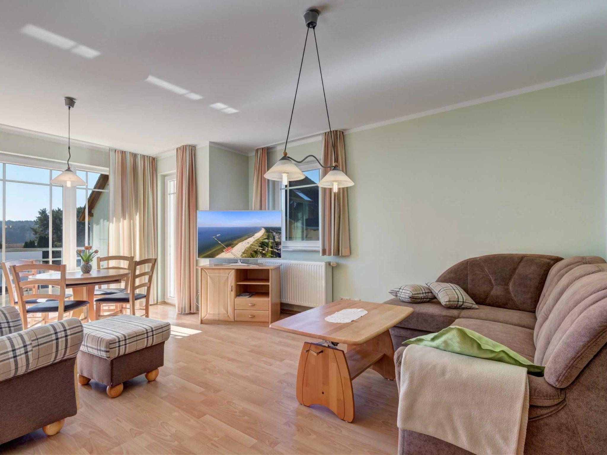 Die moderne 2-Raum NICHTRAUCHER-Ferienwohnung ist ca. 52 qm groß und befindet sich im Erdgeschoss eines Appartementhauses. Sie Wohnung verfügt über einen Schlafraum mit Doppelbett, Kleiderschrank und 2 Stühlen), einen kombinierten Wohn-u. Schlafraum mit einer Schlafcouch (1,60 x 2,00 m), Flachbild-TV, Radio mit CD-Player, Couchtisch & ein Sessel, Esstisch + 4 Stühle sowie einer Terrasse zur Südseite (morgens bis nachmittags Sonne). Die separate Küche ist ausgestattet mit einem Geschirrspüler, 4-Platten-Ceranherd, Backofen, Kühl-/Gefrierkombination, Kaffeemaschine, Toaster, Wasserkocher, Mikrowelle und Geschirr. Das Badezimmer verfügt über DU/WC sowie eine Fußbodenheizung und einen beleuchteten Kosmetikspiegel. Die gesamte Wohnung ist mit Fliesen und Laminat ausgestattet. Die Erstausstattung Bettwäsche und Handtücher ist inklusive. Auf Anfrage kann eine weitere Person auf dem Schlafsofa für 15 Euro pro Übernachtung zugebucht werden.