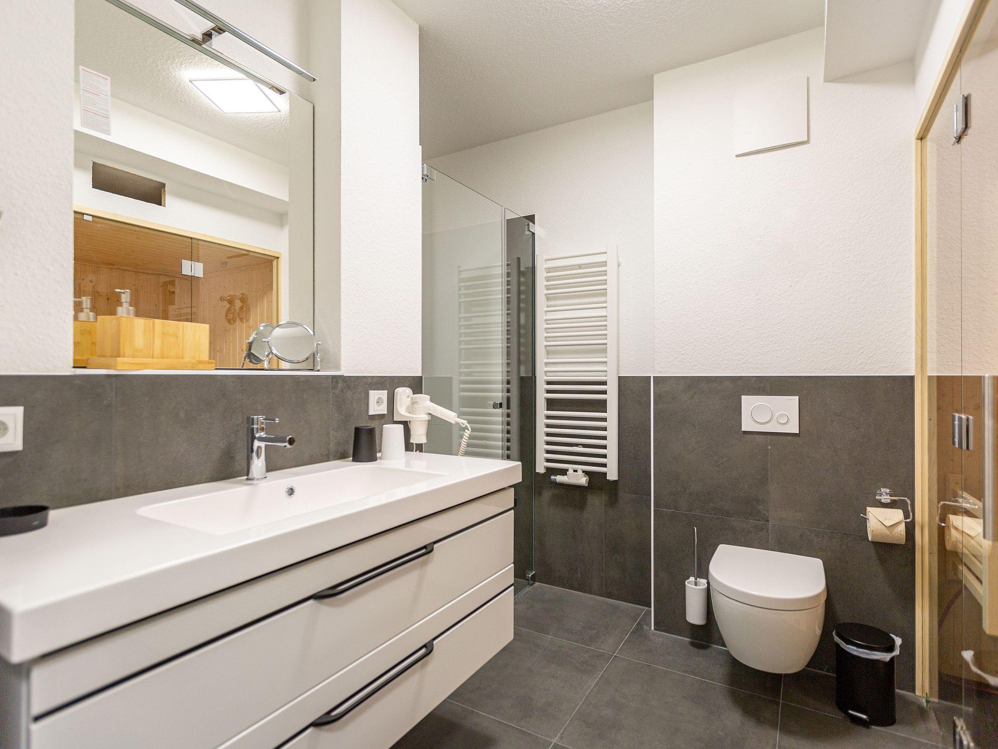 Mit viel Geschmack und einer Vorliebe für nordisches Design wurde dieses 54 Quadratmeter große Ferienparadies im Erdgeschoss des Quartiers Frohsinn eingerichtet. Die zwei Zimmer des Appartements sind eine kuschelige und zugleich stylische Wohlfühloase für zwei Personen. Das moderne Interieur besticht durch viel Eleganz. Ob Smart-TV oder schnelles und kostenfreies WLAN - Die Technik ist auf dem neuesten Stand. Das Wohnzimmer besitzt sogar einen Kamin. Freuen Sie sich auf entspannte Stunden zu zweit auf dem bequemen Sofa oder im Lesesessel. In das geräumige Wohnzimmer ist eine offene Küche mit einem Esstisch und zwei Stühlen intergiert. Voll ausgestattet mit hochwertigen Küchengeräten und edlem Geschirr bietet Sie allen Komfort. Vor dem Wohnzimmer befindet sich eine kleine Nord-Terrasse. Lassen Sie es sich auf den Gartenmöbeln oder den beiden Sonnenliegen gut gehen. Für erholsame Träume sorgt das behagliche Schlafzimmer. Auf dem komfortablen Boxspringdoppelbett (1,80 m x 2,00 m) schlafen Sie wie auf Wolken. Auch hier gibt es einen Smart-TV. Ein geräumiger Schrank bietet viel Platz. Das Badezimmer ist nicht einfach nur mit einer Dusche und einem WC ausgestattet. Hier wartet zudem eine kleine Finnische Sauna nur darauf, Sie an kühlen Inseltagen muschelig aufzuwärmen. Handtücher liegen für Sie bereit. Und auch die Betten sind bei Anreise schon bezogen. Zur Wohnung gehört ein Stellplatz in der Tiefgarage. Für ihre Fahrräder gibt es einen separaten Kellerraum.