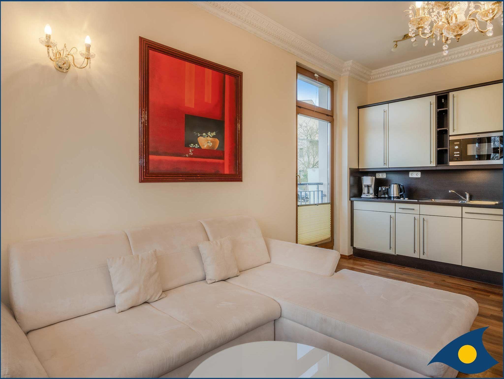 Die helle Wohnung verfügt über einen großzügigen Wohn-/Essbereich mit Zugang zur Terrasse, auf der Sie gemütlich dem bunten Treiben auf der Promenade zuschauen können. Die Aufbettung der 3. Person findet auf der Schlafcouch Platz. Die offene Küche ist mit einer Spülmaschine, einer Mikrowelle, einem 2 Platten-Ceranfeld und Kühlschrank ausgestattet.