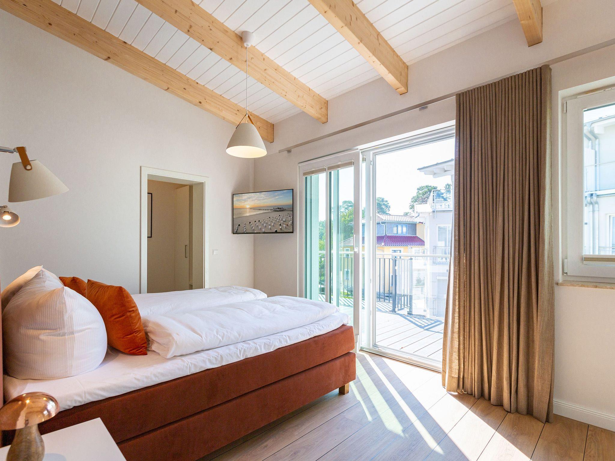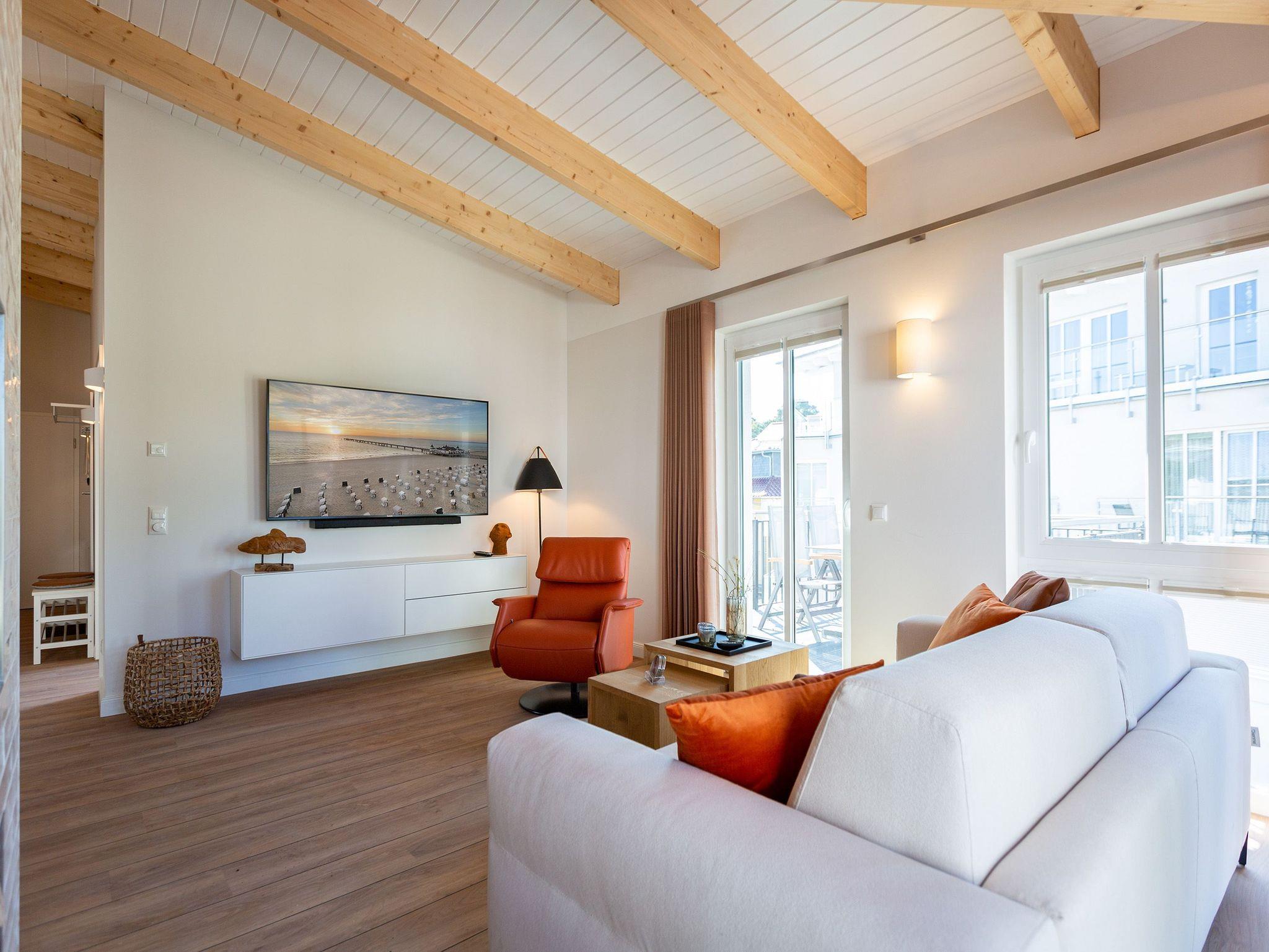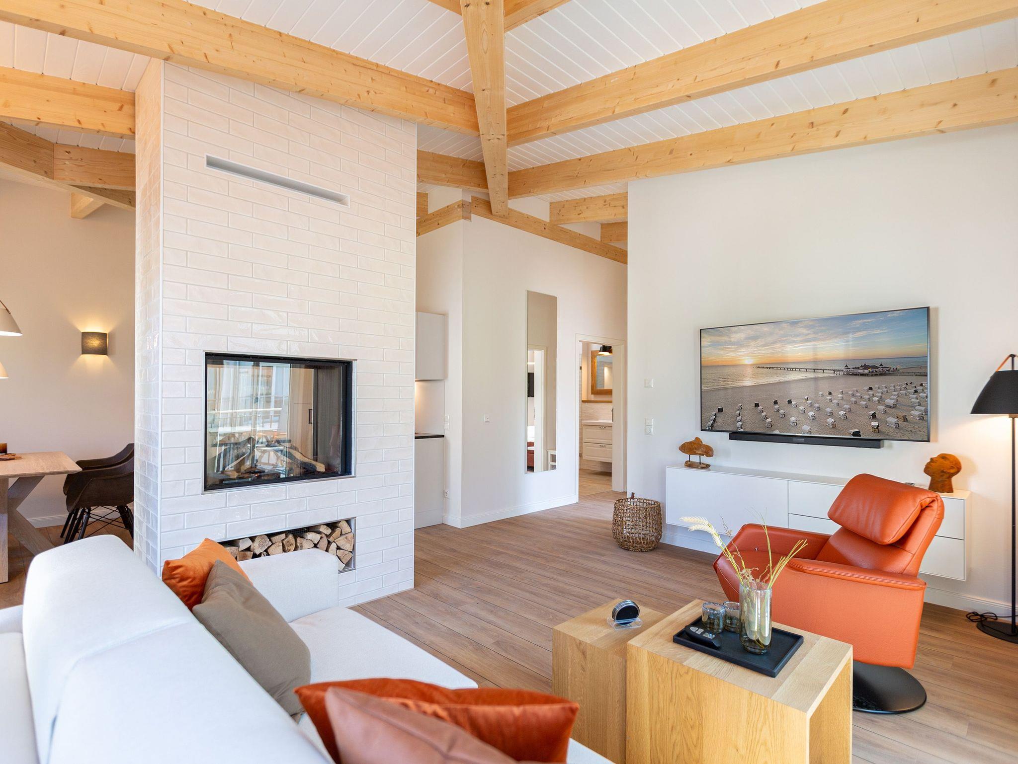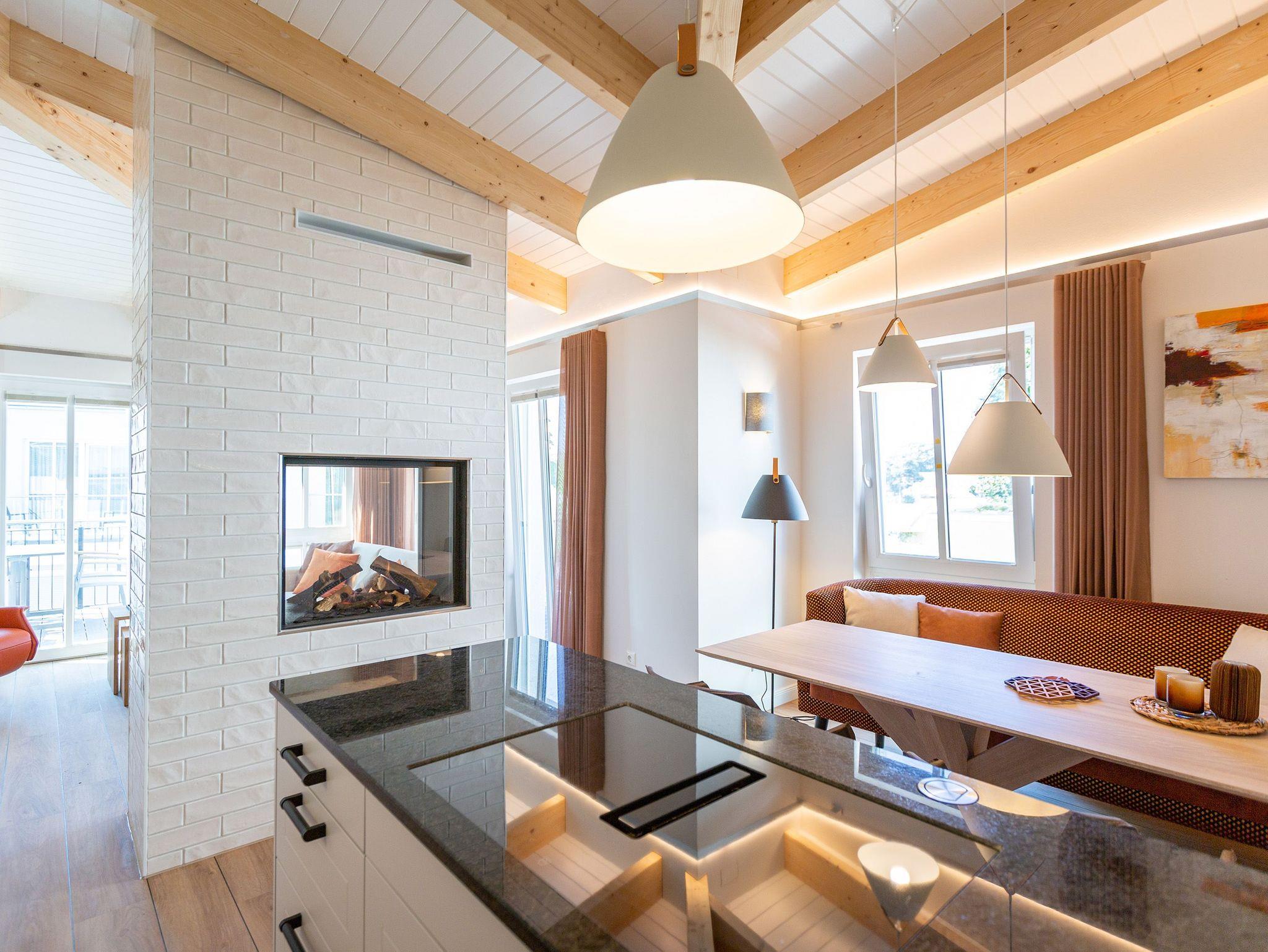 Sanfte Erdtöne und eine sichtbare Holzbalkendecke machen dieses 66qm-Appartement im Dachgeschoss zu einem außergewöhnlichen Aufenthaltsort für Ihren Ostseeurlaub. Ob Zeit zu Zweit, zu Dritt oder als kleine Familie mit Kleinkind (bis 2 Jahre im Kinderreisebett) - genießen Sie in diesem Zwei-Zimmer-Appartement jeglichen Komfort in Wohlfühlatmosphäre. Ein Materialmix aus Stein, Holz und edlen Stoffen wie Leder und Satin versprühen einen eleganten und wohligen Charme. Dank bodentiefer Fenster ist dieses Appartement besonders hell und freundlich, lässt sich durch Plissees und Vorhänge jedoch abdunkeln. Im Wohnbereich sorgt neben einem Flat-TV mit Soundsystem ein zweiseitiger Gaskamin für entsprechende Gemütlichkeit. Die offen gestaltete Küche mit ihren hochwertigen Elektro-Geräten inklusive Kochinsel mit Kochfeld mit integriertem Dunstabzug sorgen für angenehmen Komfort bei der Zubereitung Ihrer Speisen. Neben einem Gäste-WC verfügt das Duschbad mit barrierefreier Regendusche über ein Deckenfenster, welches für angenehmes Tageslicht sorgt. Selbstverständlich gehört auch in diesem Appartement eine Finnische Sauna zu Ihrem Urlaubskomfort. Damit Sie in Ihrem Urlaub auf nichts verzichten müssen, bietet das ans Schlafzimmer angrenzende Ankleidezimmer ausgiebigen Stauraum für Ihr Gepäck. Erholen Sie sich auf dem 1,80m x 2,00m komfortablen Boxspringbett vom Strandtag oder genießen Sie die letzten Sonnenstrahlen auf dem Süd-Balkon von Ihrem Schlaf- und Wohnzimmer aus. Einen zusätzlichen Schlafplatz bietet die komfortable Wohnlandschaft im Wohnzimmer. Kostenfreies W-Lan und ein Stellplatz in der hauseigenen Tiefgarage runden Ihren perfekten Urlaub auf der Insel Usedom ab. Auf Grund der großzügigen Platzgestaltung ist die Wohnung auch für Gäste mit Beeinträchtigungen geeignet.