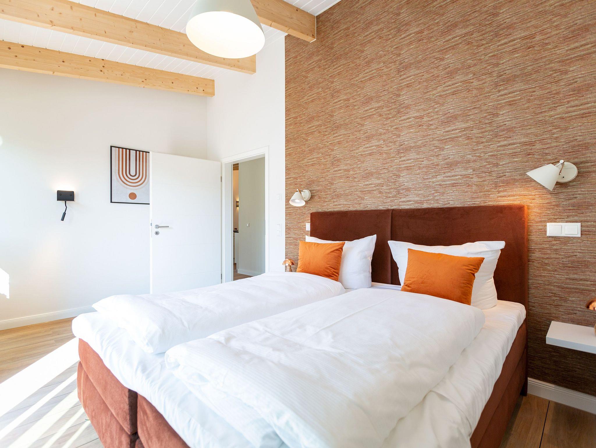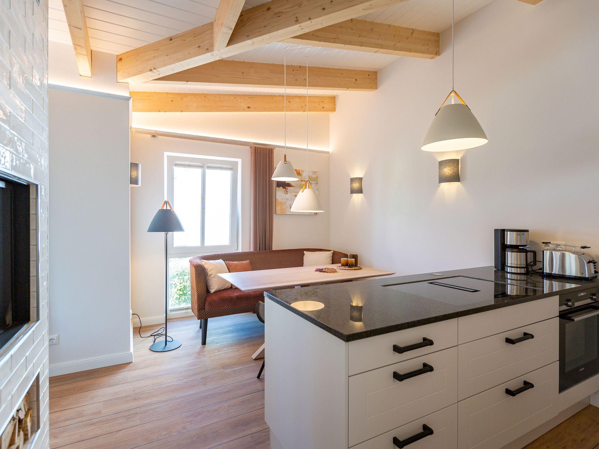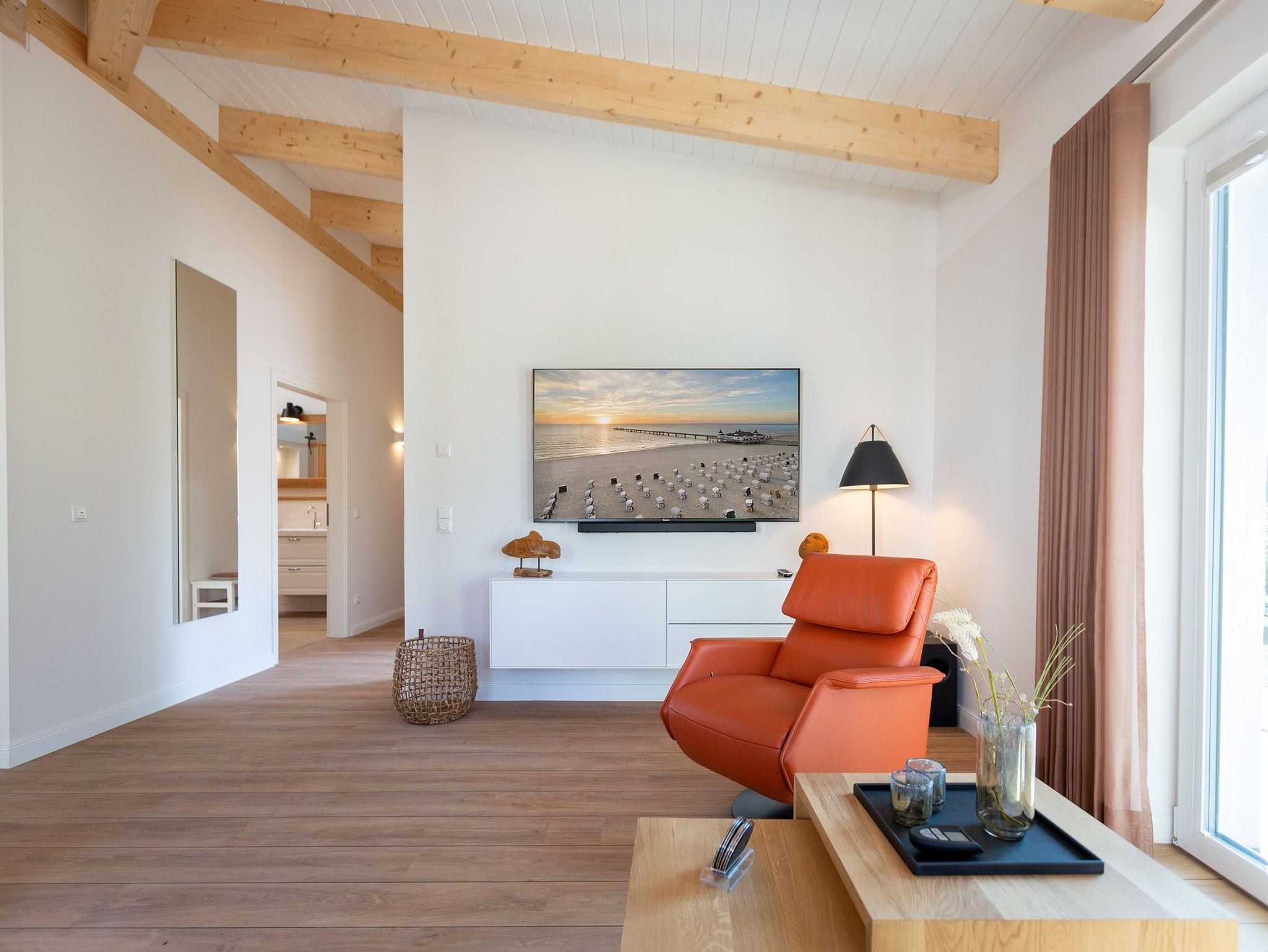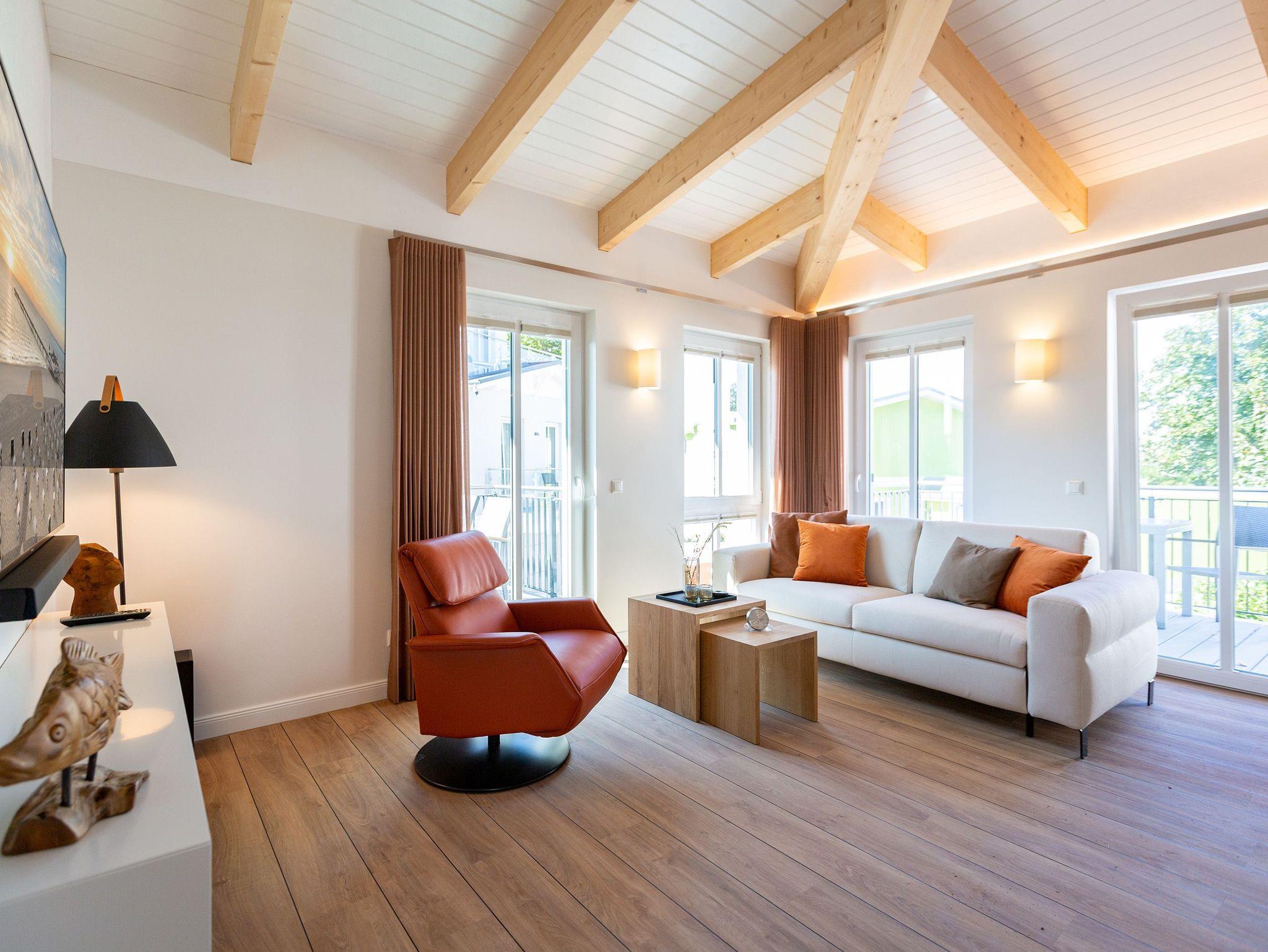 Sanfte Erdtöne und eine sichtbare Holzbalkendecke machen dieses 66qm-Appartement im Dachgeschoss zu einem außergewöhnlichen Aufenthaltsort für Ihren Ostseeurlaub. Ob Zeit zu Zweit, zu Dritt oder als kleine Familie mit Kleinkind (bis 2 Jahre im Kinderreisebett) - genießen Sie in diesem Zwei-Zimmer-Appartement jeglichen Komfort in Wohlfühlatmosphäre. Ein Materialmix aus Stein, Holz und edlen Stoffen wie Leder und Satin versprühen einen eleganten und wohligen Charme. Dank bodentiefer Fenster ist dieses Appartement besonders hell und freundlich, lässt sich durch Plissees und Vorhänge jedoch abdunkeln. Im Wohnbereich sorgt neben einem Flat-TV mit Soundsystem ein zweiseitiger Gaskamin für entsprechende Gemütlichkeit. Die offen gestaltete Küche mit ihren hochwertigen Elektro-Geräten inklusive Kochinsel mit Kochfeld mit integriertem Dunstabzug sorgen für angenehmen Komfort bei der Zubereitung Ihrer Speisen. Neben einem Gäste-WC verfügt das Duschbad mit barrierefreier Regendusche über ein Deckenfenster, welches für angenehmes Tageslicht sorgt. Selbstverständlich gehört auch in diesem Appartement eine Finnische Sauna zu Ihrem Urlaubskomfort. Damit Sie in Ihrem Urlaub auf nichts verzichten müssen, bietet das ans Schlafzimmer angrenzende Ankleidezimmer ausgiebigen Stauraum für Ihr Gepäck. Erholen Sie sich auf dem 1,80m x 2,00m komfortablen Boxspringbett vom Strandtag oder genießen Sie die letzten Sonnenstrahlen auf dem Süd-Balkon von Ihrem Schlaf- und Wohnzimmer aus. Einen zusätzlichen Schlafplatz bietet die komfortable Wohnlandschaft im Wohnzimmer. Kostenfreies W-Lan und ein Stellplatz in der hauseigenen Tiefgarage runden Ihren perfekten Urlaub auf der Insel Usedom ab. Auf Grund der großzügigen Platzgestaltung ist die Wohnung auch für Gäste mit Beeinträchtigungen geeignet.