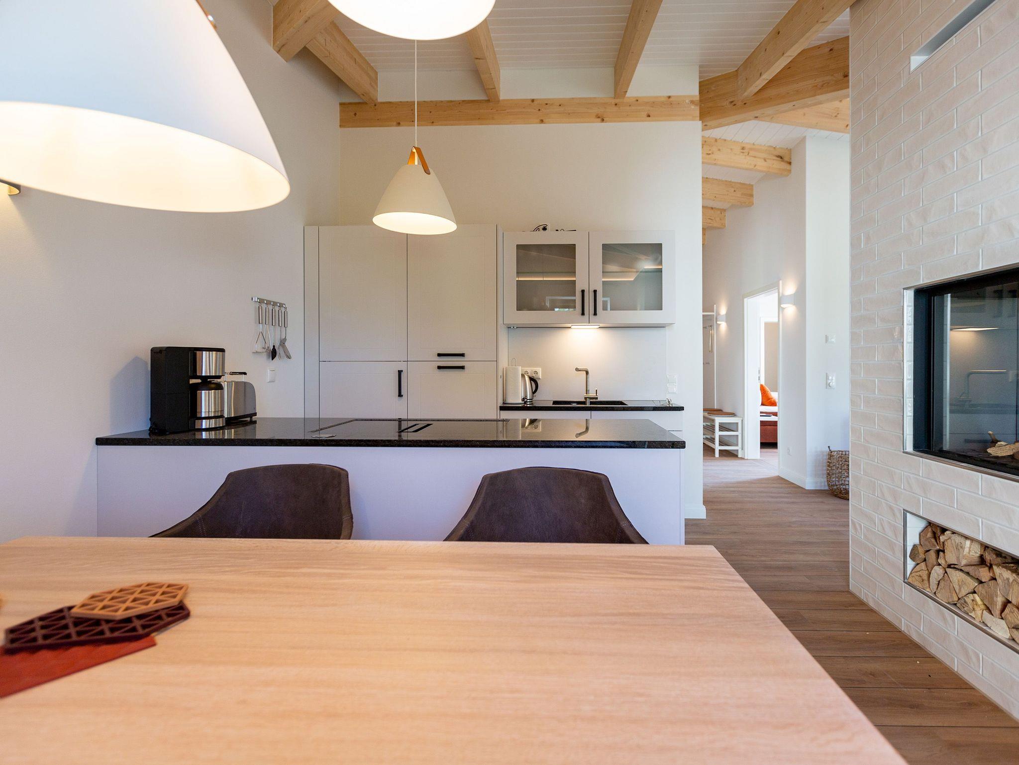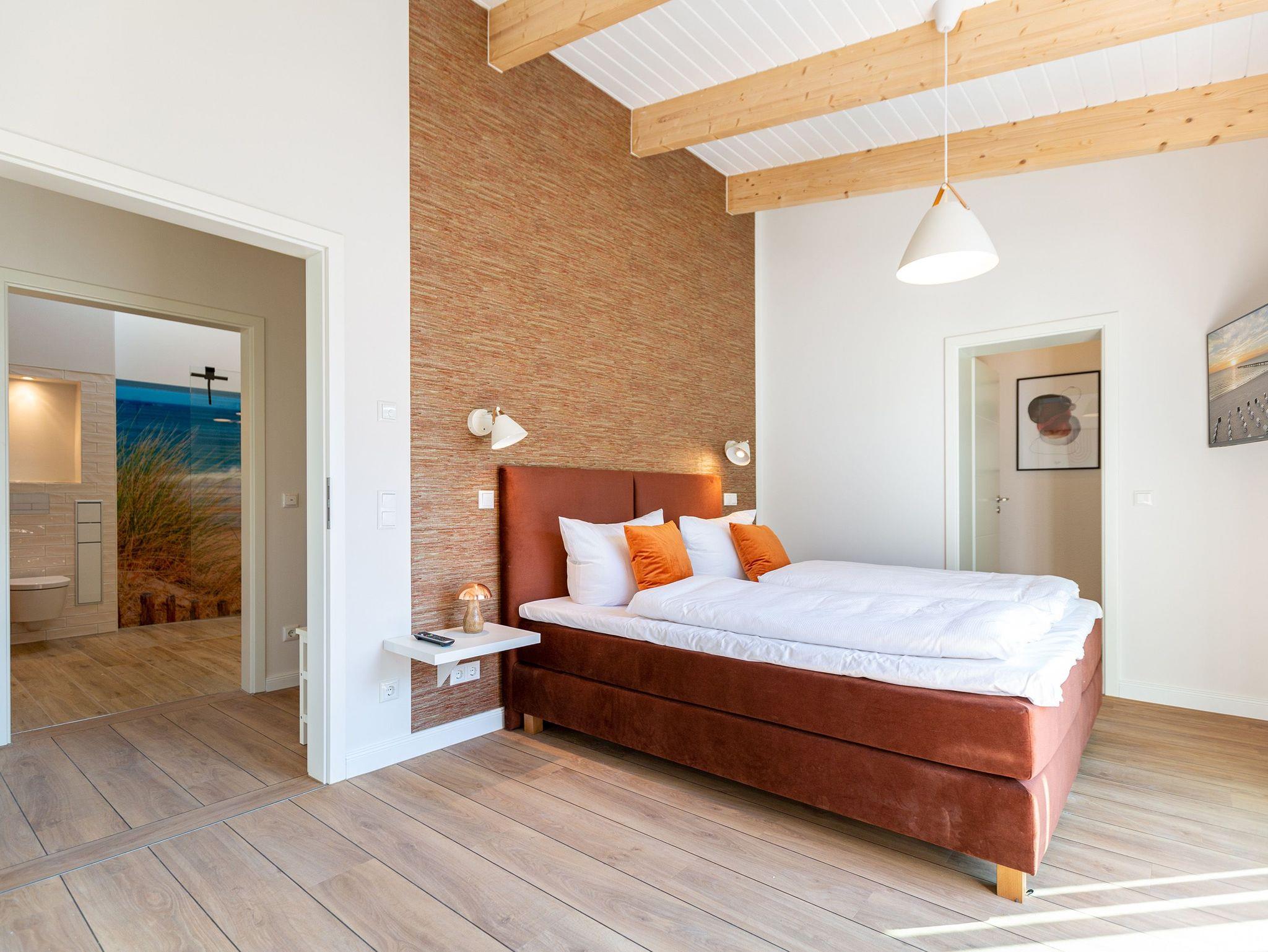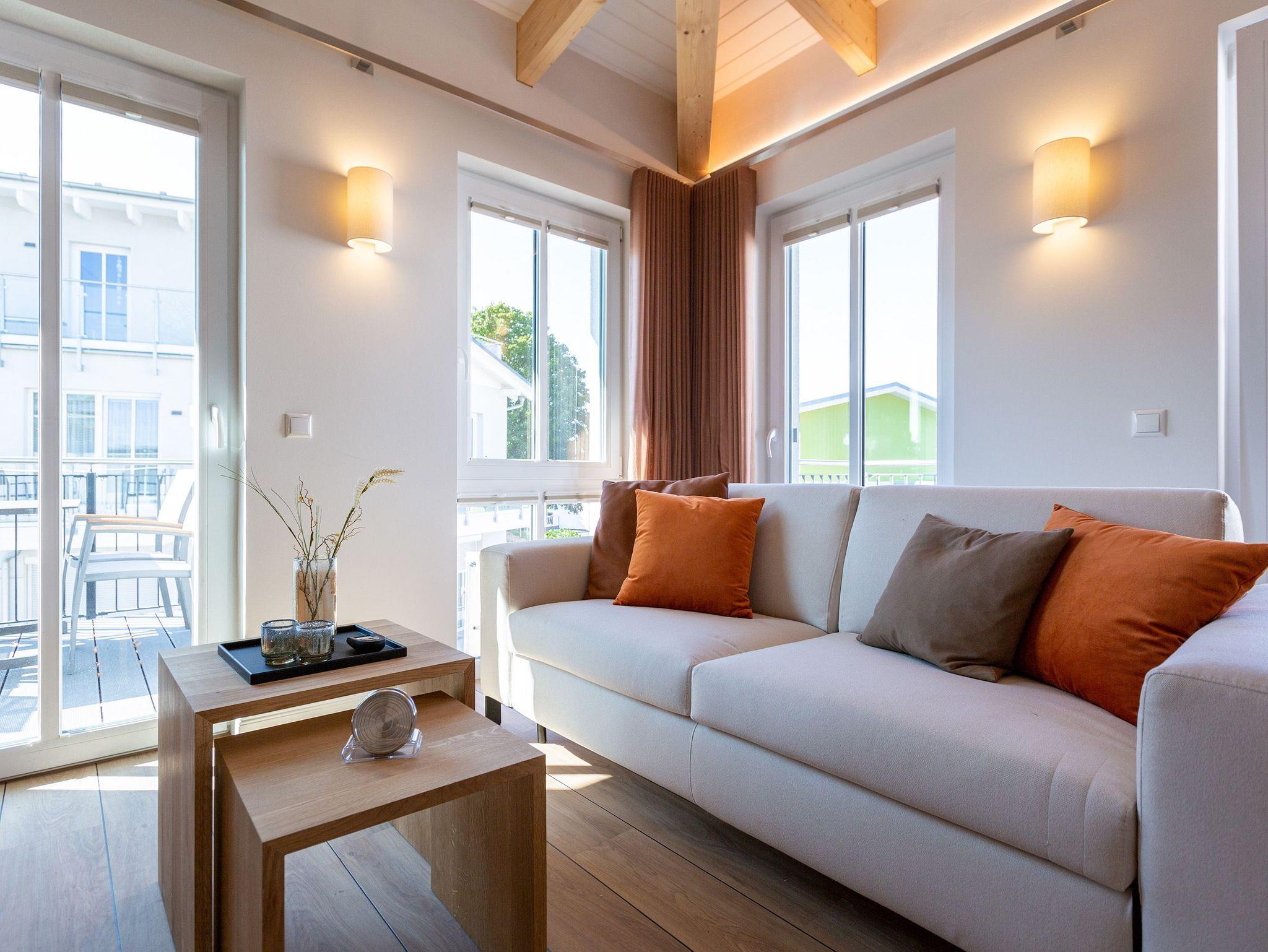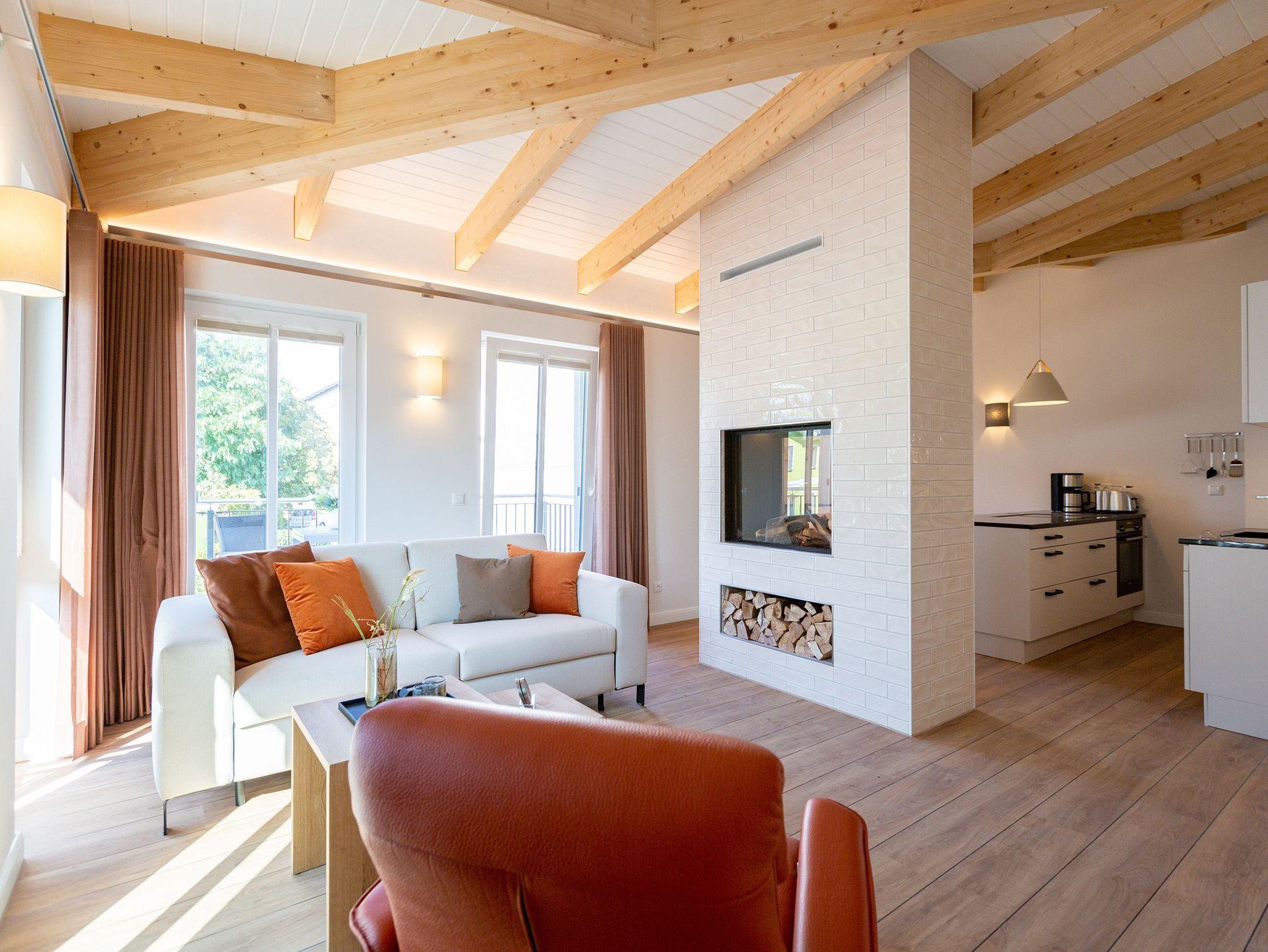 Sanfte Erdtöne und eine sichtbare Holzbalkendecke machen dieses 66qm-Appartement im Dachgeschoss zu einem außergewöhnlichen Aufenthaltsort für Ihren Ostseeurlaub. Ob Zeit zu Zweit, zu Dritt oder als kleine Familie mit Kleinkind (bis 2 Jahre im Kinderreisebett) - genießen Sie in diesem Zwei-Zimmer-Appartement jeglichen Komfort in Wohlfühlatmosphäre. Ein Materialmix aus Stein, Holz und edlen Stoffen wie Leder und Satin versprühen einen eleganten und wohligen Charme. Dank bodentiefer Fenster ist dieses Appartement besonders hell und freundlich, lässt sich durch Plissees und Vorhänge jedoch abdunkeln. Im Wohnbereich sorgt neben einem Flat-TV mit Soundsystem ein zweiseitiger Gaskamin für entsprechende Gemütlichkeit. Die offen gestaltete Küche mit ihren hochwertigen Elektro-Geräten inklusive Kochinsel mit Kochfeld mit integriertem Dunstabzug sorgen für angenehmen Komfort bei der Zubereitung Ihrer Speisen. Neben einem Gäste-WC verfügt das Duschbad mit barrierefreier Regendusche über ein Deckenfenster, welches für angenehmes Tageslicht sorgt. Selbstverständlich gehört auch in diesem Appartement eine Finnische Sauna zu Ihrem Urlaubskomfort. Damit Sie in Ihrem Urlaub auf nichts verzichten müssen, bietet das ans Schlafzimmer angrenzende Ankleidezimmer ausgiebigen Stauraum für Ihr Gepäck. Erholen Sie sich auf dem 1,80m x 2,00m komfortablen Boxspringbett vom Strandtag oder genießen Sie die letzten Sonnenstrahlen auf dem Süd-Balkon von Ihrem Schlaf- und Wohnzimmer aus. Einen zusätzlichen Schlafplatz bietet die komfortable Wohnlandschaft im Wohnzimmer. Kostenfreies W-Lan und ein Stellplatz in der hauseigenen Tiefgarage runden Ihren perfekten Urlaub auf der Insel Usedom ab. Auf Grund der großzügigen Platzgestaltung ist die Wohnung auch für Gäste mit Beeinträchtigungen geeignet.