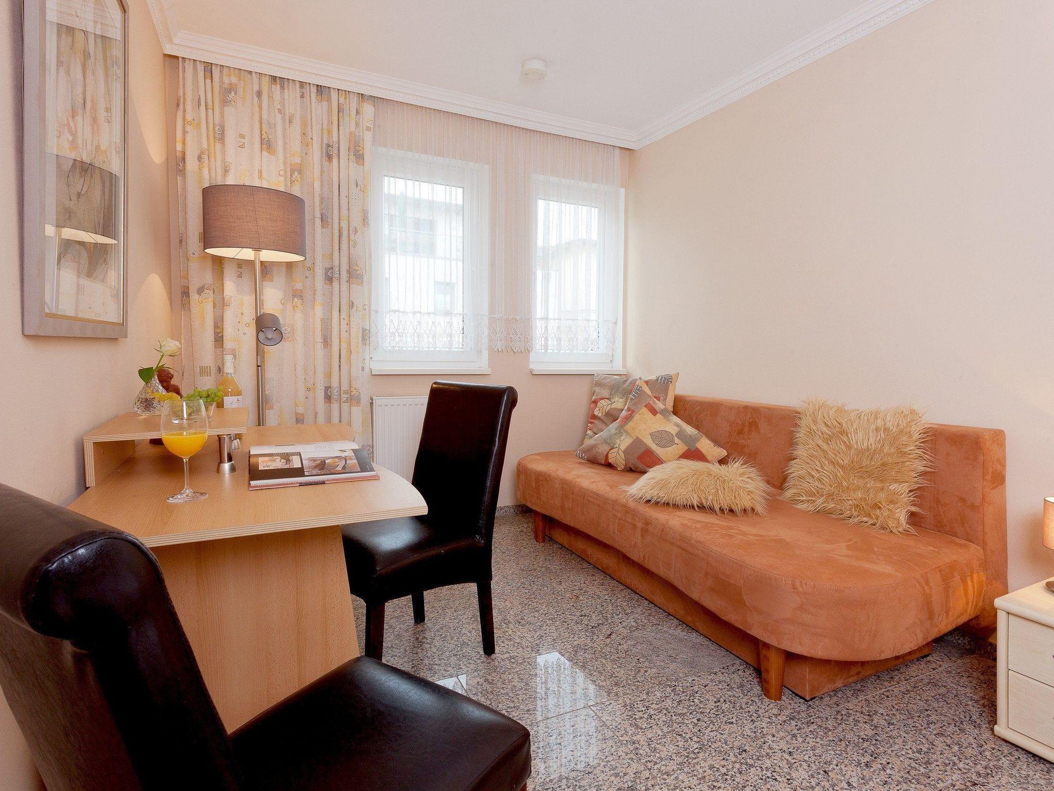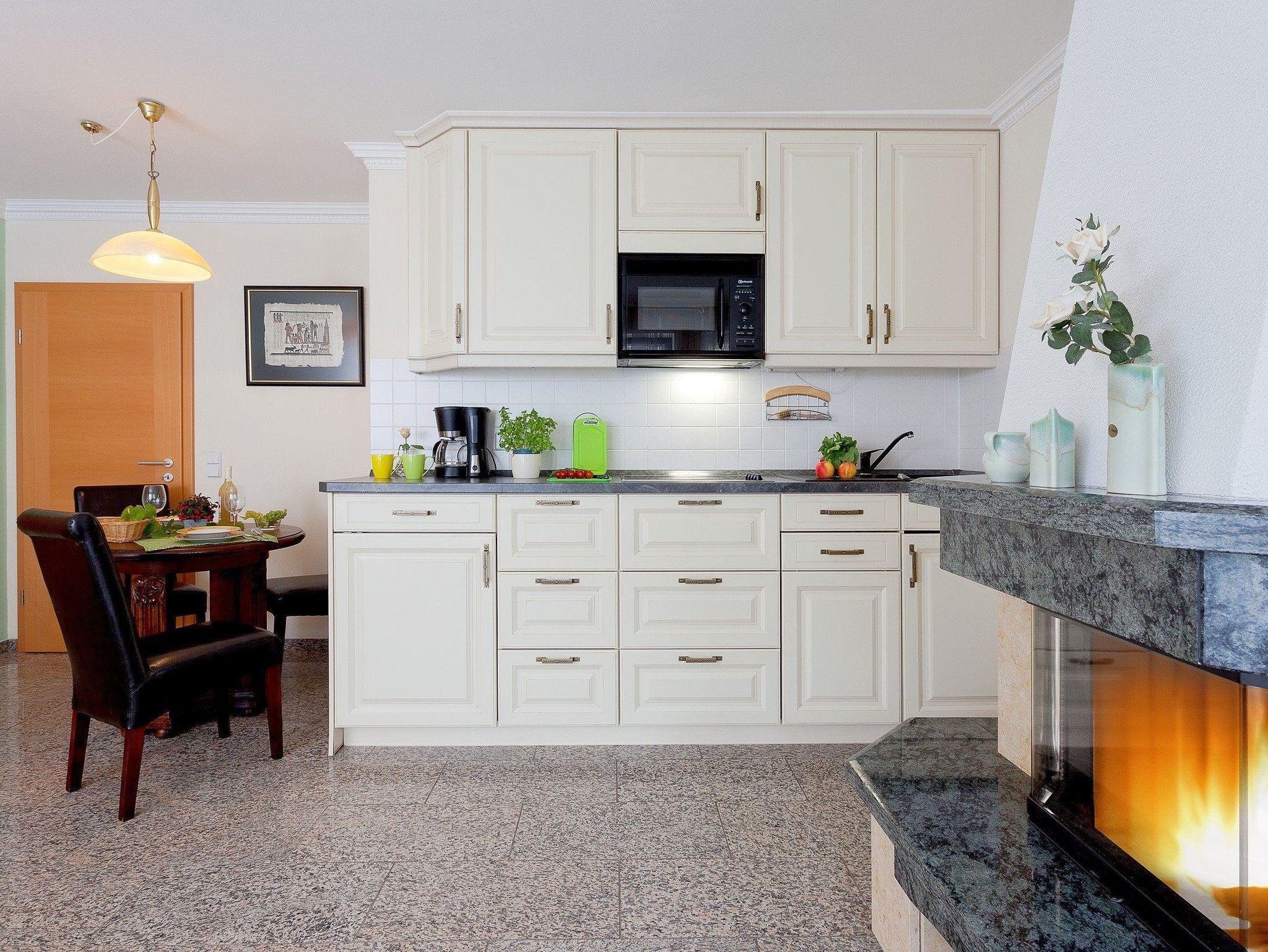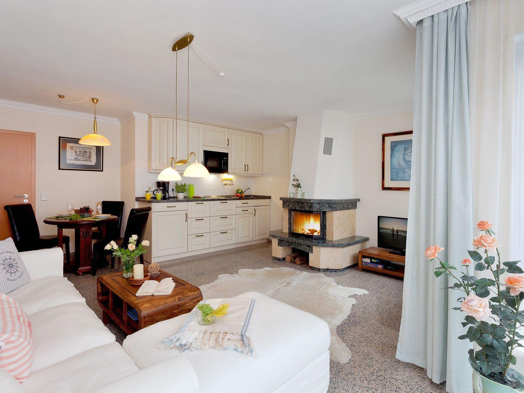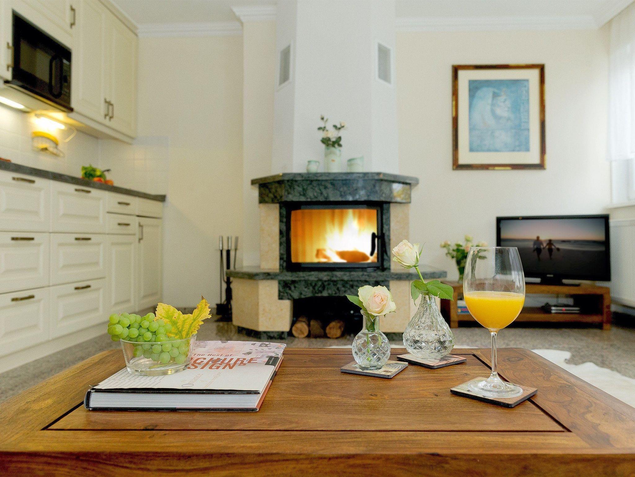 Auf 50 Quadratmetern können bis zu vier Personen einen entspannten Urlaub gemeinsam verbringen. Schon beim Eintreten wird Ihnen der edle Natursteinboden in allen Räumlichkeiten auffallen, der Kamin und die stuckverzierten Decken im Wohnbereich runden den eleganten Gesamteindruck dieses komfortablen Appartements perfekt ab. Im großzügigen Wohnbereich erwartet Sie eine bequeme Eckcouch, zum Ausspannen und planen Ihrer Urlaubsausflüge. Ein Flachbild TV und ein Radio stehen für die unterhaltsamen Stunden bereit. Highlight ist der luxuriöse Holz-Kamin im edlen Design. Das hierfür benötigte Kaminholz kann mitgebracht werden, gern stellen wir Ihnen eine „Erstausstattung“ an Brennholz (12,5 dm³) sowie Kaminanzünder gegen einen Aufpreis in Höhe von 16,00 Euro zur Verfügung. Die integrierte Küchenzeile ist mit allen Extras (Kühlschrank, Mikrowelle, Wasserkocher, Toaster, Kaffeemaschine) ausgestattet, so dass einem Perfekten Dinner nichts im Wege steht. Nach einem erlebnisreichen Urlaubstag können Sie sich zur Nachtruhe in das Schlafzimmer zurückziehen. Ein bequemes Doppelbett (180 x 200cm / zwei getrennte Matratzen) und eine Schlafcouch für die dritte und vierte Personen bieten erholsamen Schlafkomfort.[nbsp] Die Aufbettung für ein Kind ist im Schlafzimmer im Babyreisebett (max. 3 Jahre) möglich.