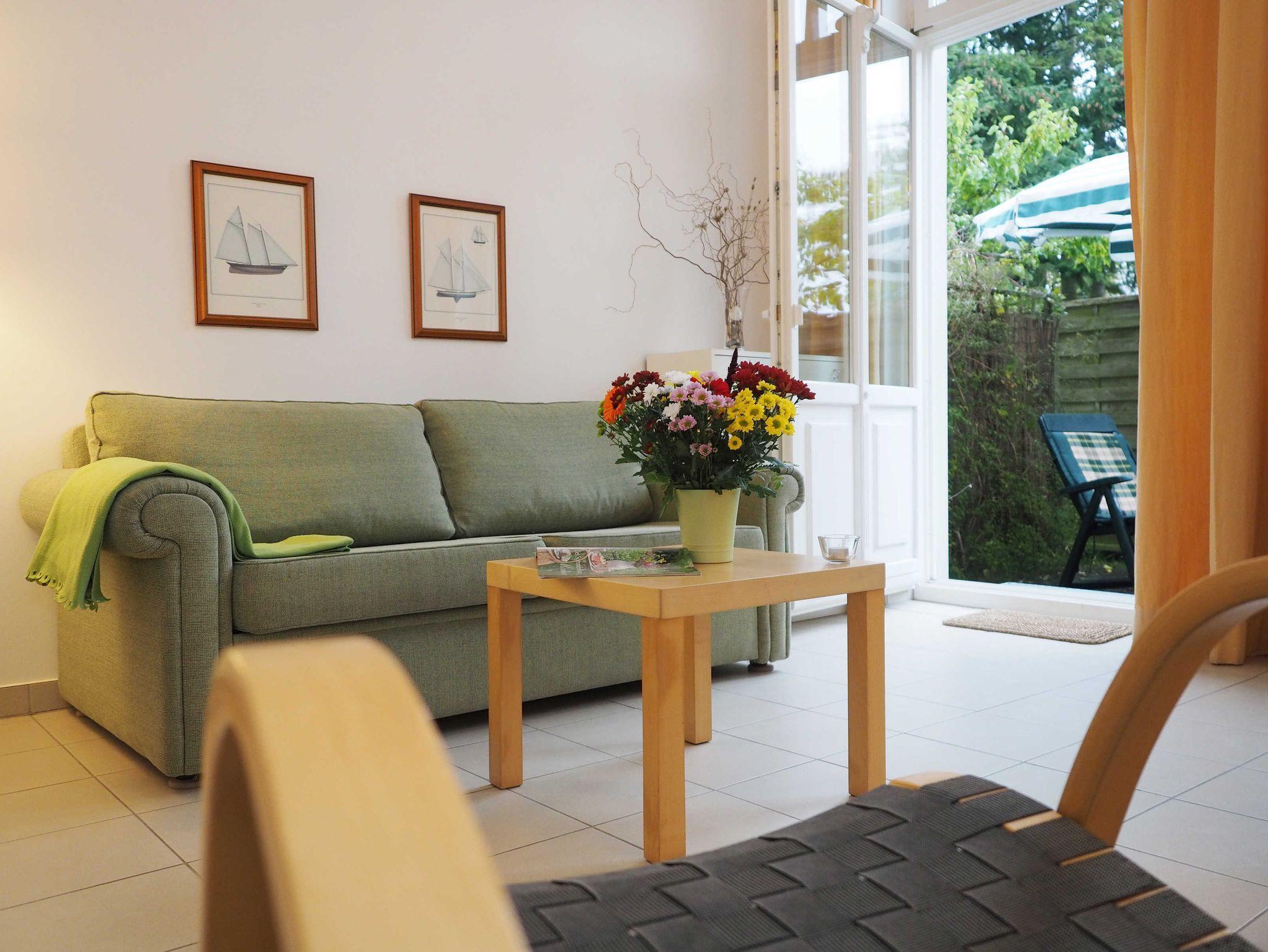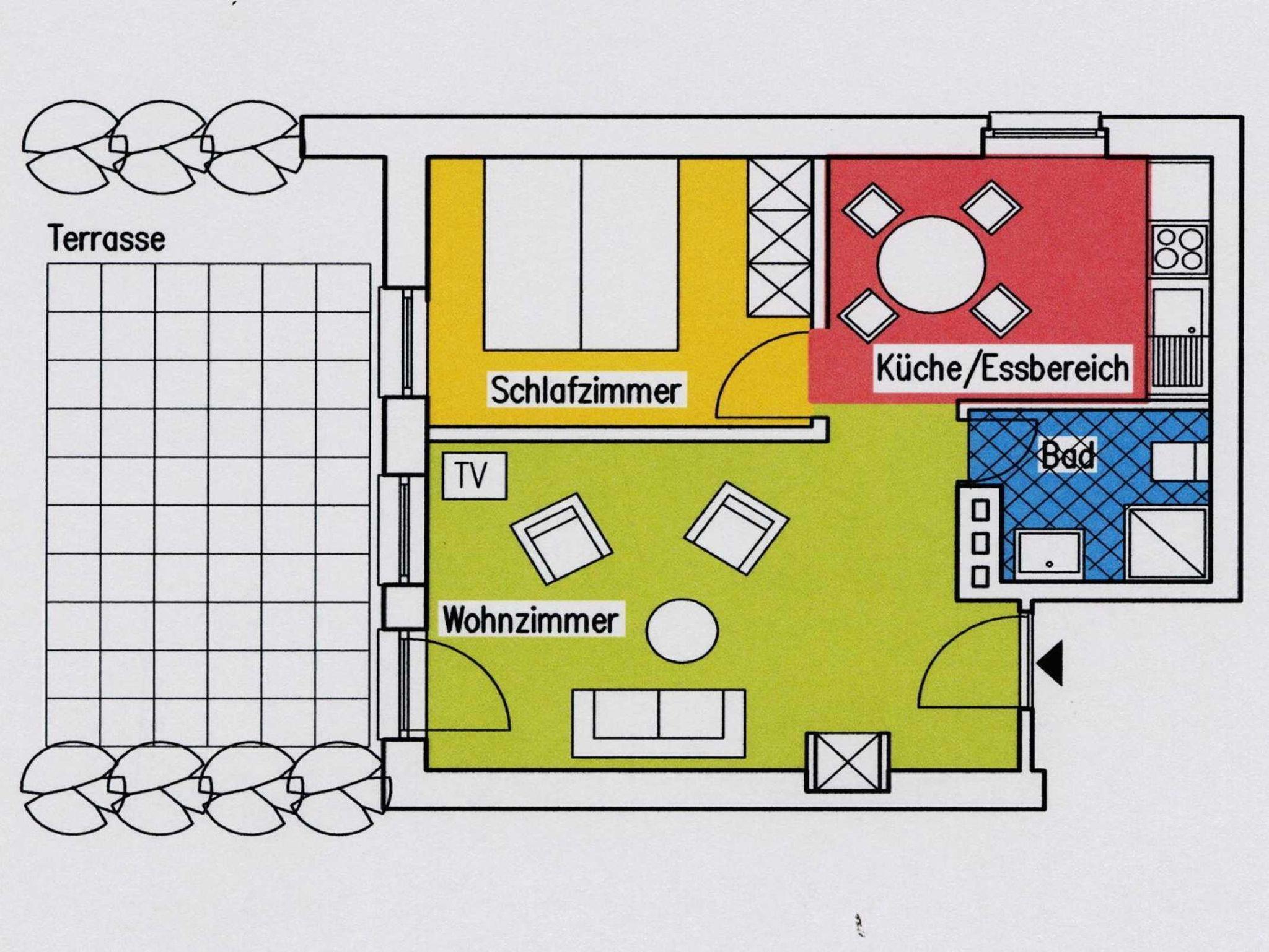 Gemütliche mit 4-DTV-Sternen zertifizierte Ferienwohnung für 2 Personen (2 Aufbettungen möglich) im Erdgeschoss (40 m²) mit Ausgang zur Terrasse in Südlage, Wohnzimmer mit Doppel-Schlafcouch (140 x 190 cm) , 32'' Sat-TV, Mini-HiFi-Anlage mit CD-Player, Internet VDSL / W-LAN, Safe im Schrank, Wohnküche mit Essplatz, Geschirrspüler, Schlafzimmer mit Doppelbett (Liegefläche 160 x 200 cm), Duschbad (superflache Dusche)