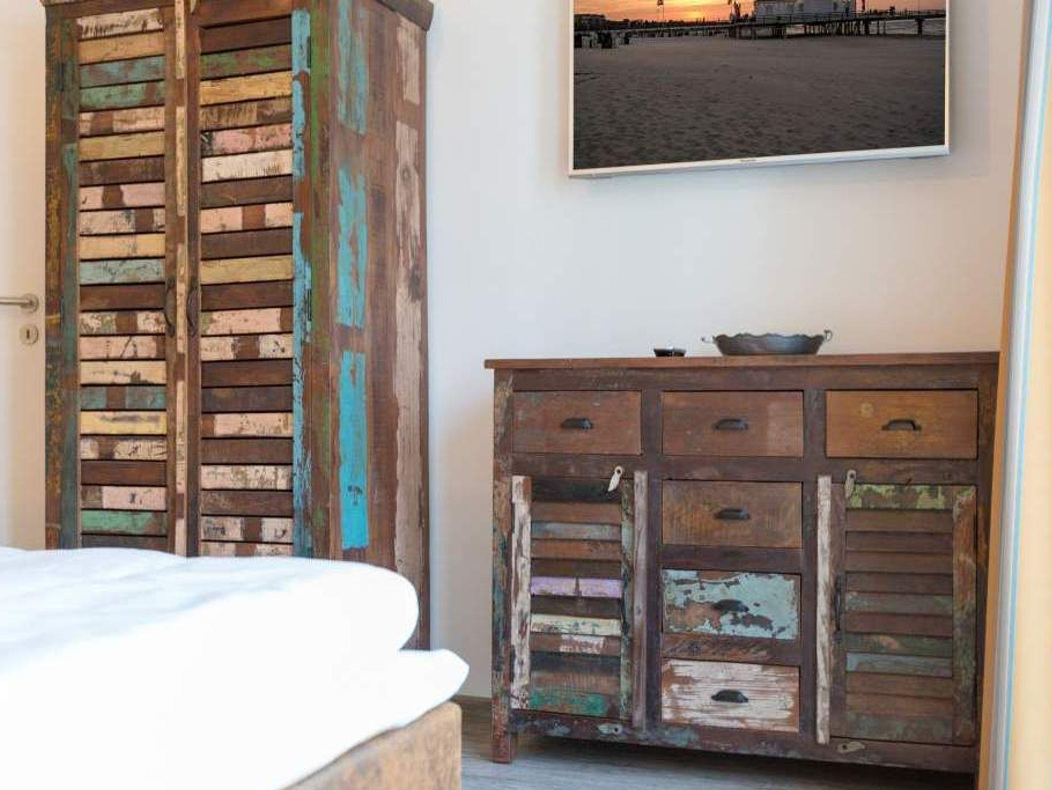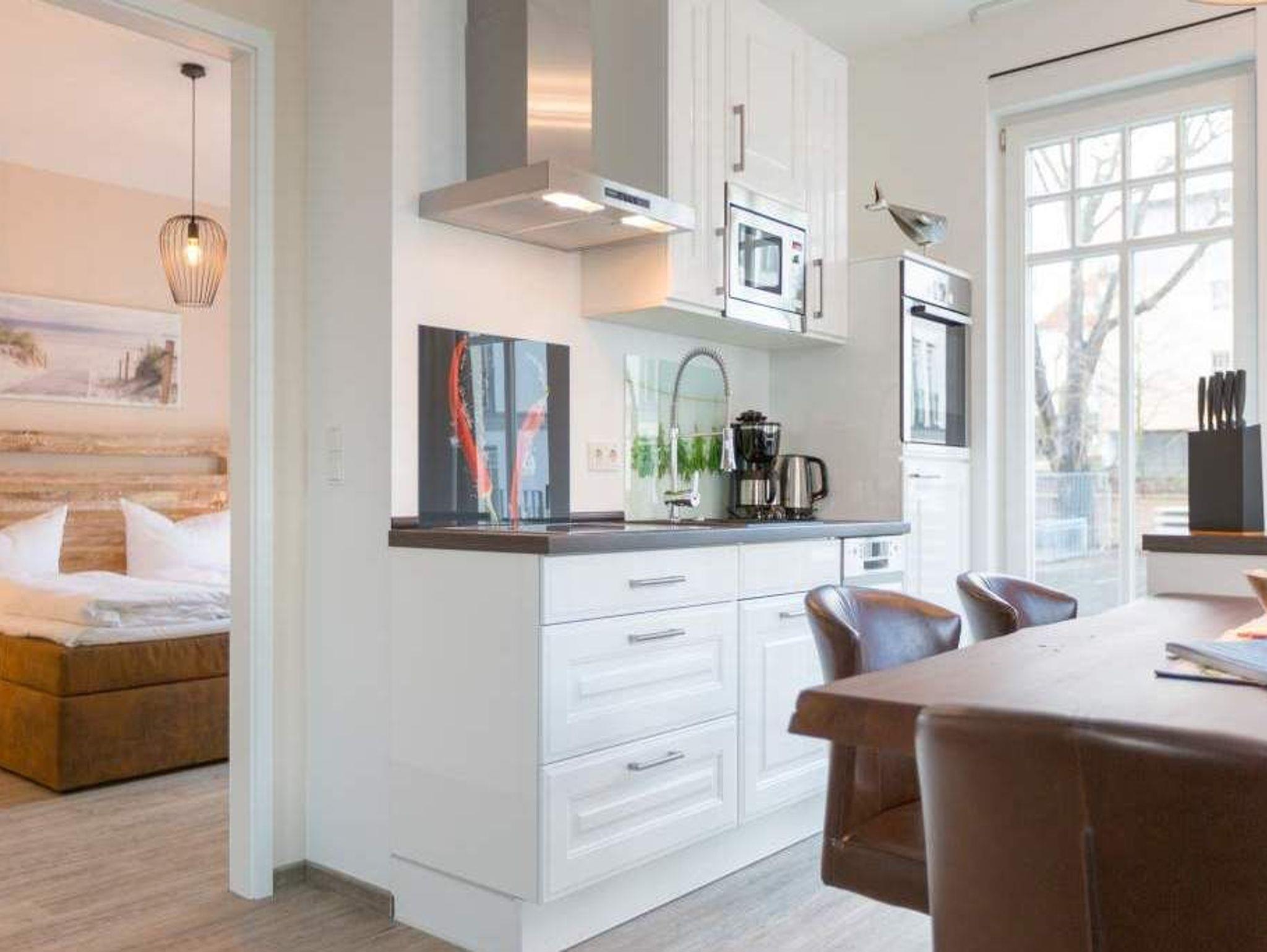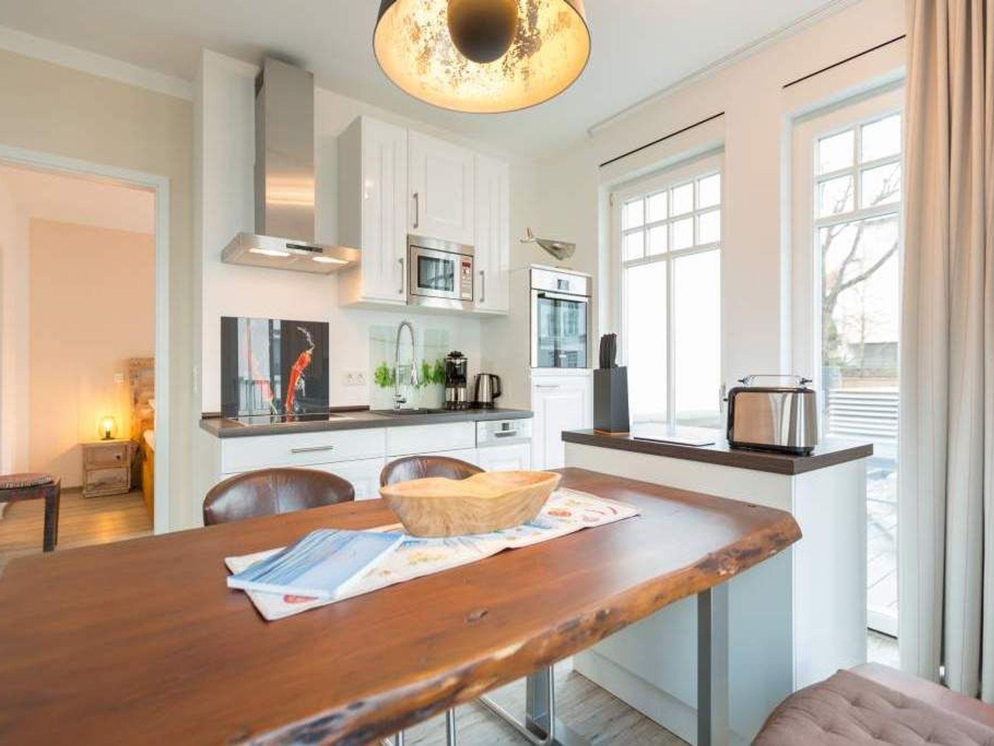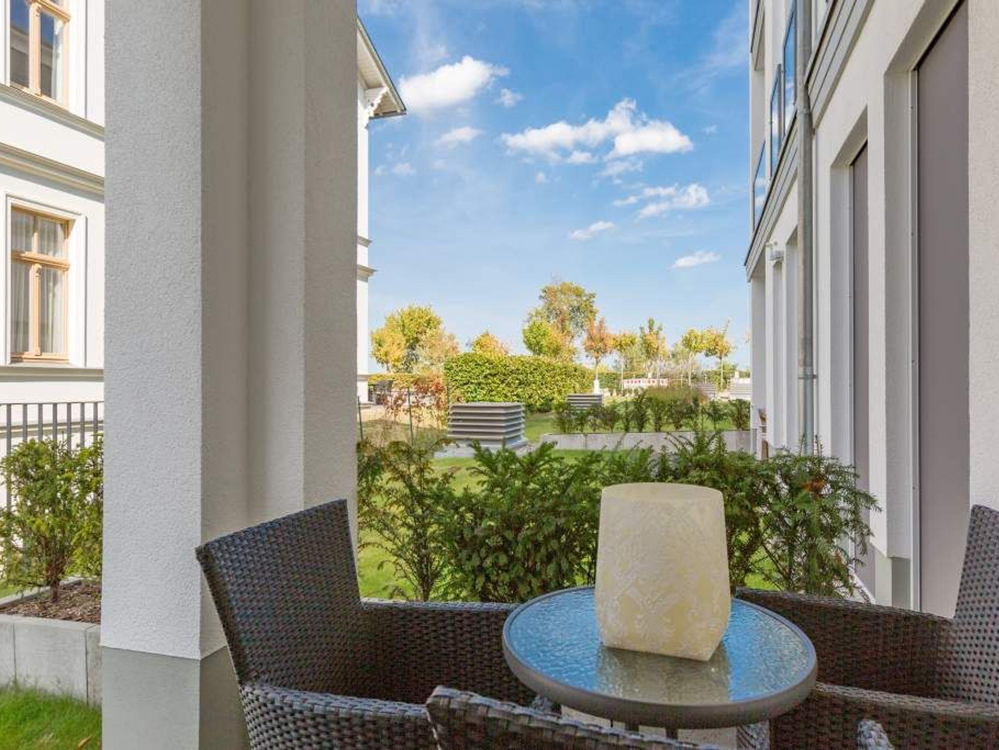 Zu spüren, wie jeder Muskel sich entspannt, wie die Seele zur Ruhe kommt und man tief durchatmet, während durch die großen, offenen Fenster die gerade einmal 20 Meter entfernte Ostsee ins Wohnzimmer rauscht ? angekommen in der Wohnung Nummer 4 im Erdgeschoss der Villa Westend sind Sie auch gleich im Urlaubshimmel. Denn die 84 Quadratmeter, die Platz für 4 Personen [&] 1 Kleinkind ( bis 2 Jahre im Kinderreisebett) bietet, ist anders, ist extravagant, stylisch und doch unglaublich einladend, behaglich und komfortabel. Hier treffen shabby Kolonialstil auf modernes Design, exotische Massivholzmöbel auf Art Deco und Industrial Chic. Ein harmonischer Stilmix, der diesem Urlaubsappartement ein ganz besonderes Flair verleiht. Die großen Ohrensessel oder die Ledercouch im luftigen und geräumigen Wohn-Esszimmer eignen sich bestens zum gemütlichen Relaxen. Ein Flat-TV mit integrierter Soundbar sorgt für Unterhaltung. Der Elektrokamin im Wohnzimmer bringt Kuschelstimmung auf Knopfdruck. Ein wunderschöner Echtholztisch ist das Verbindungsglied zur modernen und offenen Küche. Mit den hochwertigen Markengeräten macht das Kochen und Dinieren so richtig Spaß. Oder setzen Sie sich auf die Terrasse. Genießen Sie von hier aus die Sonne. Denn Dank der Süd-West-Ausrichtung können Sie hier zusätzlich zum wunderbaren Blick in den Garten auch die letzten Sonnenstrahlen des Tages noch auskosten. Auch wenn man im Urlaub möglichst keine Sekunde verschlafen möchte, verschaffen die beiden großen Doppelboxspringbetten (jeweils 1,80 m x 2,00 m) in den beiden Schlafzimmern einen erholsamen Schlaf. Viel Ablagemöglichkeit bieten hier die großen Vintage-Schränke. In jedem Schlafzimmer gibt es einen Flat-TV. Die Nichtraucher-Wohnung verfügt über zwei Bäder mit Dusche, Waschtisch und WC. Ein Highlight ist im Masterbad eine finnische Sauna, die für das ganz exklusive und eigene Spa-Gefühl sorgt. Handtücher liegen schon für Sie bereit und die Betten sind, wenn Sie ankommen, frisch bezogen. In der Tiefgarage steht für Sie ein Pkw-Stellplatz Nr. 25 zur Verfügung. WLAN gibt es kostenfrei.