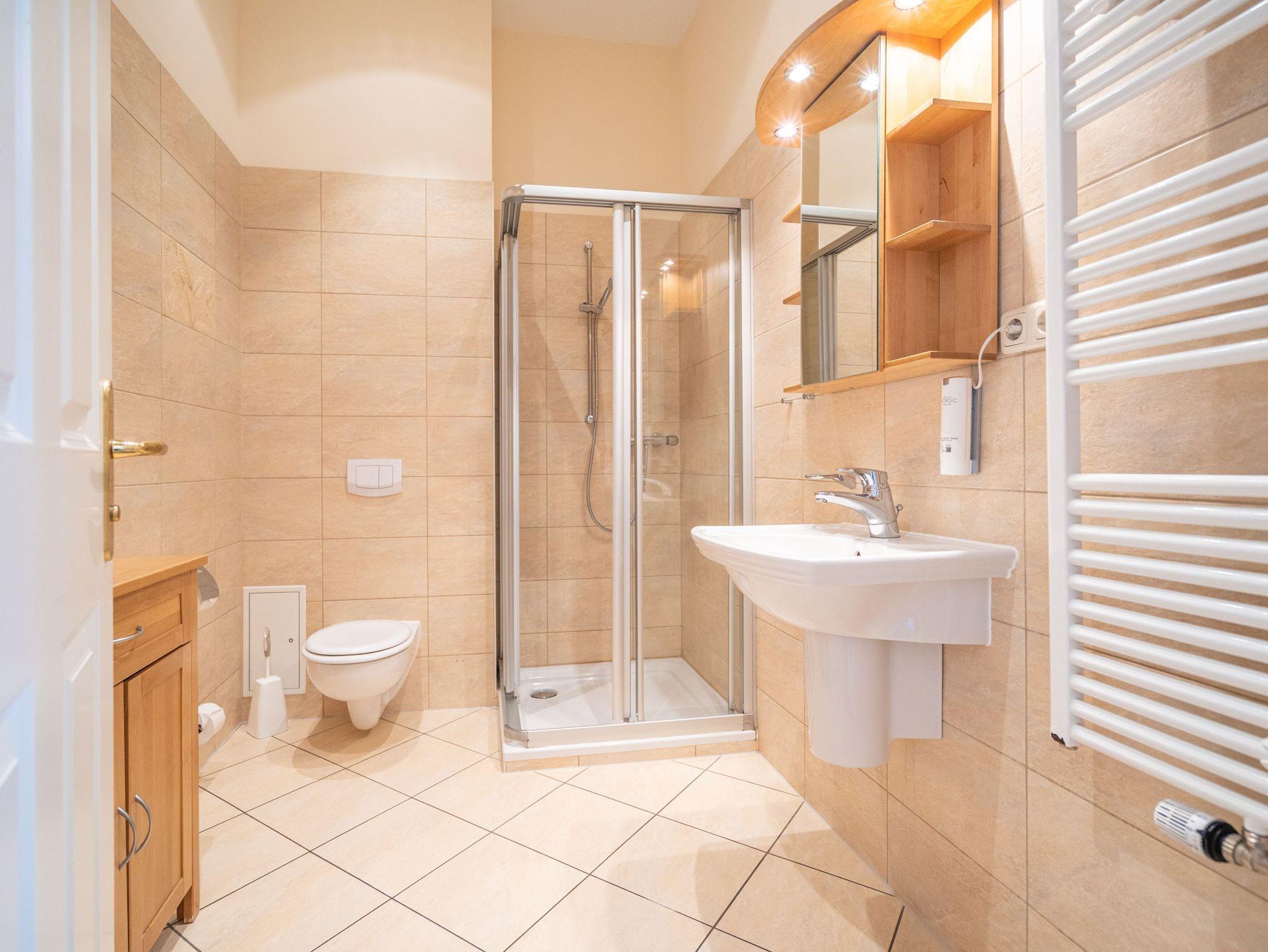 In der 2-Raum-Ferienwohnung Lasker-Schüler im Autorenhaus überzeugt nicht nur der schöne Meerblick. Angenehme Urlaubstage verspricht auch die geschmackvolle Einrichtung der Wohnung, die sich im 2. Obergeschoss der Villa befindet. Vom kleinen Wohnbereich mit Kaminofen hat man Zugang zur verglasten Loggia. Hier lässt es sich besonders schön relaxen und wer genießt dabei nicht gerne den Blick auf die Ostsee? Die separate Küche ist komplett ausgestattet und wird durch den Essplatz vervollständigt. Ein Schlafzimmer mit Doppelbett für 2 Erwachsene bietet auch für ein Kleinkind im Kinderreisebett Platz. Ein Kind (bis 15 Jahre) kann im Wohnbereich die Schlafcouch nutzen. Ergänzt wird die Wohnung durch ein modernes Bad mit Dusche. Im Keller des Hauses stehen eine Waschmaschine und ein Trockner gegen Gebühr zur Verfügung. Das WLAN-Netz ist kostenfrei nutzbar.