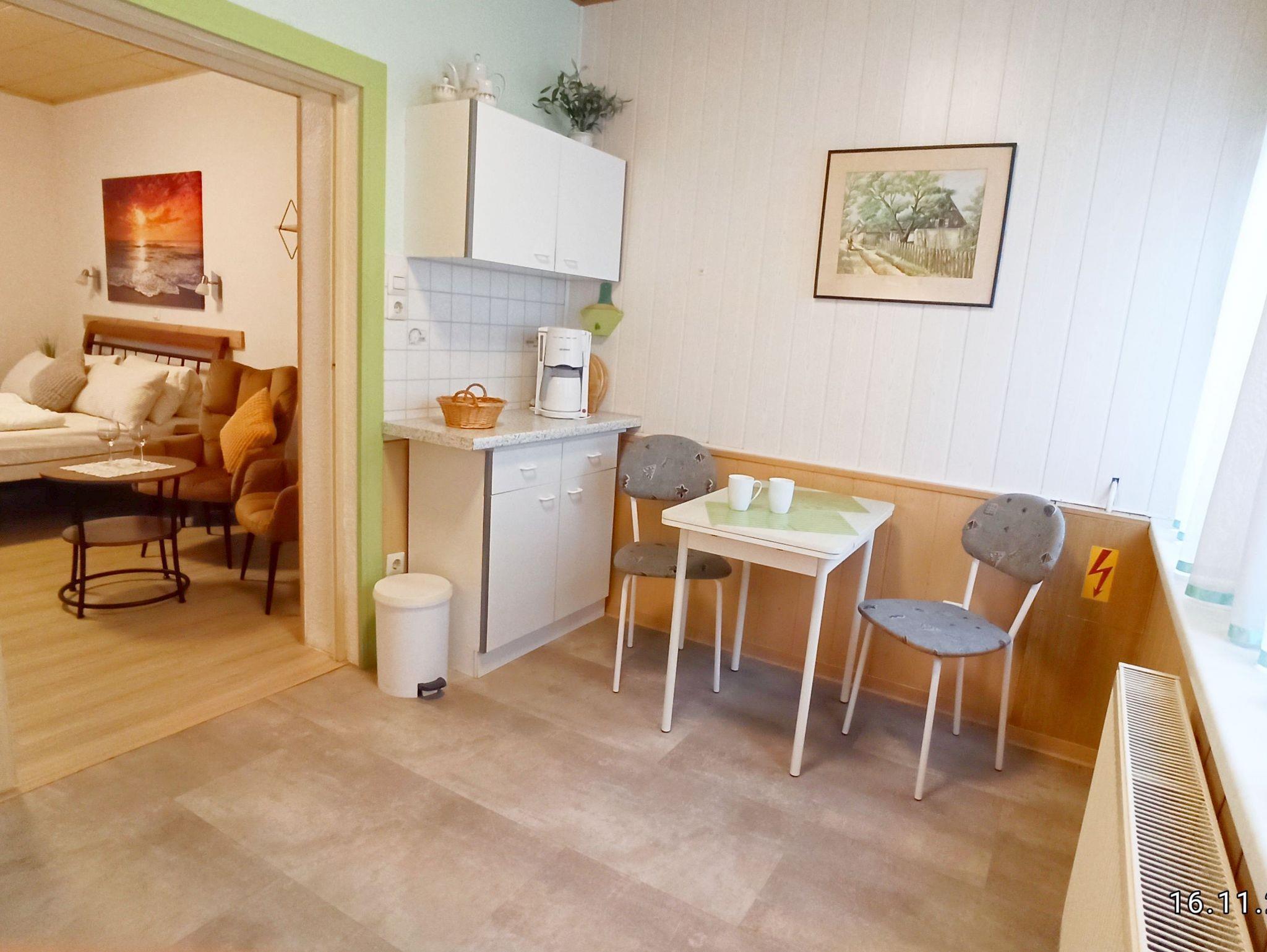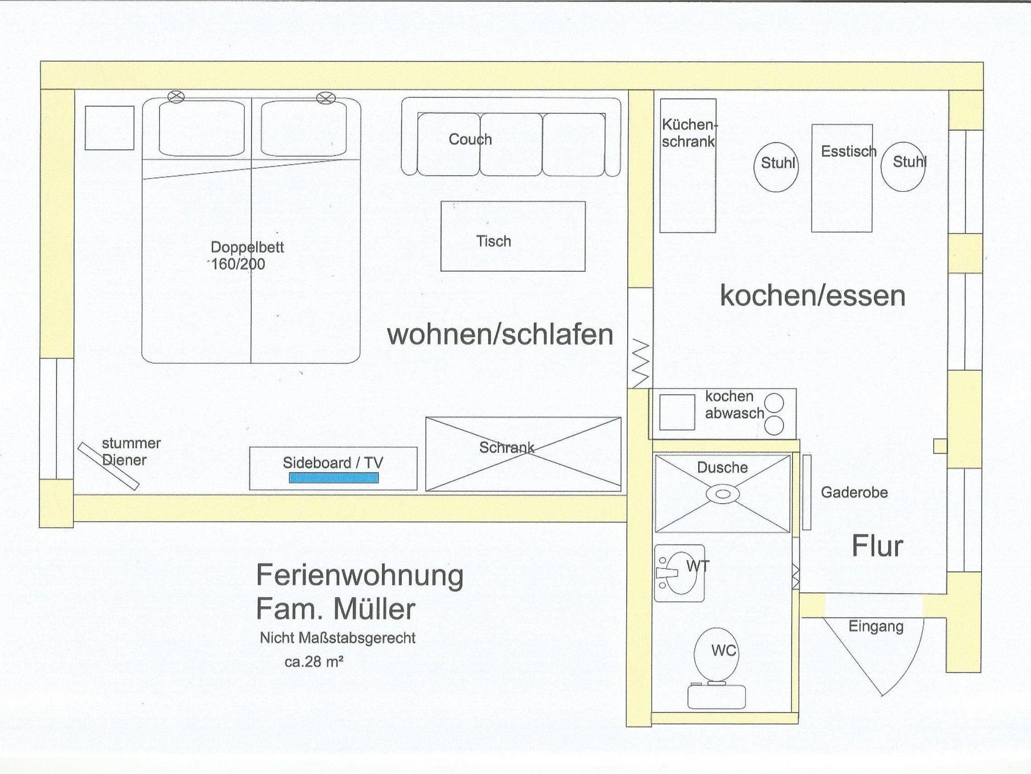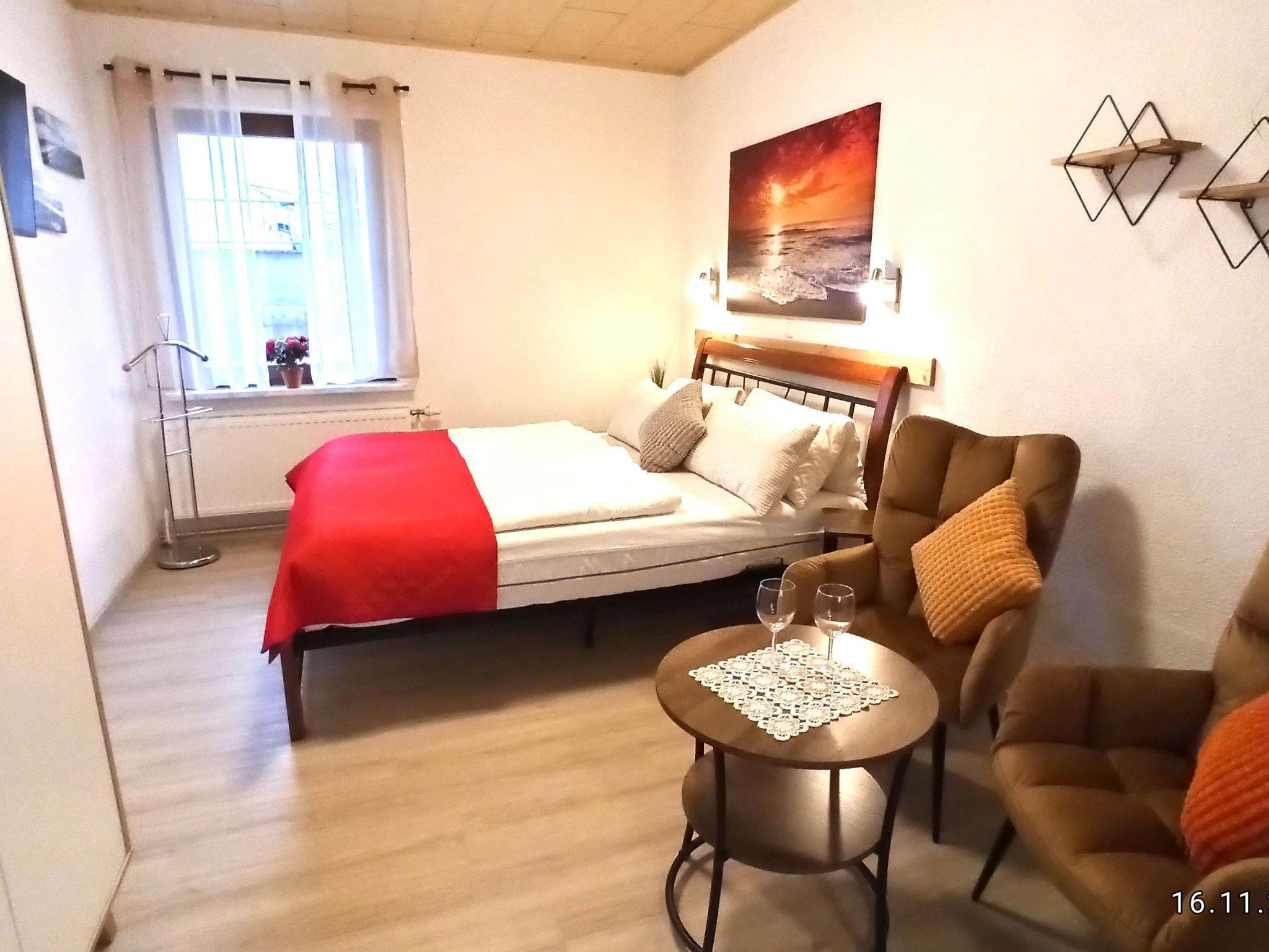 Die Ferienwohnung verfügt über ein Wohn-/ Schlafzimmer und ist ausgestattet mit einem Doppelbett,(160x200 ) Leselampen über den Betten, 2 Sessel und Tisch, Kleiderschrank, TV-Flachbildschirm. Internet-Zugang. Außenjalousie