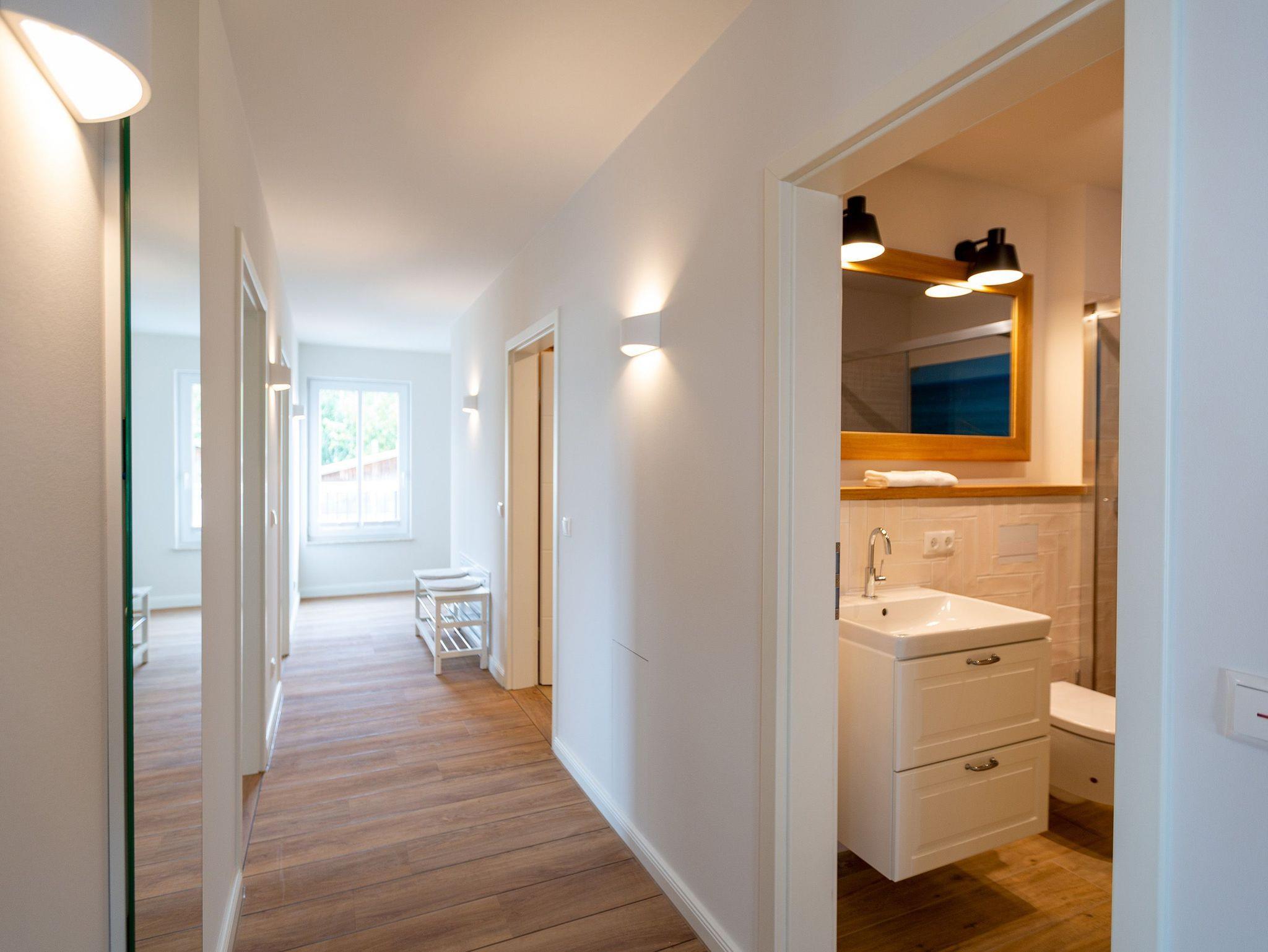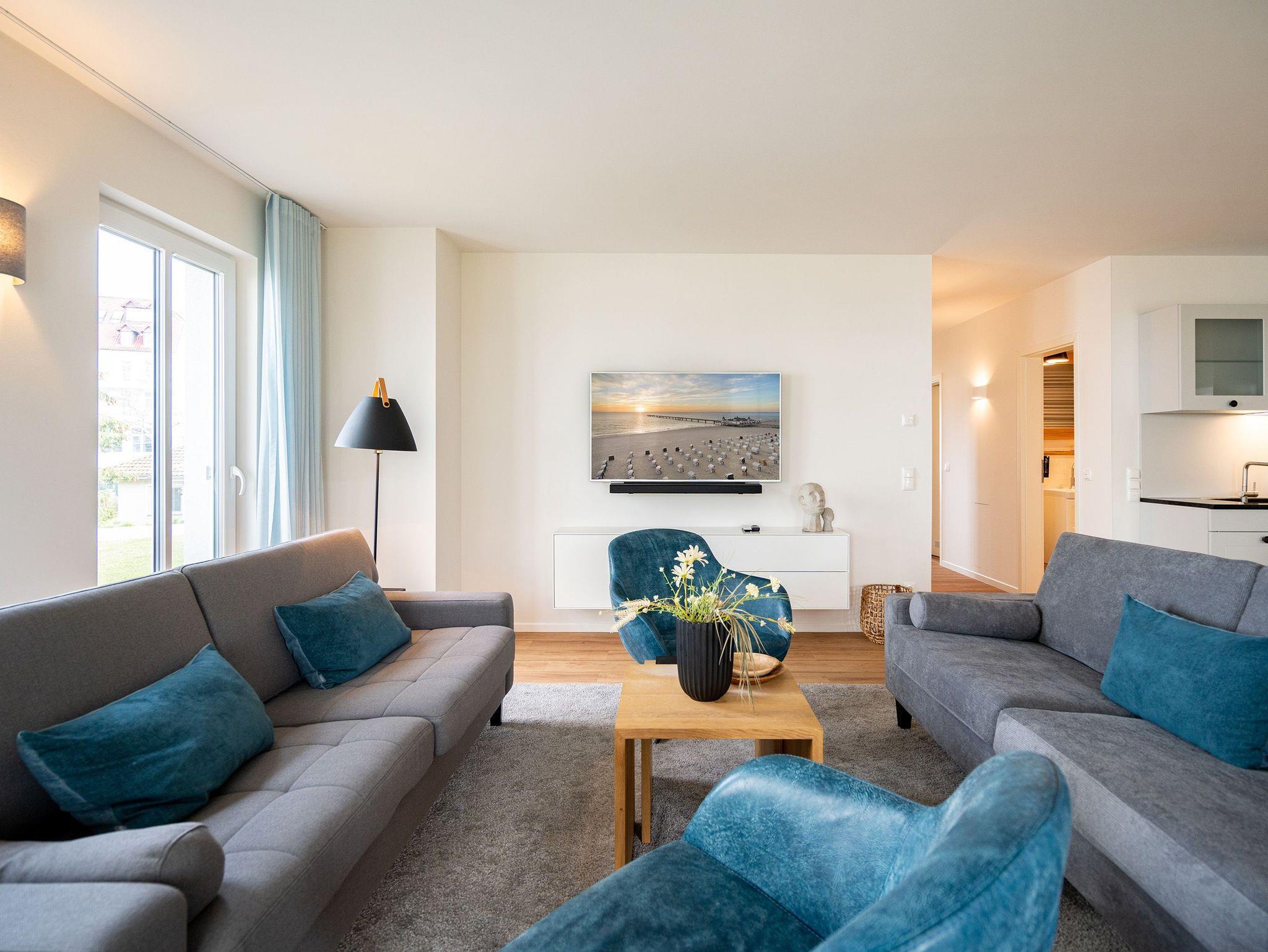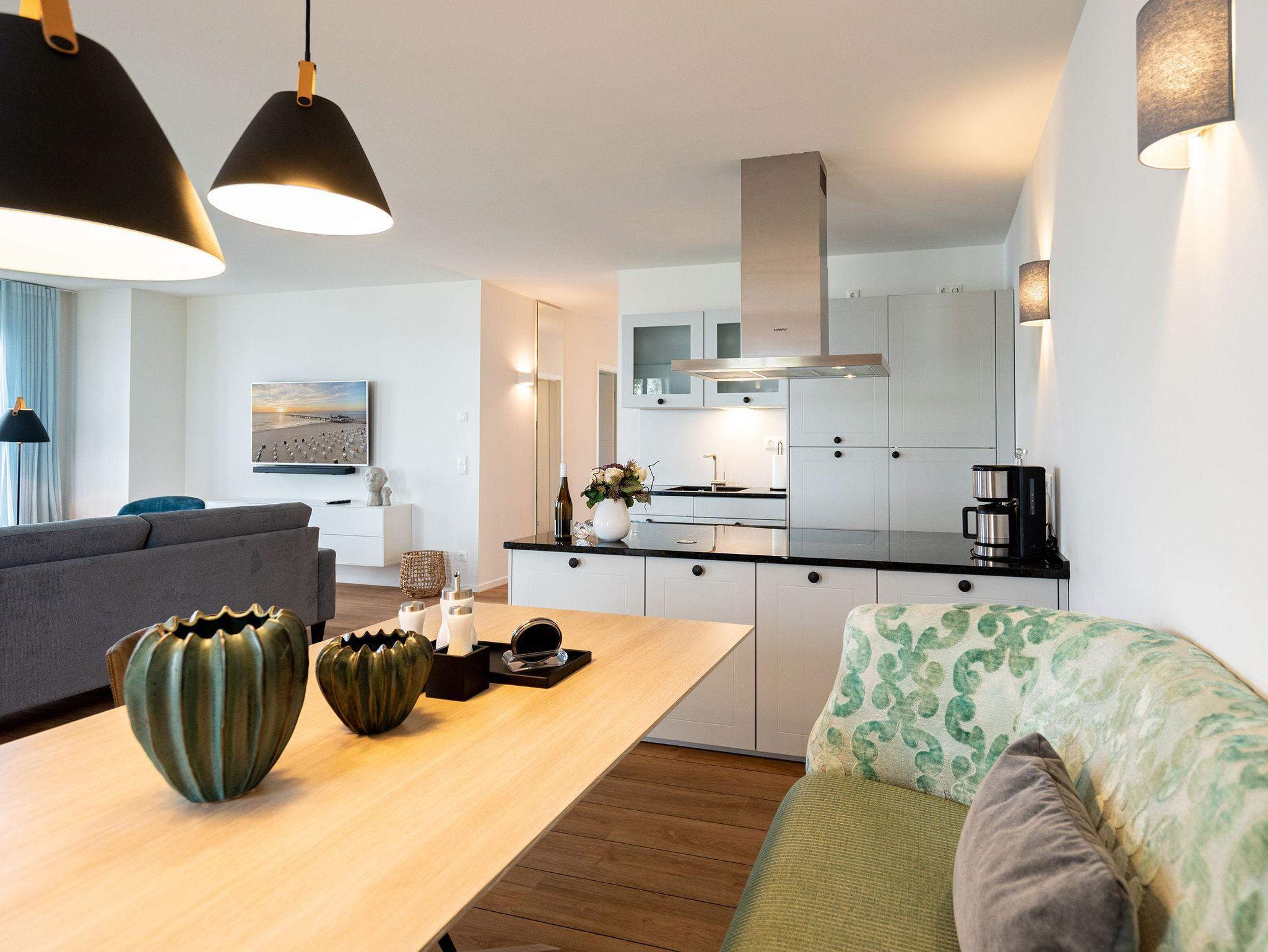 In diesen 2021 errichteten Häusern trifft Helligkeit auf Moderne und bietet Ihnen in seinen stilvoll eingerichteten Zwei- bis Drei-Zimmer Appartements Komfort auf höchster Ebene. Die offen gestalteten Wohn-Ess-Bereiche überzeugen durch ein stylisches Ambiente und ihr großzügiges Raumkonzept. Die teilweise mit Kochinseln ausgestatteten Küchen integrieren sich perfekt in den ebenso schlichten wie modernen Wohnraum. Alle Appartements verfügen über zwei Bäder oder ein Bad und ein zusätzliches Gäste-WC. Um Ihre Auszeit am Meer zusätzlich zu verschönern, wurden alle Appartements mit Gaskamin und Finnischer Sauna ausgestattet. Genießen Sie von den großzügigen Balkonen und Terrassen den Ausblick auf die parkähnliche Grünanlage oder verbringen Sie Ihren Abend auf dem frei zur Verfügung stehenden Grillplatz mit Sitzecke und Grill. Ein kostenloser PKW-Stellplatz in der Tiefgarage (Einfahrtshöhe 1,95m, Anfahrt über die Straße ?Kieferngrund? Höhe Hausnummer 17) gehört ebenso zum Komfort dieser Appartement-Häuser wie kostenfreies W-Lan. Für E-Autos steht am Objekt eine E-Ladesäule mit 2 Ladeplätzen (gesamt 22 kW) auf dem Grundstück kostenpflichtig zur Verfügung. Eine Waschmaschine und ein Trockner können Sie gegen Gebühr über die kostenlose App WeWash nutzen.