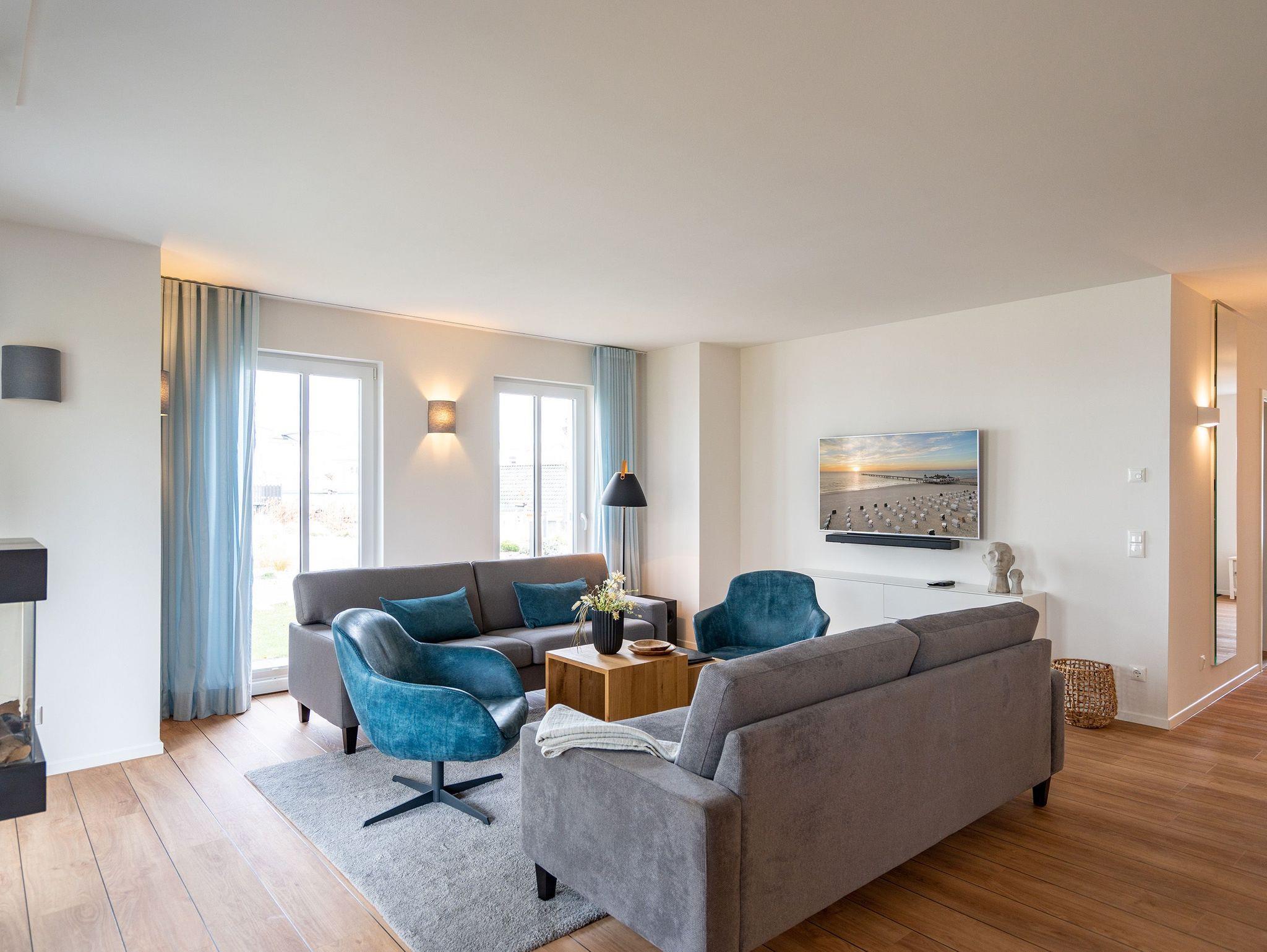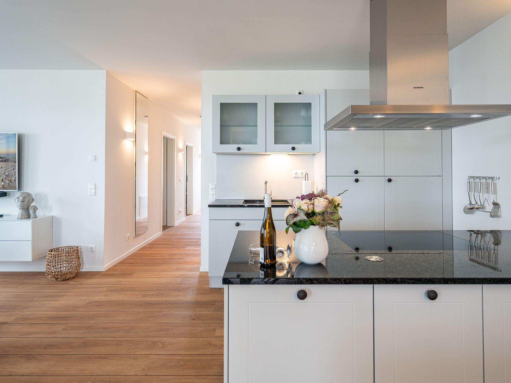 Sie wünschen sich Entspannung und Erholung für bis zu vier Personen in einem exklusiven Ferienappartement? Dieses großzügig geschnittene 88qm Urlaubsdomizil im Erdgeschoss (barrierefrei) überzeugt durch sein offenes Raumkonzept in Wohn- und Essbereich und versetzt Sie direkt in Urlaubsstimmung. Exklusive Designmöbel in schlichter Eleganz und ein perfekt abgestimmtes Farbkonzept sorgen für eine moderne, aber dennoch warme Wohnatmosphäre. Die offene Küche mit Kochinsel und hochwertigen Siemens-Elektrogeräten wie Backofen, Induktionskochfeld und Kühlschrank mit Gefrierfach sorgen für den entsprechenden Komfort beim Zubereiten Ihrer Speisen. Eine edle Granit-Arbeitsplatte fügt sich perfekt in das anspruchsvolle Gesamtkonzept der Küche ein. Genießen Sie nach einem ausgiebigen Strandspaziergang die wohltuende Wärme des Gaskamins von der gemütlichen Sofalandschaft aus. Der großzügige Flat-TV mit Soundsystem sorgt für die richtige Stimmung an Ihren Fernsehabenden. Ein besonderes Highlight dieses Appartements ist die nach Süden ausgerichtete Terrasse, von der aus Sie sich bei richtiger Windrichtung und entsprechendem Wellengang sogar das nicht weit entfernte Meer bis in Ihr Appartement holen können. Genießen Sie auch von einem der beiden Schlafzimmer, die mit hochwertigen Boxspringbetten (1,80m x 2,00m), Flat-TV und Einbauschrank mit Safe ausgestattet sind, das Rauschen des Meeres. Für ein besonderes Spa-Erlebnis sorgen die beiden Badezimmer mit Regendusche und beheizten Kosmetikspiegeln. Eine Finnische Sauna zählt ebenso zur hochwertigen Ausstattung dieses Appartements, wie kostenfreies W-Lan und ein Stellplatz in der hauseigenen Tiefgarage. Ihre Fahrräder können Sie gern im Appartement zugehörigen Abstellraum im Nachbarhaus unterbringen.