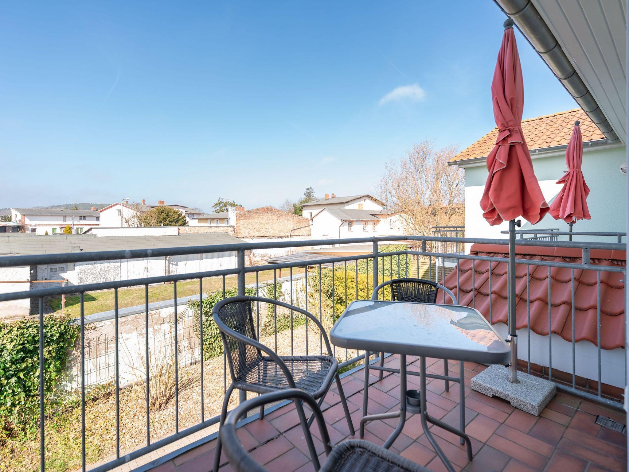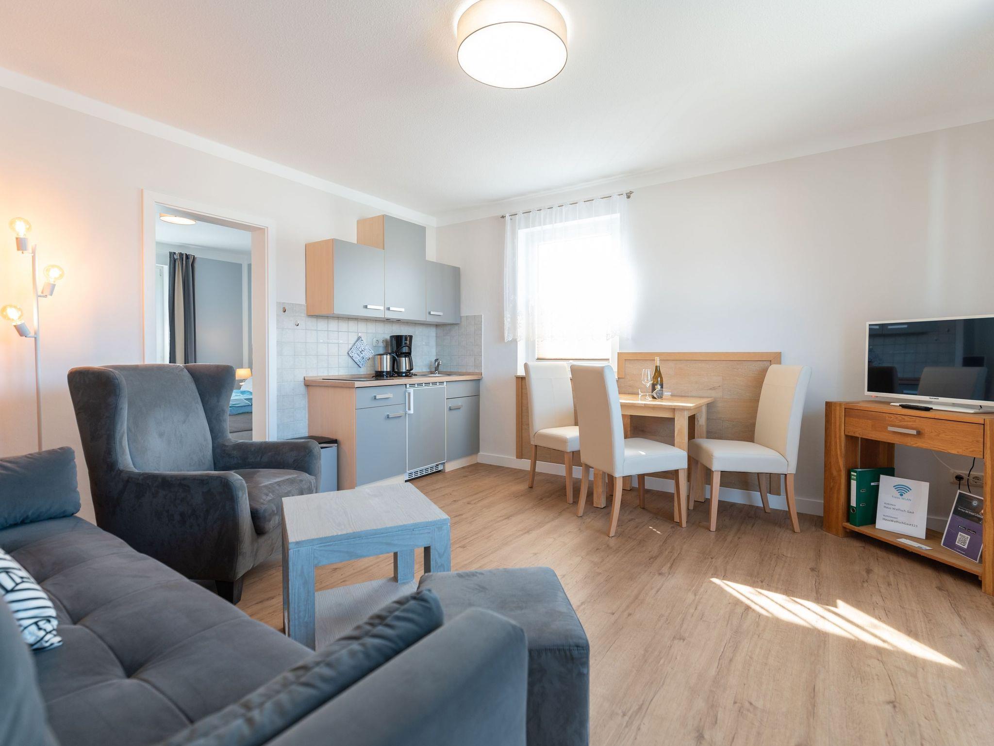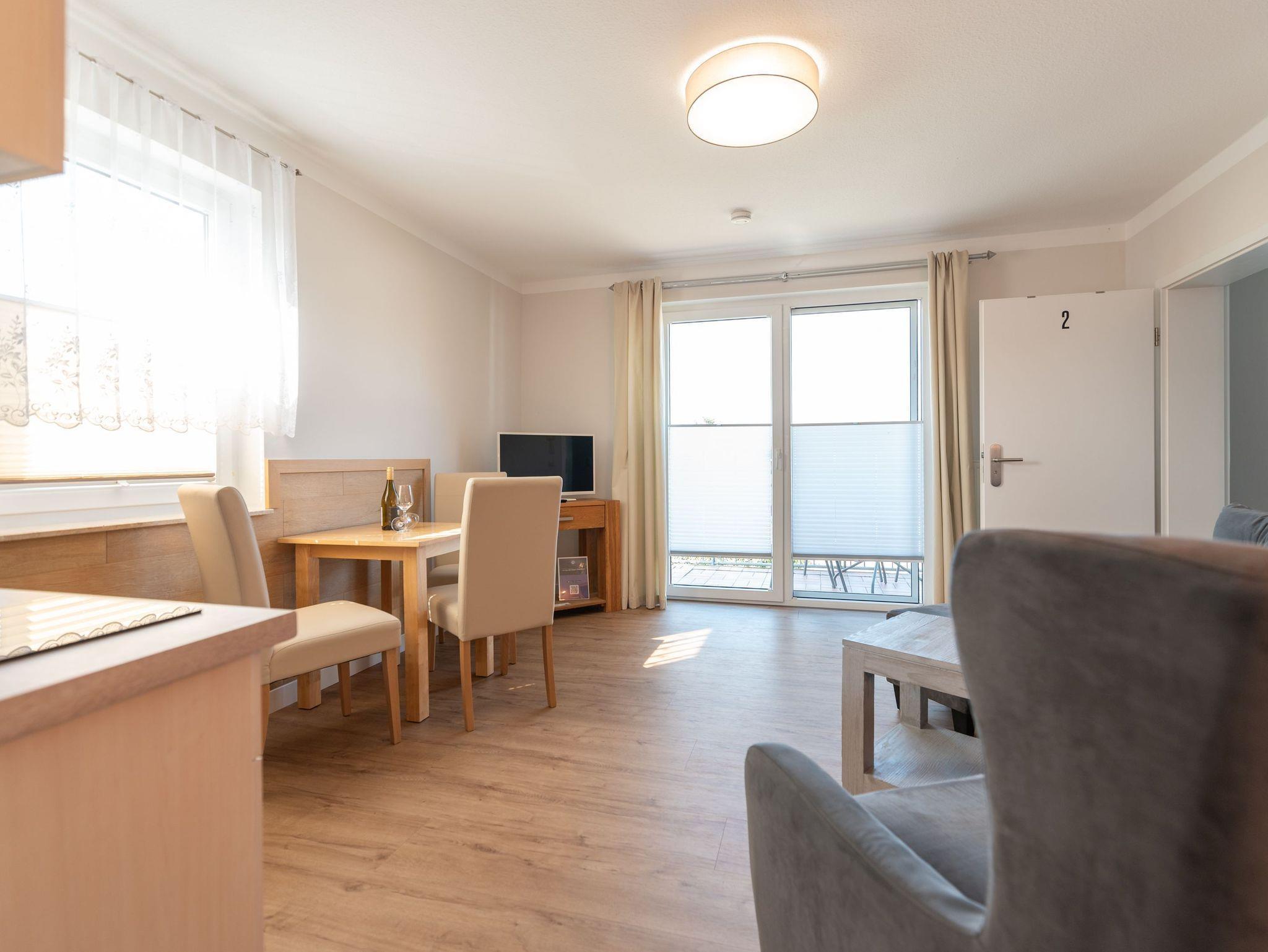 Die Wohnung verfügt über ein gemütliches Schlafzimmer, ein helles Wohnzimmer mit einer kleinen Küchenzeile inklusive Cerankochfeld und ein modernes Badezimmer. Von Ihrem Balkon aus können Sie die frische Luft und die Ruhe der Umgebung genießen.