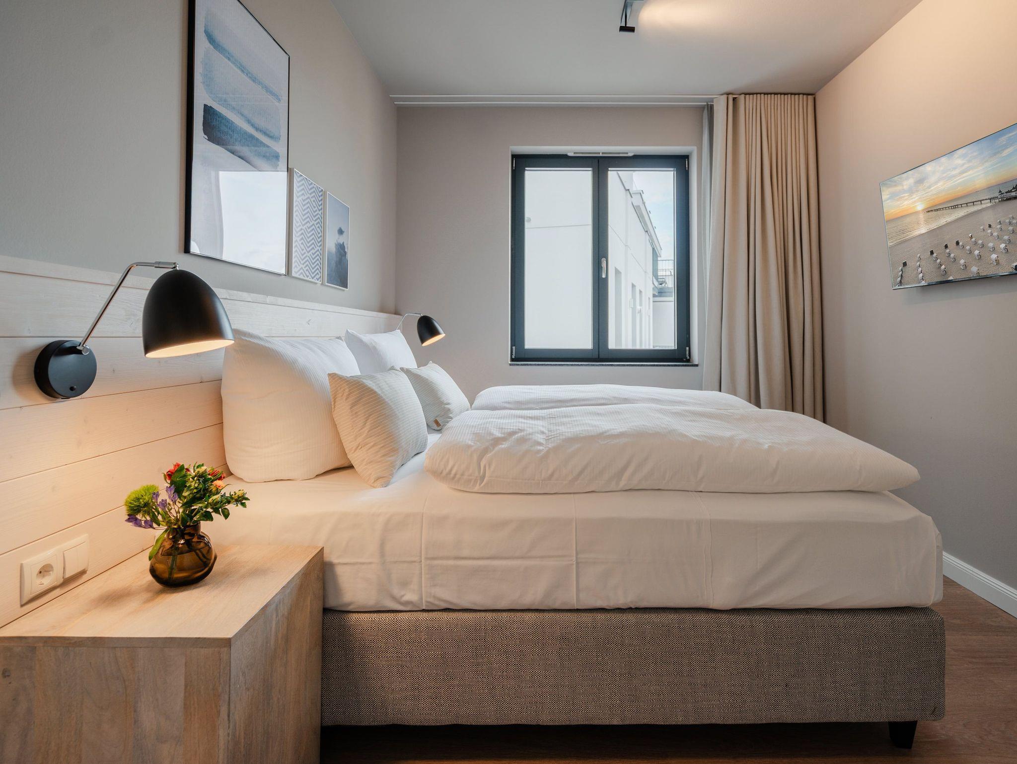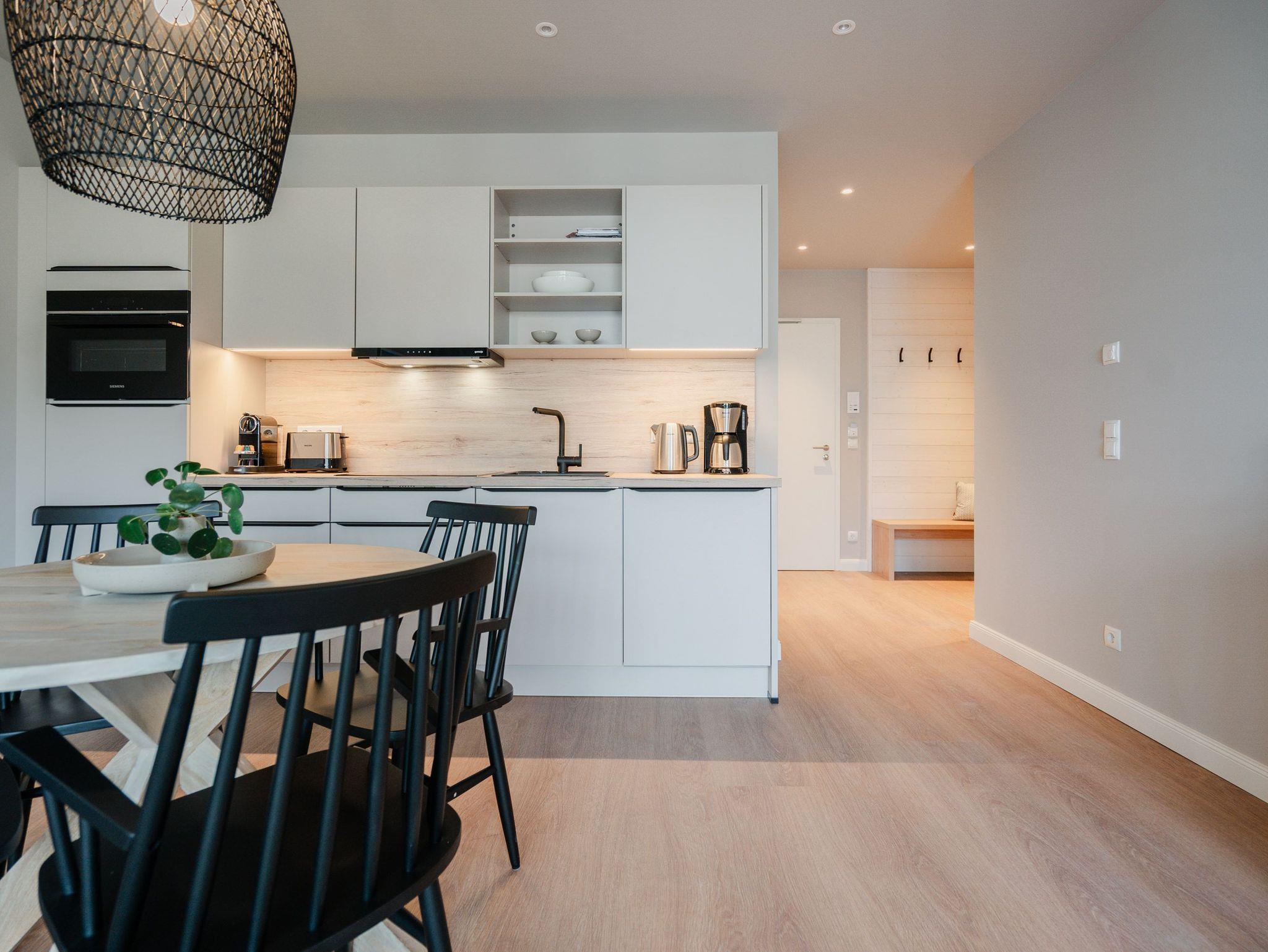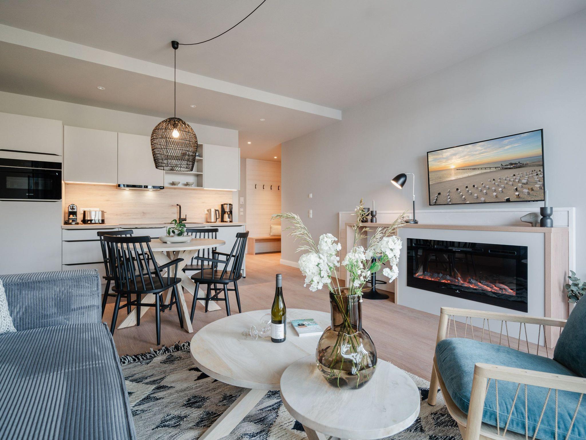 Drei Räume zum Verlieben bietet das Appartement B 2.2 in der 2. Etage der Strandterrasse. Helle, große Zimmer lassen viel Licht in dieses Auszeitparadies für bis zu 4 Personen. Die 76 Quadratmeter sind ein gemütliches und schickes Domizil, um gemeinsam mit der Familie oder mit Freunden eine unvergesslich schöne Zeit am Meer zu verbringen. Nordisches Design erwartet Sie im Wohn-Esszimmer und in den beiden Schlafzimmern. Dazu ist die Wohnung mit allen Annehmlichkeiten ausgestattet, die man für entspannte Tage brauchen kann. Die offene Küche verfügt über modernste Elektrogeräte wie einem Backofen , einen 4-Platten-Induktionsherd und eine Nespresso-Kapselmaschine. Ein gemütliches Wohnzimmer mit bequemem Sofa, Sessel und einem schönen, großen Esstisch sorgt für das ersehnte Urlaubsgefühl. Genießen Sie die Stunden vor dem Elektrokamin (ohne Wärmeabgabe) oder auf dem Balkon, der einen herrlichen, seitlichen Ausblick auf die Ostsee und auf die Seebrücke Ahlbeck gewährt. Was will man mehr. Ein Gartentisch mit Stühlen erlaubt sogar das Essen unter freiem Himmel. Die Süd-Ost-Ausrichtung ist perfekt für sonnige Frühstücke. Ein großer Flat-TV (50 Zoll) sorgt im Wohnzimmer für spannende Heimkinoabende. Zwei Schlafzimmer gibt es in dieser tollen Wohnung. Das erste Schlafzimmer verfügt über ein komfortables Boxspringdoppelbett (1,80m x 2,00m), einen Kleiderschrank, einen Flat-TV (43 Zoll) und den Zugang zu einem zweiten Balkon mit Gartenliege. Von hier aus können Sie auf die belebte Promenade von Ahlbeck und die dahinter liegende Ostsee schauen. Nur 80 Meter ist sie von Ihrem Domizil entfernt. Das zweite Schlafzimmer bietet ebenfalls ein Boxspringdoppelbett und einen Kleiderschrank sowie einen Flat-TV (32 Zoll). Die beiden Bäder sind mit Dusche, Waschtisch und WC ausgestattet. Sie lieben kuschelige Wärme? Dann entspannen Sie doch in der Infrarotsaunakabine, die in eines der beiden Bäder eingebaut ist. Alles ist da, damit Sie sich rundum wohlfühlen können. Sie brauchen also nur noch ankommen, Ihr Auto in der Tiefgarage auf Ihrem PKW-Stellplatz parken und schon kann die wundervolle Ostseeauszeit beginnen.
