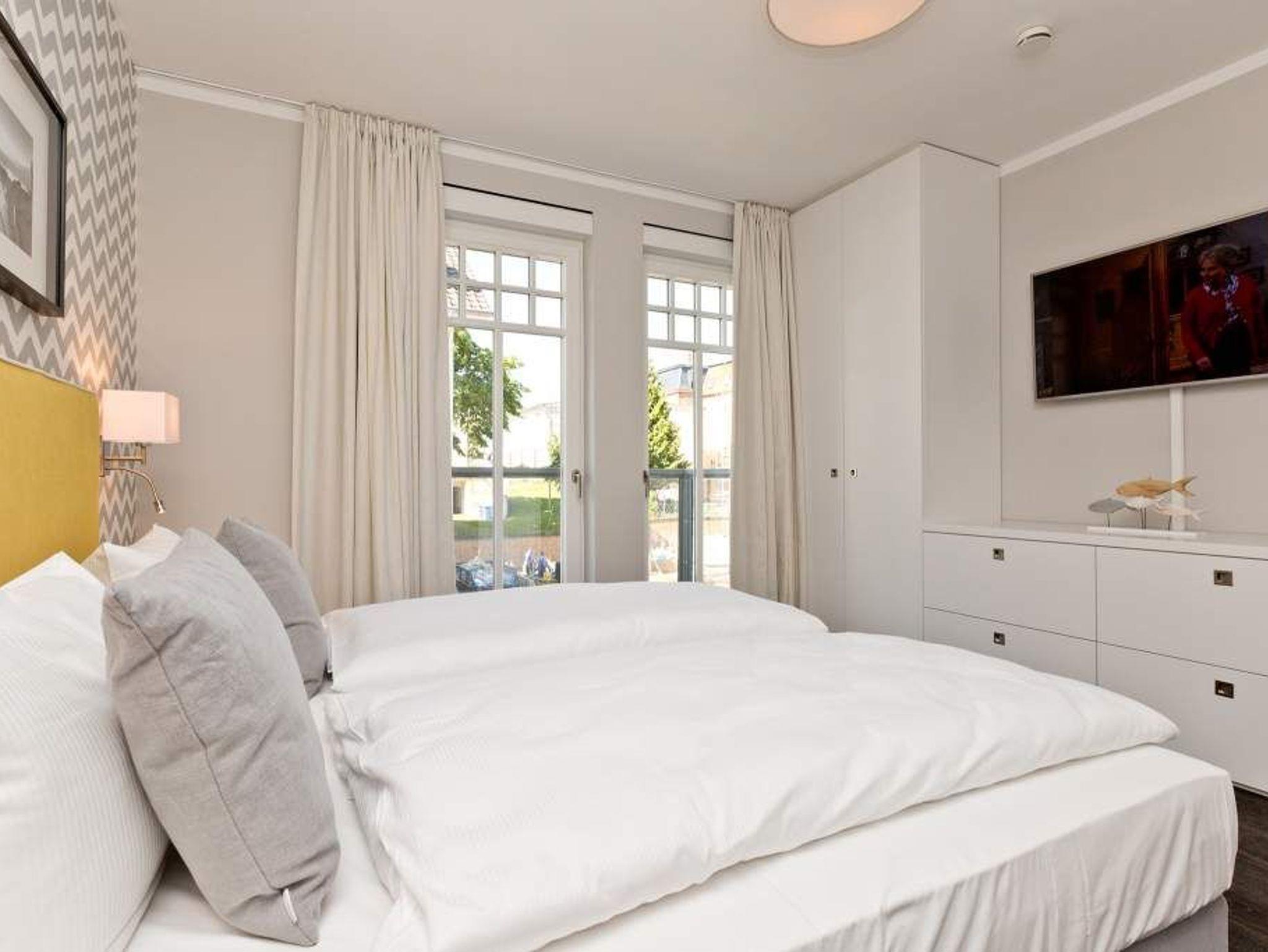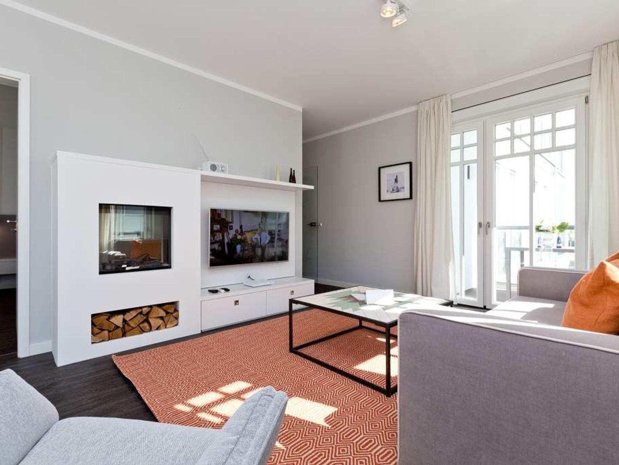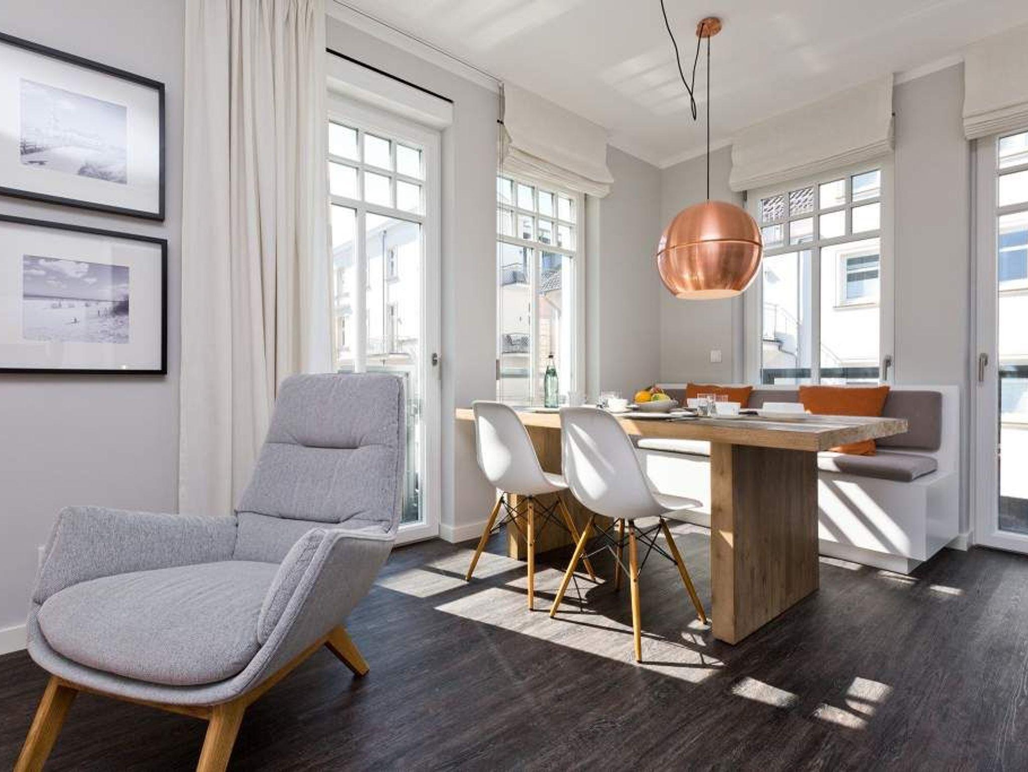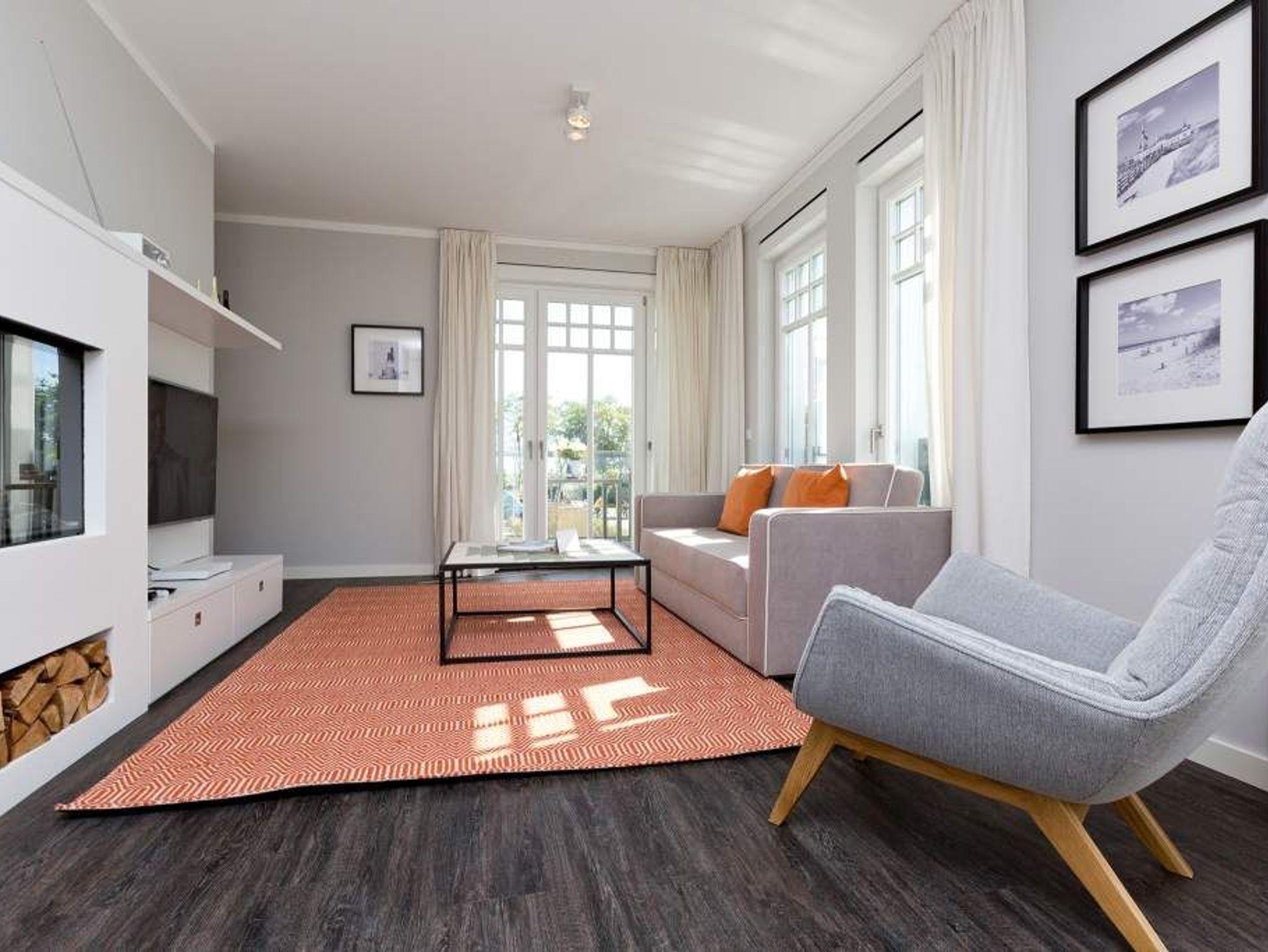Absolut stylisch ist diese wunderschön eingerichtete Ferienwohnung für 4 Personen im ersten Obergeschoss der Villa Westend. Das 3-Raum-Appartement bietet auf 85 Quadratmetern Urlaubsfeeling der Extraklasse. Der hochwertige Vinylboden in Holzoptik ist besonders geräuscharm und allergikerfreundlich. Schlichte Eleganz durchzieht die Wohnung vom Couchtisch über den gemütlichen Sessel und die Retro-Schalenstühlen des Essbereiches bis hin zu den Lampen. Viel Holz, Licht, das durch große, bodentiefe Fenster hereinfällt und klare Formen ? sie sind das Markenzeichen skandinavischer Möbeldesigner. Der Elektro-Kamin ist ein echtes Highlight. Harmonisch fügt sich die offene Küche, ganz in Weiß gehalten, in die Gesamteinrichtung ein. Die Wohnung hat zwei Balkone, von denen einer seitlich den Blick auf die Ostsee freigibt. Jedes der beiden Schlafzimmer ist anders gestaltet ? jedes auf seine Art mit grafischen Design-Mustertapeten, harmonischen Farben und hochwertigen Boxspringdoppelbetten geschmackvoll und komfortabel eingerichtet. Im Masterbad ist eine finnische Sauna eingebaut. Die Duschen in den Bädern sind so geräumig, dass Sie sie gut zu Zweit genießen können. Für Ihren uneingeschränkten Komfort sind die Betten bezogen und Handtücher liegen bereit. Es steht Ihnen der Stellplatz 37 in der Tiefgarage zur Verfügung.
