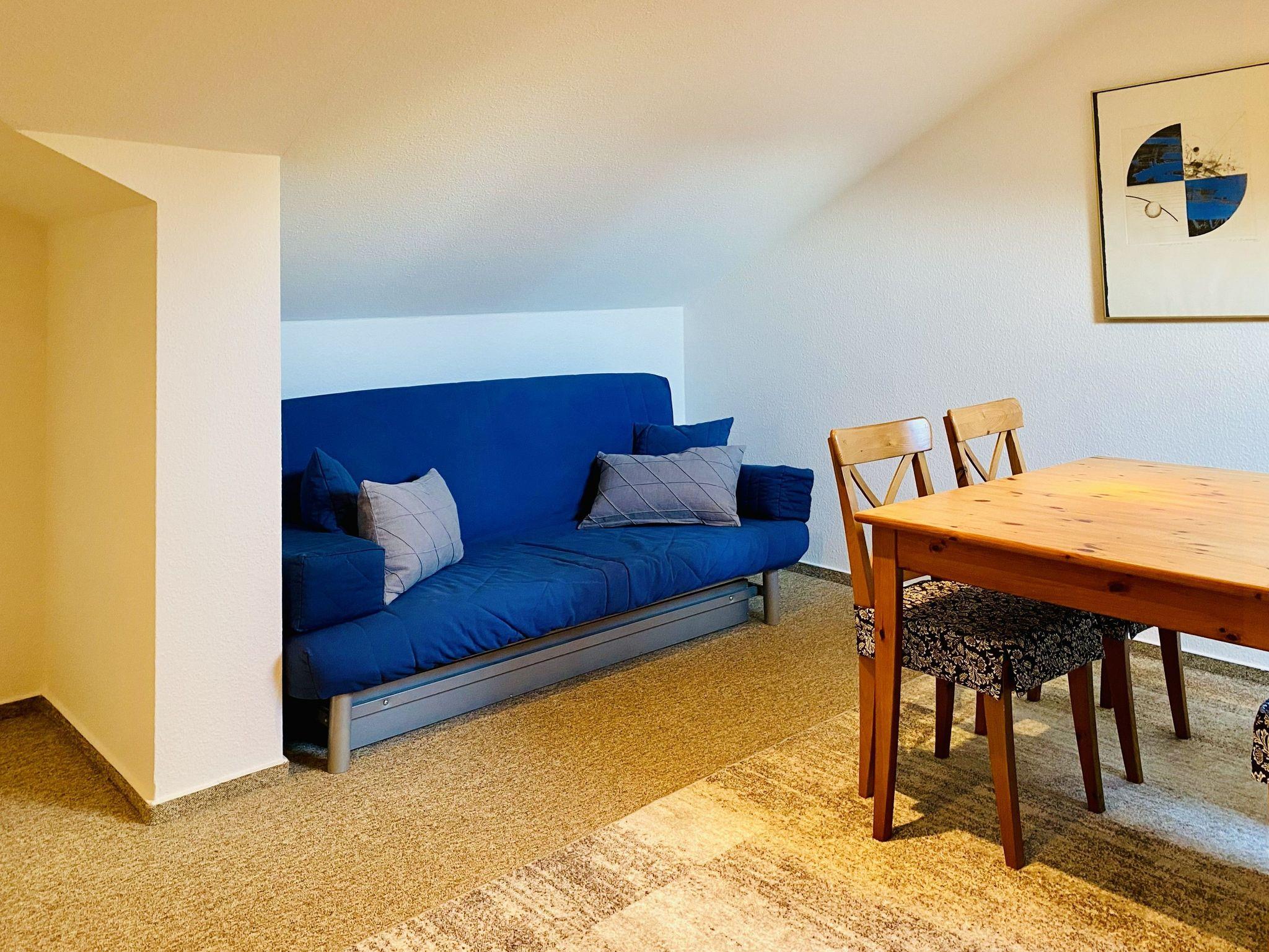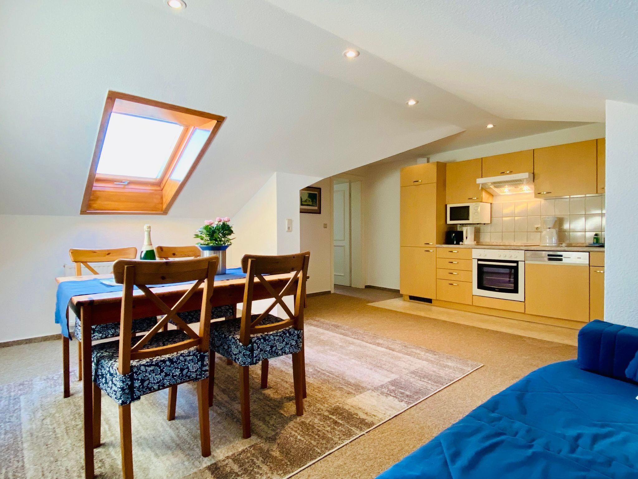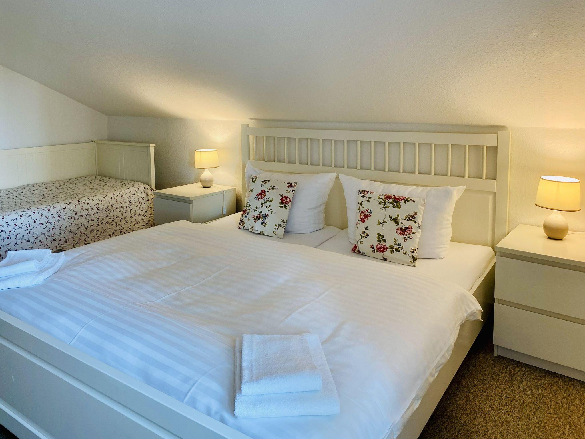 Genießen Sie Ihren Urlaub in dieser schönen 2-Raumwohnung unterm Dach. Das Wohnzimmer bietet durch eine funktionale Aufteilung von Wohn- Küchenbereich genug Platz für die gesamte Familie. In der Küche stehen Geschirrspüler, Backofen/Herd, Mikrowelle, ein Kühlschrank mit Gefrierteil sowie einen Esstisch zur Verfügung. Zur Wohnung gehört ein Schlafzimmer mit Doppelbett sowie eine Einzelbett. Das Badezimmer ist mit einer Dusche ausgestattet.