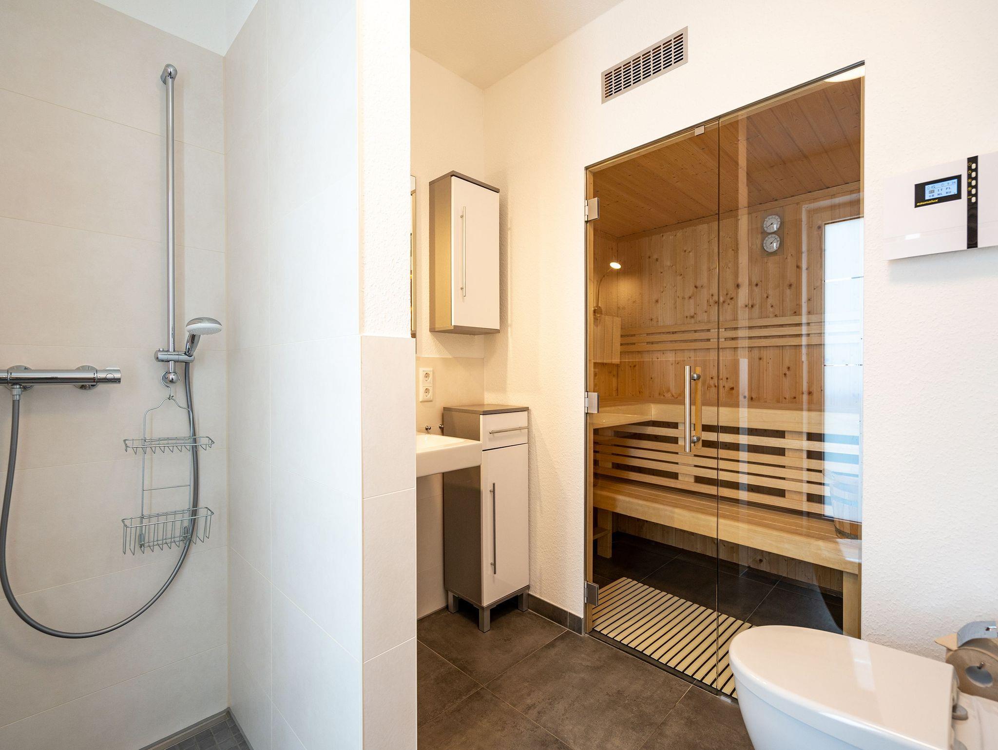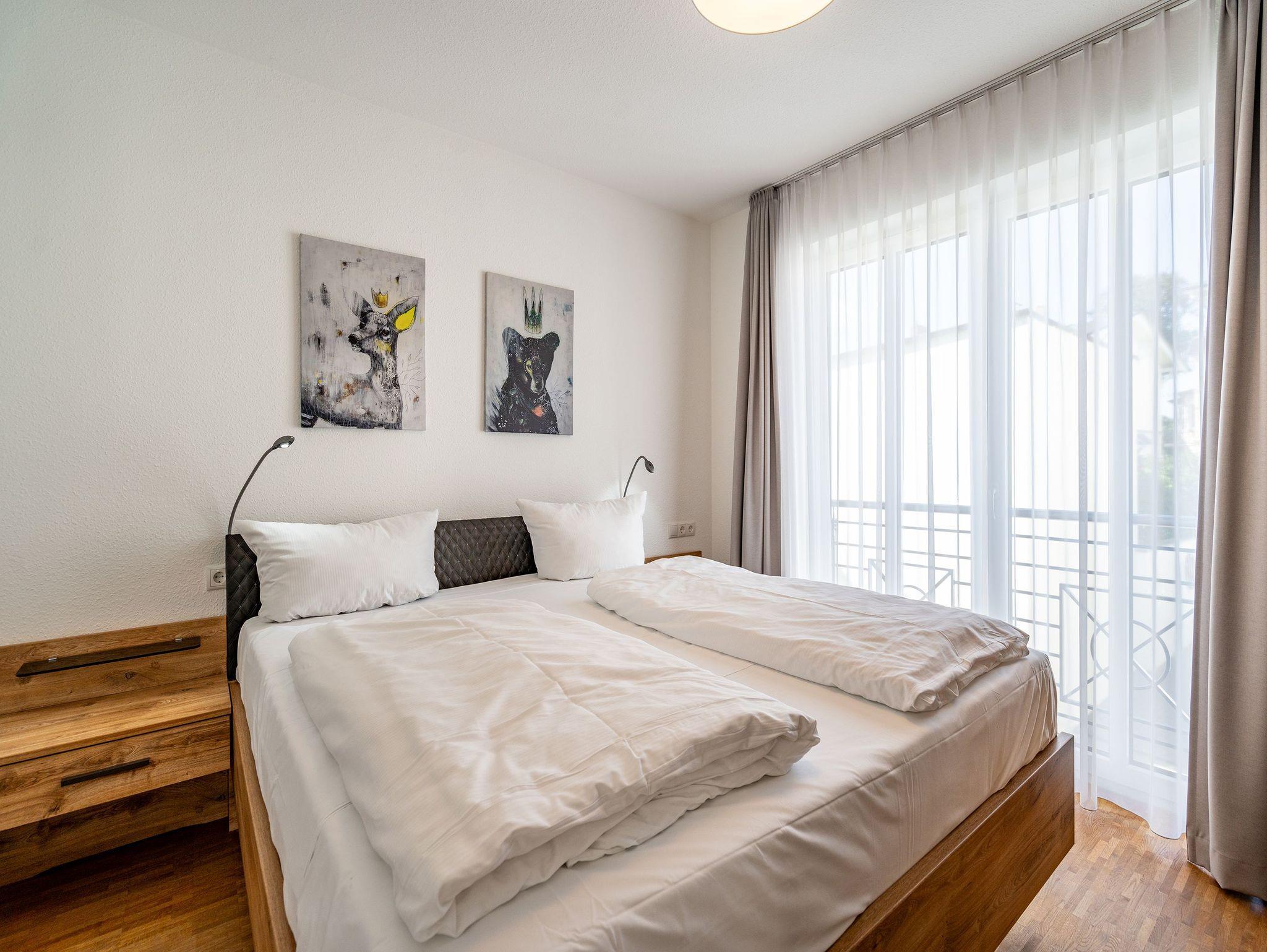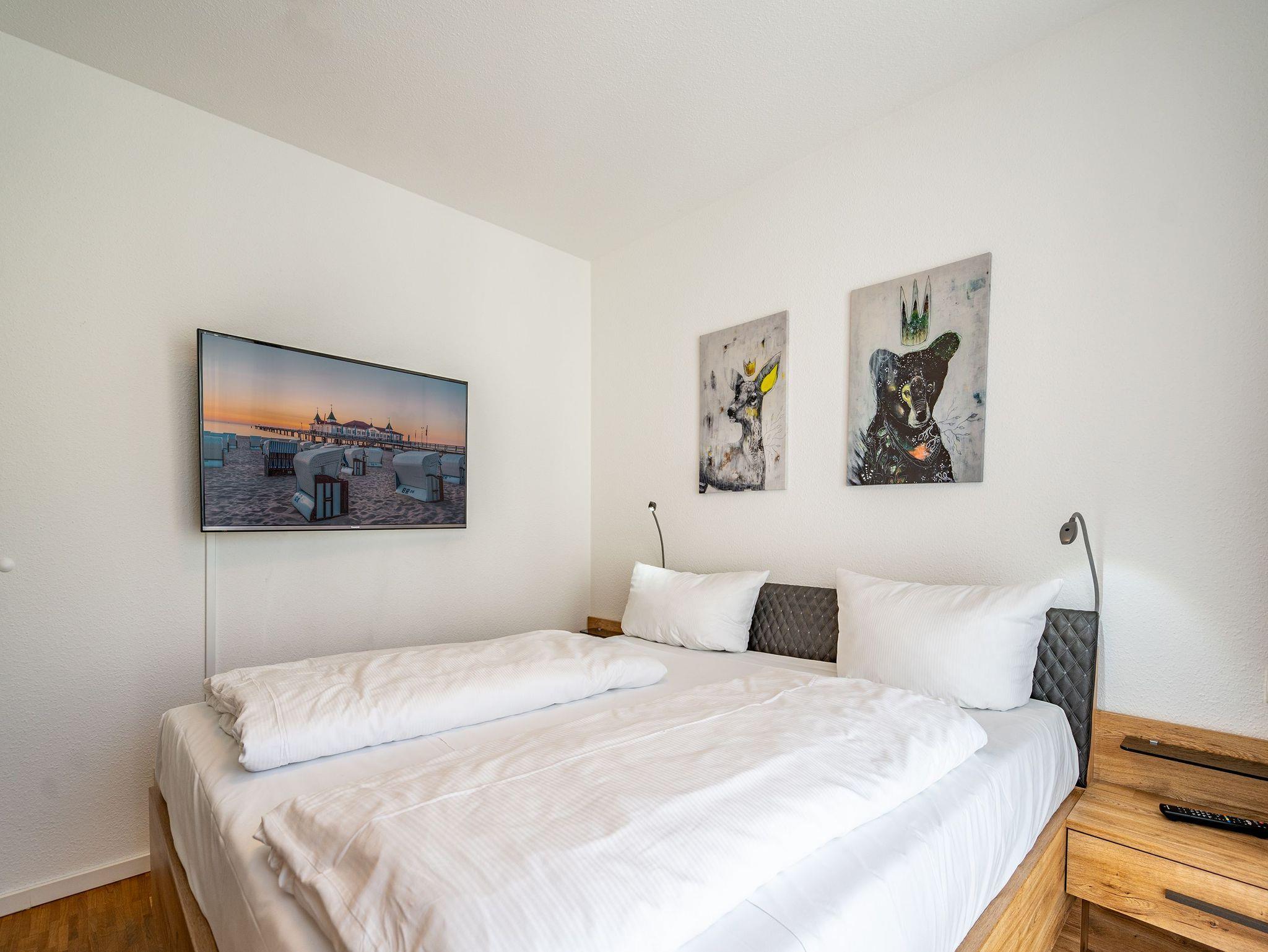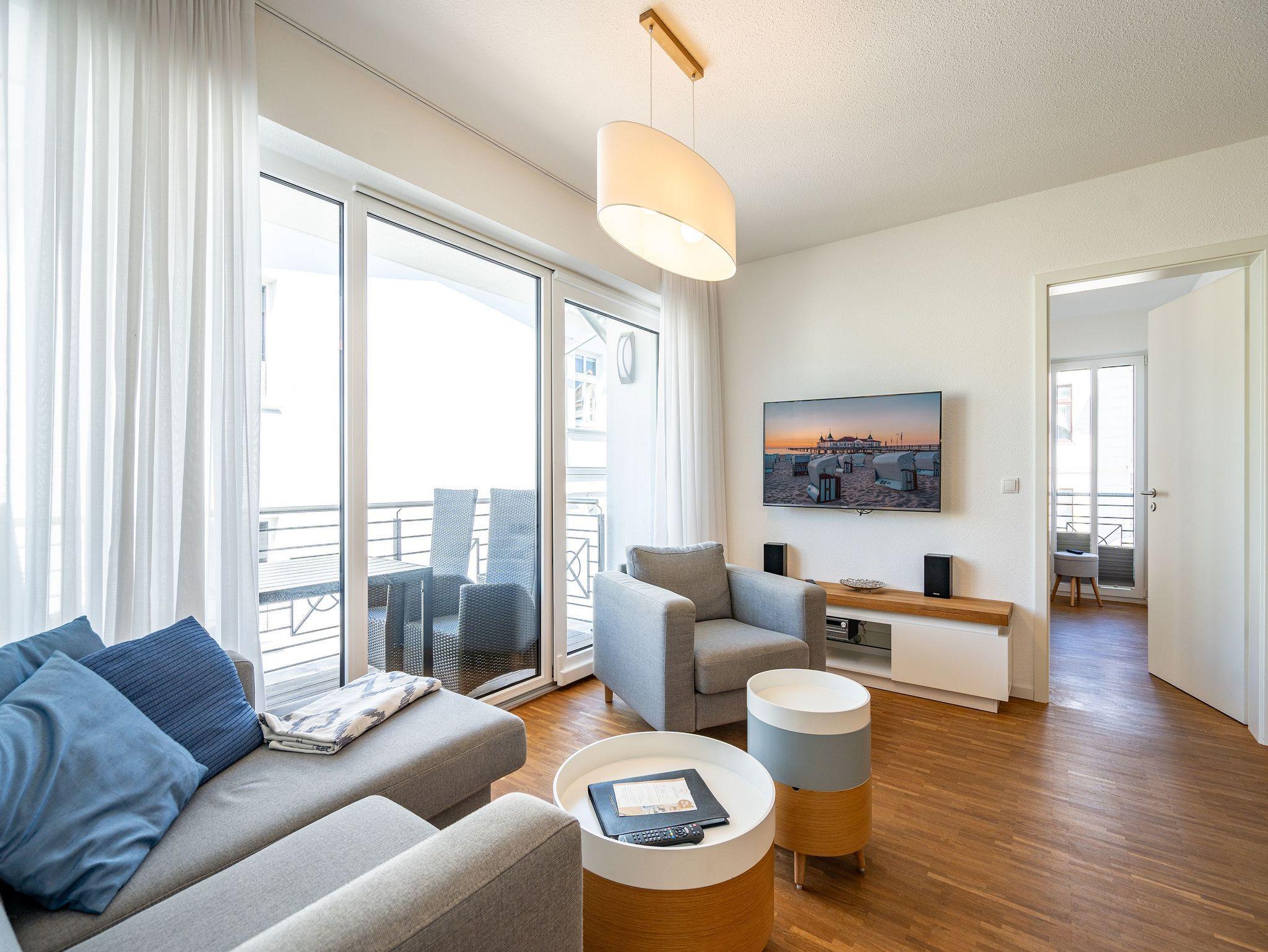 Helle Räume, ein natürliches Mobiliar und eine gemütliche Atmosphäre erwarten Sie in diesem 76qm großen Urlaubsdomizil in Seebad Ahlbeck. Das 3-Zimmer-Appartement im 1. Obergeschoss bietet ausreichend Platz für bis zu 4 Personen. Ob als Familie und Urlaub mit Freunden - hier fühlen sich alle rundum wohl! Der offen gestaltete Wohn-Ess-Bereich verfügt neben einer bequemen Sofalandschaft mit Sessel über einen 32-Zoll Flat-TV und ein Radio mit CD-Player. Die moderne Küche mit Ceranfeld, Backofen, Kühlschrank mit Gefrierfach, Geschirrspüler und Kleinküchengeräten lässt beim Zubereiten Ihrer Speisen keine Wünsche offen. Genießen Sie Ihre Mahlzeiten am Esstisch im skandinavischen Stil oder frühstücken Sie auf dem ca. 5qm großen Süd-West-Balkon direkt gegenüber. Auf Schlafkomfort müssen Sie auch in Ihrem Urlaub in den beiden Schlafzimmern nicht verzichten, die mit bequemen Boxspringbetten (1,80 m x 2,00 m), Flat-TVs und ausreichend Schrankraum für Ihre Urlaubsgarderobe ausgestattet sind. Vor allem befreundete Paare kommen in diesem Appartement in den Luxus zwei getrennter Badezimmer, die jeweils mit Dusche, Waschtisch und WC ausgestattet sind. In einem der beiden Badezimmer befindet sich darüber hinaus eine finnische Sauna, die vor allem an kalten Wintertagen wohlige Entspannung für bis zu 4 Personen verspricht. Ein Waschtrockner im Hauswirtschaftsraum, kostenfreies WLAN und ein Pkw-Stellplatz in der hauseigenen Tiefgarage runden Ihren Usedom-Urlaub ab!