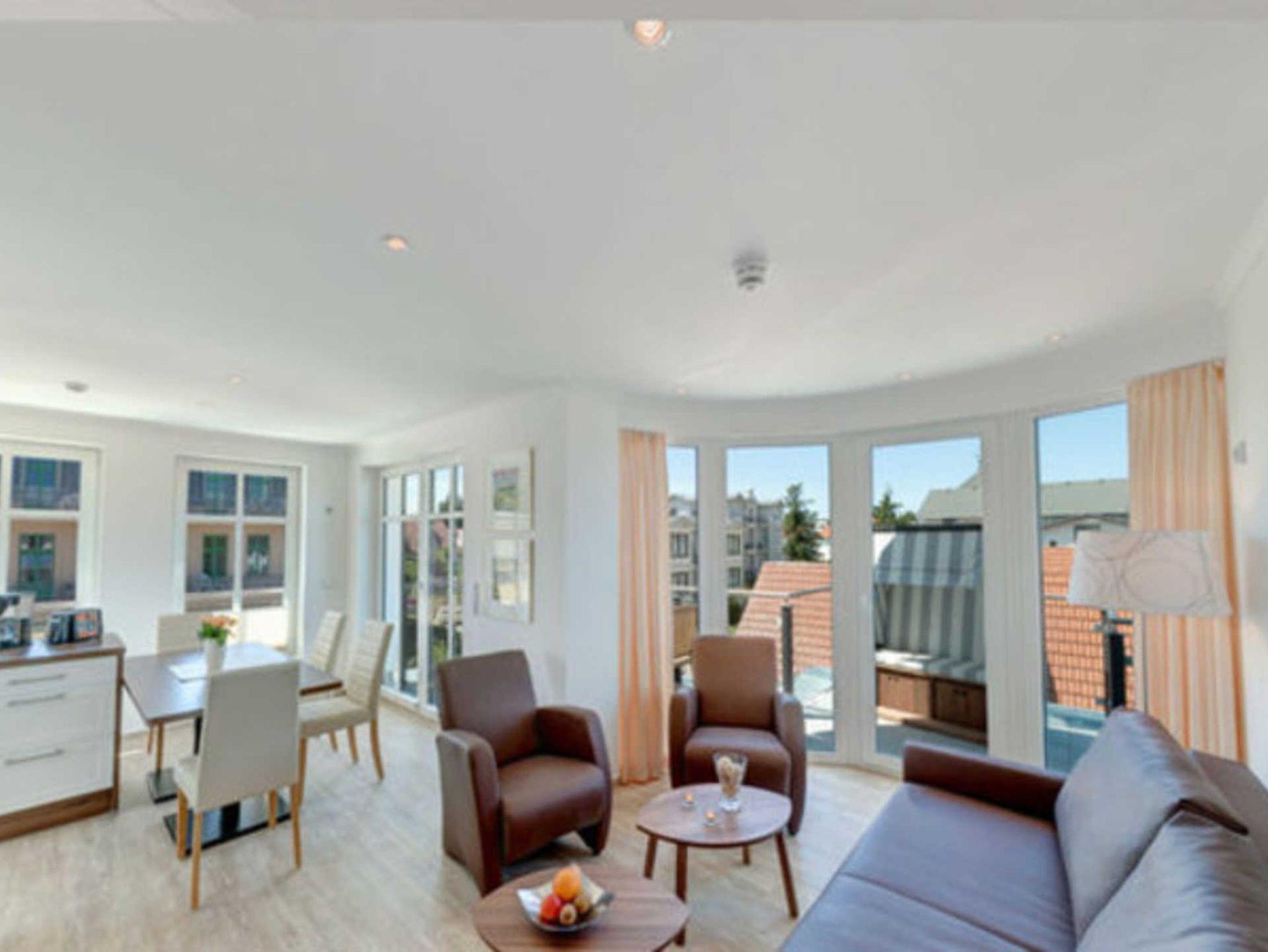 SEEBLICK! MODERN und mit 2 DACHTERRASSEN, FAHRSTUHL, nur ca. 100 m zur Strandpromenade! Komfortabel eingerichtete 3 - Zimmer - Wohnung mit sehr guter Ausstattung! 2 separate Schlafzimmer, 2 Bäder (1 Dusch- und Wannenbad ensuite, 1 Duschbad) , Wohnbereich, Küchen- und Eßbereich, 2 möblierte Dachterrassen mit je 22 qm Fläche, eine davon mit eigenem STRANDKORB, KAMINOFEN, FUßBODENHEIZUNG. Die Wohnung nimmt das gesamte Dachgeschoß des vorderen Hausteils ein. Die Wohnung verfügt über einen Pkw-Stellplatz in der hauseigenen Tiefgarage. Fahrradabstellfläche ist vorhanden. Vom Haus aus können Sie das Ortszentrum und die bekannte Ahlbecker Seebrücke in ca. 2 Minuten zu Fuß erreichen.
