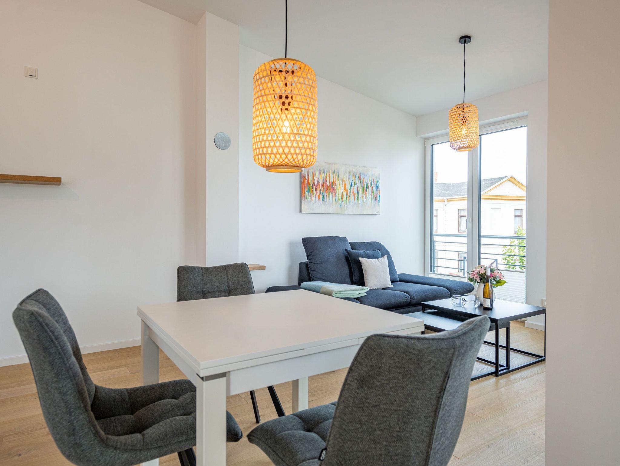 Herzlich willkommen im 2-Raum-Appartement Nr. 10 im Quartier 6, gelegen im 2. Obergeschoss. Dieses stilvolle Ferienapartment bietet Ihnen einen offenen, lichtdurchfluteten Wohnbereich, der mit einer voll ausgestatteten Küchenzeile inklusive Backofen mit Mikrowellenfunktion und Induktionskochfeld aufwartet. Hier können Sie Ihre Lieblingsgerichte zubereiten und diese am Essplatz genießen. Der Wohnbereich lädt mit einer komfortablen Sitzgruppe und einem 55 Zoll Smart-TV zu entspannten Abenden ein. Von hier aus gelangen Sie auf die Dachterrasse, die mit hochwertiger Teakholz-Bestuhlung ausgestattet ist und Ihnen einen herrlichen Blick Richtung Ostsee bietet. Im separaten Schlafzimmer erwartet Sie ein komfortables Doppelbett (1,80m x 2,00m) sowie ein geräumiger Kleiderschrank. Für zusätzliche Unterhaltung sorgt ein weiterer Smart-TV mit einer Bildschirmdiagonale von 43 Zoll. Der Wohn- und Schlafbereich ist mit edlem Echtholzfußboden ausgestattet, der für eine warme und einladende Atmosphäre sorgt. Das moderne Bad verfügt über eine ebenerdige Dusche, ein Waschbecken und ein WC, sodass Sie sich hier rundum wohlfühlen können. Selbstverständlich steht Ihnen während Ihres Aufenthalts kostenfreies WLAN zur Verfügung. Zu der Wohnung gehört ein eigener Stellplatz in der Tiefgarage sowie ein abschließbarer Fahrradkeller, der Ihnen zusätzlichen Komfort bietet. Diese Ferienwohnung ist der ideale Ort, um die Ostsee in vollen Zügen zu genießen und die Seele baumeln zu lassen.